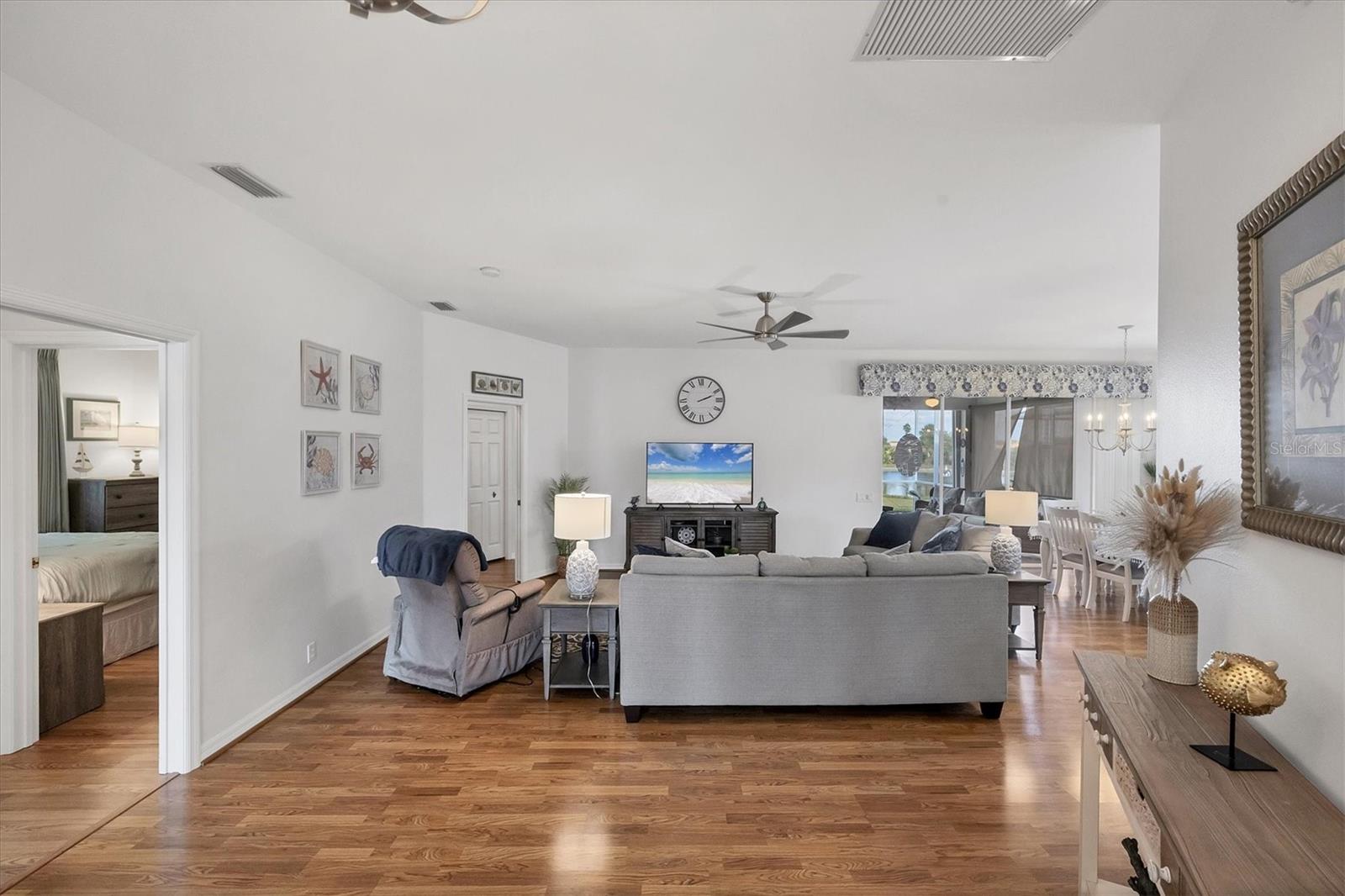 WALK THIS WAY!! Don't miss out on this STUNNING property! Located in the extremely popular community of Pelican Pointe, this home is JUST RIGHT. NEW ROOF AND GUTTERS. HURRICANE IMPACT WINDOWS. Surrounded by tropical landscaping, you will walk up to the screened front porch and enter through the leaded glass front door accompanied by side glass panels that lets the sunshine flow into the home. Inside you will find an open floor plan designed with a beach cottage casual elegance. Kitchen, living room, and eating area allow for ease of movement, functionality, and comfort. Great space for entertaining too. Especially when you consider the EXTRA LARGE LANAI with pocket sliding doors that open up to include the entire outdoor space for your guests to roam. Lanai is very private with options to be under cover or out in the sun. Peaceful LAKE VIEW for relaxing and enjoying the Florida outdoors. HURRICANE SHUTTERS allow you to leave the furniture in place instead of hauling to the garage. Back in side you will find a BEAUTIFULLY UPDATED kitchen. QUARTZ countertops, STAINLESS STEEL appliances, FARMERS SINK with Extended sprayer. WINE/DRINK REFRIGERATOR. Luxury Vinyl floors throughout main areas and bedrooms with Ceramic Tile in Wet areas. NO CARPETS. PLANTATION SHUTTERS COVER ALL THE WINDOWS. Master Bedroom offers sliders to lanai and en suite bath. Dual sinks and walk in shower. UPDATED FIXTURES. TWO guest bedrooms with updated bath in between. Pocket door closes this off and could be a suite. Laundry room with newer washer/dryer. THIS IS A MUST SEE! Pelican Pointe is Venice's premier community with resort style amenities- Clubhouse with restaurant/bar/grill, heated pool, fitness center, tennis courts, pickle ball, tons of social activities, social room/library, 27 holes of golf and pro shop. Huge and very active Women's Association with tons of activities to choose from. Golf membership is NOT mandatory. LOW HOA fees. All centrally located minutes to Venice Beach, Venice Downtown, shopping, theatres, restaurants, highways, airports, and so much more. Come find your Florida Lifestyle today!