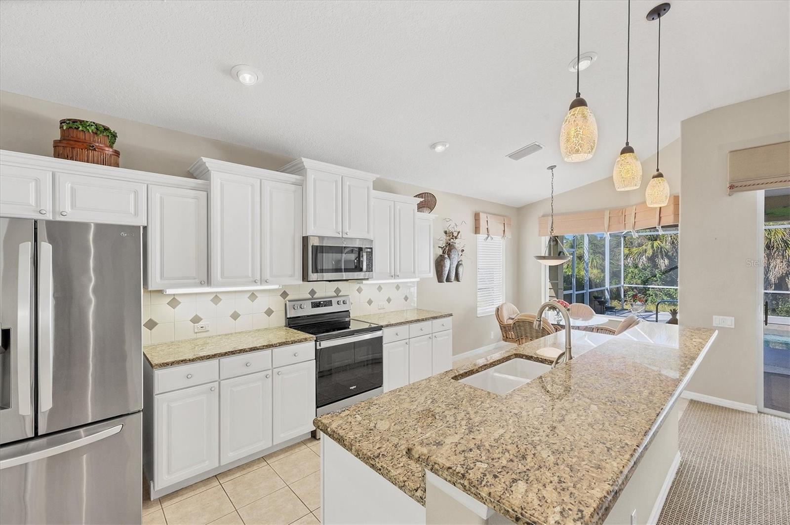 LOOK NOW!! This sought after San Marco floor plan won't last long. LOCATION, LOCATION. Homes sits at the end of a CUL DE SAC, for the ultimate in PEACE AND QUIET. No drive through traffic. Offering 2BD/2BA/DEN/2CG this Open floor plan with high ceilings makes this SPACIOUS home feel even grander. Living room, kitchen, breakfast nook, and dining room meld together for multi-functionality and comfortable elegance. A casual night at home or the party of the year. Kitchen has been updated with GRANITE Counters, STAINLESS STEEL Appliances, BACKSPLASH. UPDATED FIXTURES, AND PENDANT LIGHTS. Breakfast nook offers AQUARIUM WINDOW for your viewing pleasure of the tranquil preserve and it's plethora of wildlife. Sit on your VERY PRIVATE lanai and enjoy the quiet peacefulness the preserve provides. Only nature calling here. You also have your own PRIVATE POOL to relax in and enjoy the Florida weather. SOLAR PANELS on the roof for heating the pool uses natural resources and saves on the electric bill. Back inside your own SEPARATE DEN with FRENCH DOORS allows for a variety of uses- Office, Den, makeshift Third bedroom, whatever you want. The GORGEOUS leaded glass window with etched design is a pure delight. Especially when the sun shines though. Master bedroom has en suite bath offering dual sinks, walk in shower, and garden tub. Large walk in closet. Pocket sliders go to the lanai letting the fresh air in on those pleasant days or just stepping out to take a dip in the pool. OVERSIZED Guest bedroom at other end of the home for privacy. Pocket door can close it off creating its own suite also. FURNITURE IS AVAILABLE SEPARATELY. NEW GARAGE DOOR. WATER HEATER 2.5 YRS OLD. Property has been REPLUMBED. Pelican Pointe is Venice's premier community with resort style amenities- Clubhouse with restaurant/bar/grill, heated pool, fitness center, tennis courts, pickle ball, tons of social activities, social room/library, 27 holes of golf and pro shop. Huge and very active Women's Association with tons of activities to choose from. Golf membership is NOT mandatory. LOW HOA fees. All centrally located minutes to Venice Beach, Venice Downtown, shopping, theatres, restaurants, highways, airports, and so much more. Come find your Florida Lifestyle today!Pelican Pointe is Venice's premier community with resort style amenities- Clubhouse with restaurant/bar/grill, heated pool, fitness center, tennis courts, pickle ball, tons of social activities, social room/library, 27 holes of golf and pro shop. Huge and very active Women's Association with tons of activities to choose from. Golf membership is NOT mandatory. LOW HOA fees. All centrally located minutes to Venice Beach, Venice Downtown, shopping, theatres, restaurants, highways, airports, and so much more. Come find your Florida Lifestyle today!