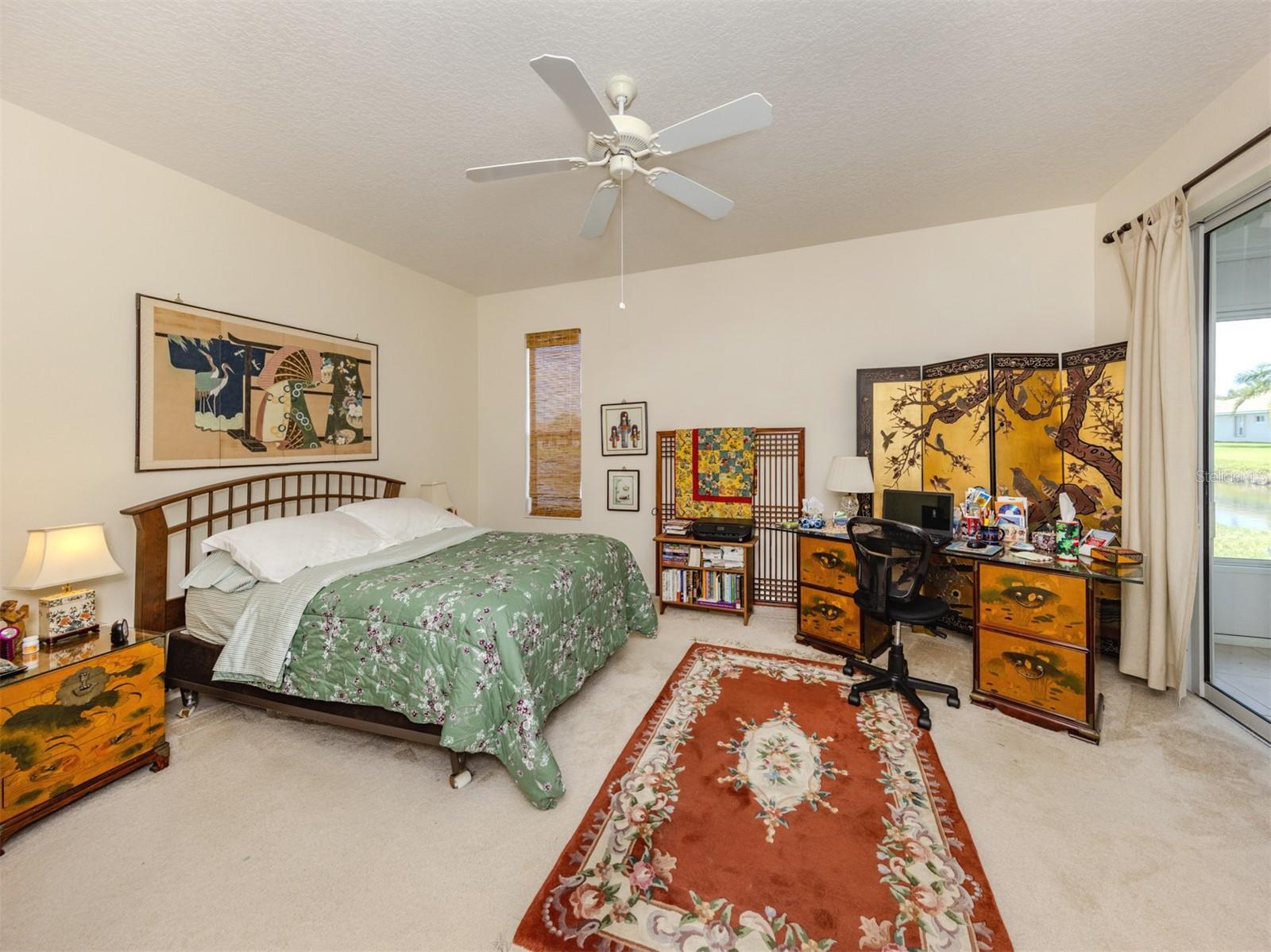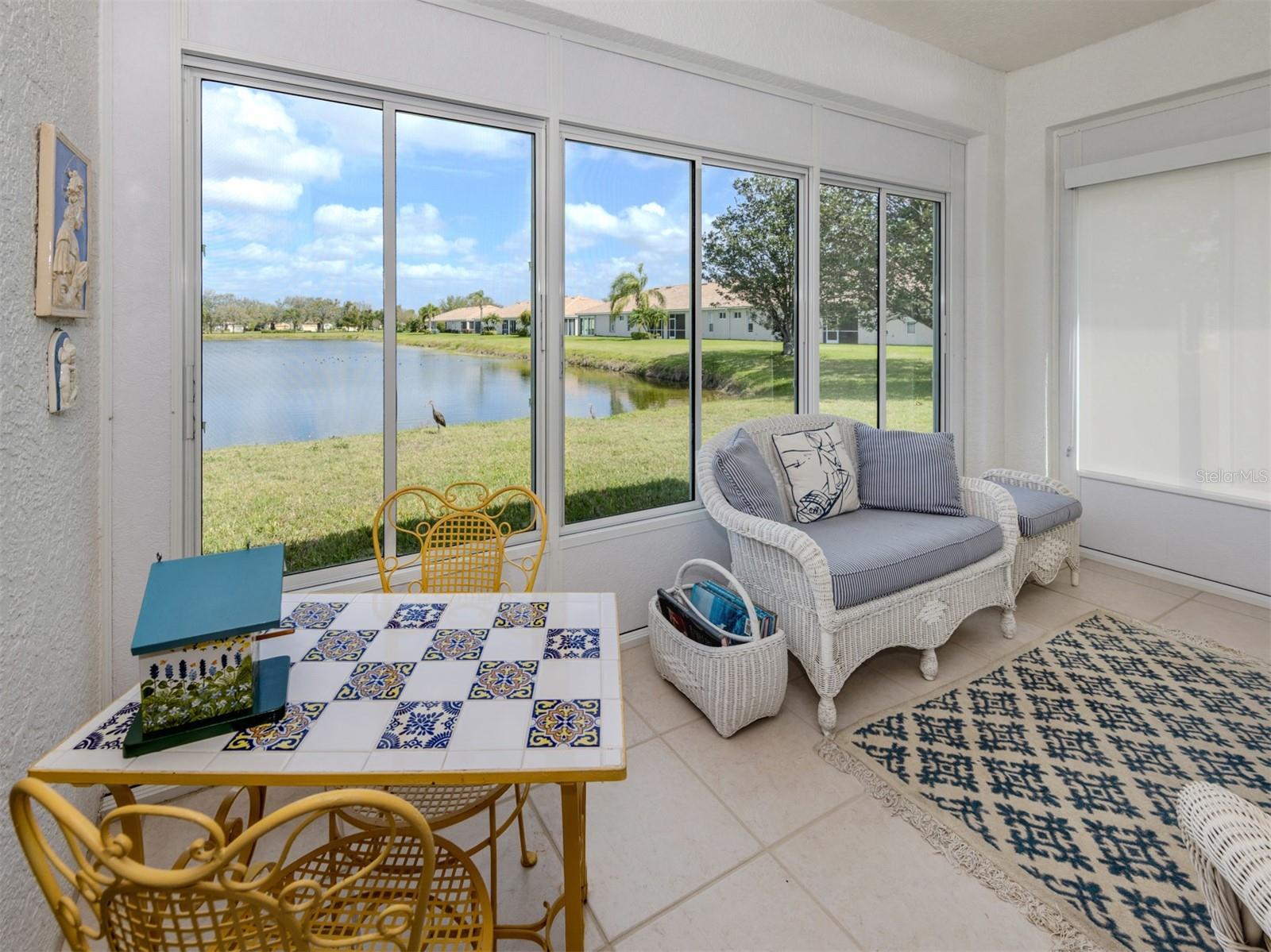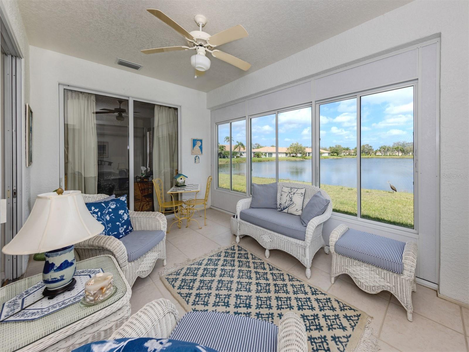Charming WATERFRONT villa in Lakeridge Falls, a Sarasota Gem! This end unit, 2 bedroom plus den home boasts extra square footage with the enclosed lanai space with hurricane windows AND fully air conditioned. The beautiful full lake view offers lots of nature and tranquility. Tile flooring in the main areas of the home give the home spaciousness and easy maintenance. The primary bedroom features an updated en-suite bath and walk-in closet. The second bedroom and guest bath are at the front of the home- offering privacy for guests. The kitchen has a convenient pass through window and breakfast area. The community of Lakeridge Falls offers a large range of amenities. The recreation and social center features a clubhouse which recently underwent a major renovation. The grand salon has been enlarged to accommodate large gatherings and meetings. The fitness center is located in a large space in the clubhouse. Immediately adjacent to the clubhouse is the pool annex building which now contains two billiards tables, a library and two computer stations with free Wi-Fi. Our outdoor amenities include a heated resort-style pool, spa, and two bocce ball courts. Our activities include a variety of card games like mahjong, poker, and bridge, bingo nights. Other activities include bocce, table tennis, yoga/stretch classes, as well as, water aerobics. There is even their own lakeside beach! The location is perfect! Close to dining, restaurants, SRQ and the University shopping complex and the expansive Mote Marine Aquarium. So convenient to SRQ.