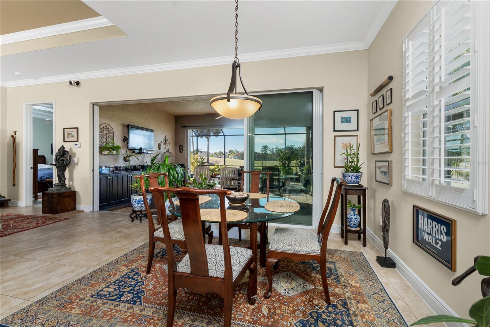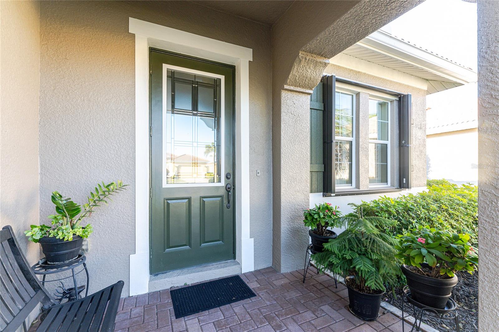 Exterior: Hurricane Shutters, Lighting, Outdoor Kitchen, Rain Gutters, Sidewalk, Sliding Doors