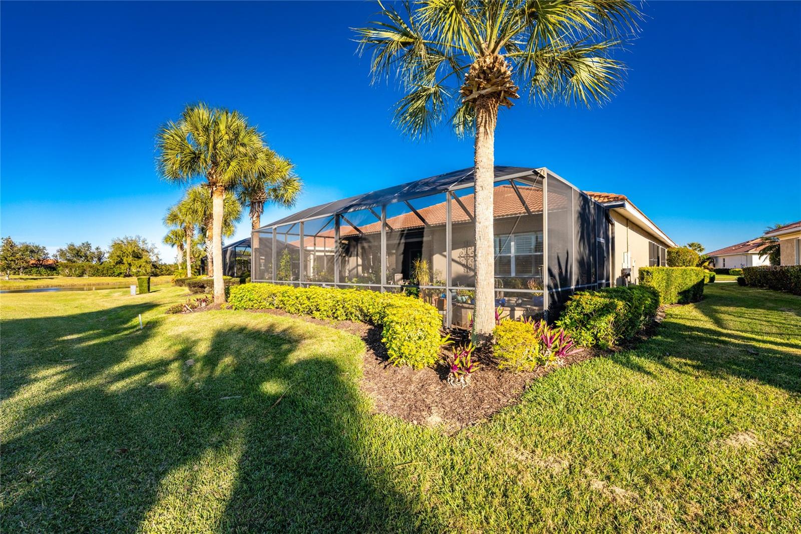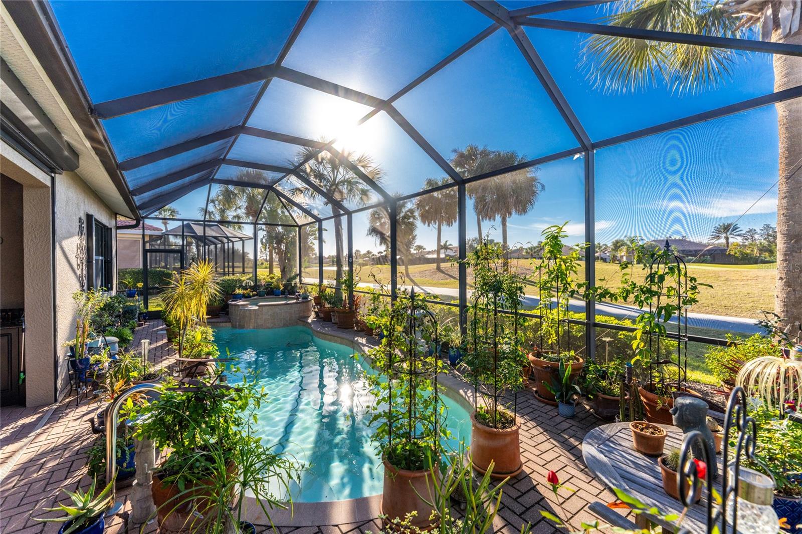 Lush Fairways Views and Your Own Private Poolside Oasis! SPECTACULAR WCI built Florencia MAINTENANCE FREE model with SALTWATER POOL & SPA on a PREMIUM GOLF COURSE LOT! The home is anchored by a large, sun-drenched great room featuring elegant tray ceilings, creating an airy and sophisticated atmosphere for both relaxation and entertaining. This central living space opens through expansive sliding glass doors that blend the indoors with a magnificent screened lanai, where a shimmering pool and integrated spa serve as your private sanctuary. From this vantage point, you can enjoy breathtaking views of the western sunsets, the rolling greens of the golf course, and the tranquil, shimmering water. An open kitchen make this home great to entertain in with granite counters, lots of counter space, a breakfast bar, lovely cabinetry and a cafe style dining area plus you have a formal dining area. This meticulously maintained residence offers three spacious bedrooms with brand-new flooring for a fresh look and a two-car garage. The split-bedroom layout ensures maximum privacy, especially in the primary suite, which boasts a custom-designed closet and a beautifully remodeled shower. Fortified with hurricane accordion shutters this home prioritizes both luxury and peace of mind. Life is effortless here, as the HOA-covered social membership grants you access to resort-style dining, fitness centers, 2 pools including a pool side Tiki bar, tennis, pickle ball and a scenic Myakka River boardwalk--all just minutes from the historic charm of Venice Island and the white sands of Nokomis Beach plus easy access to medical facilities, shopping and Sarasota.
