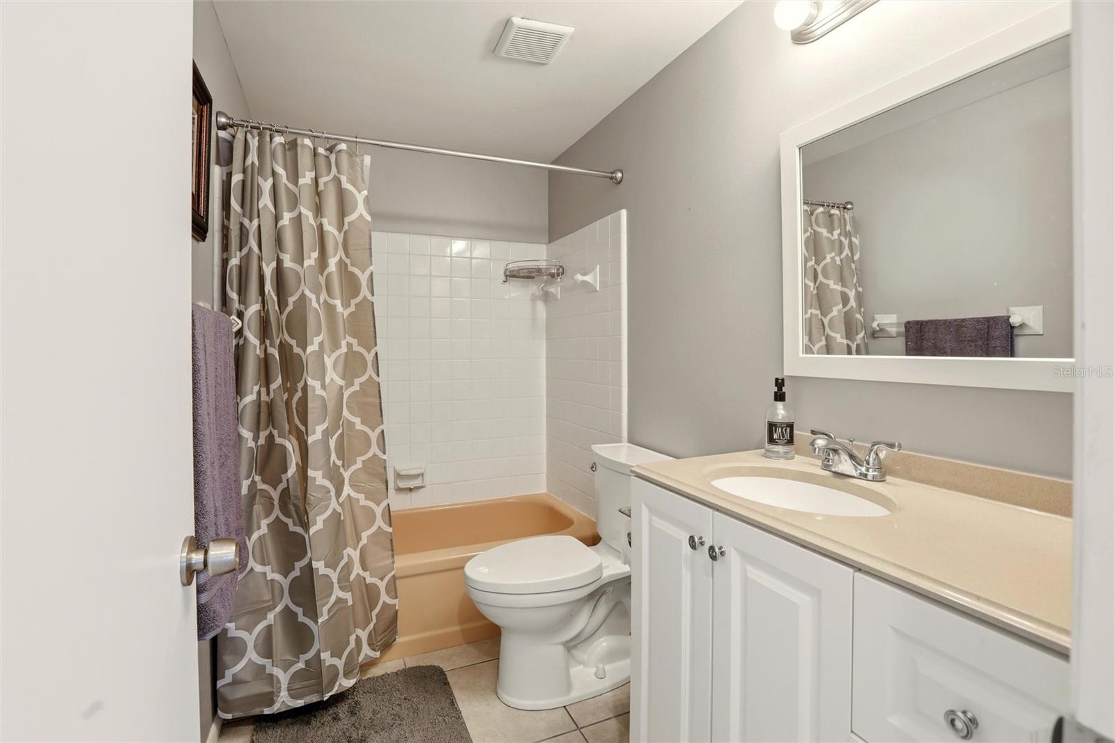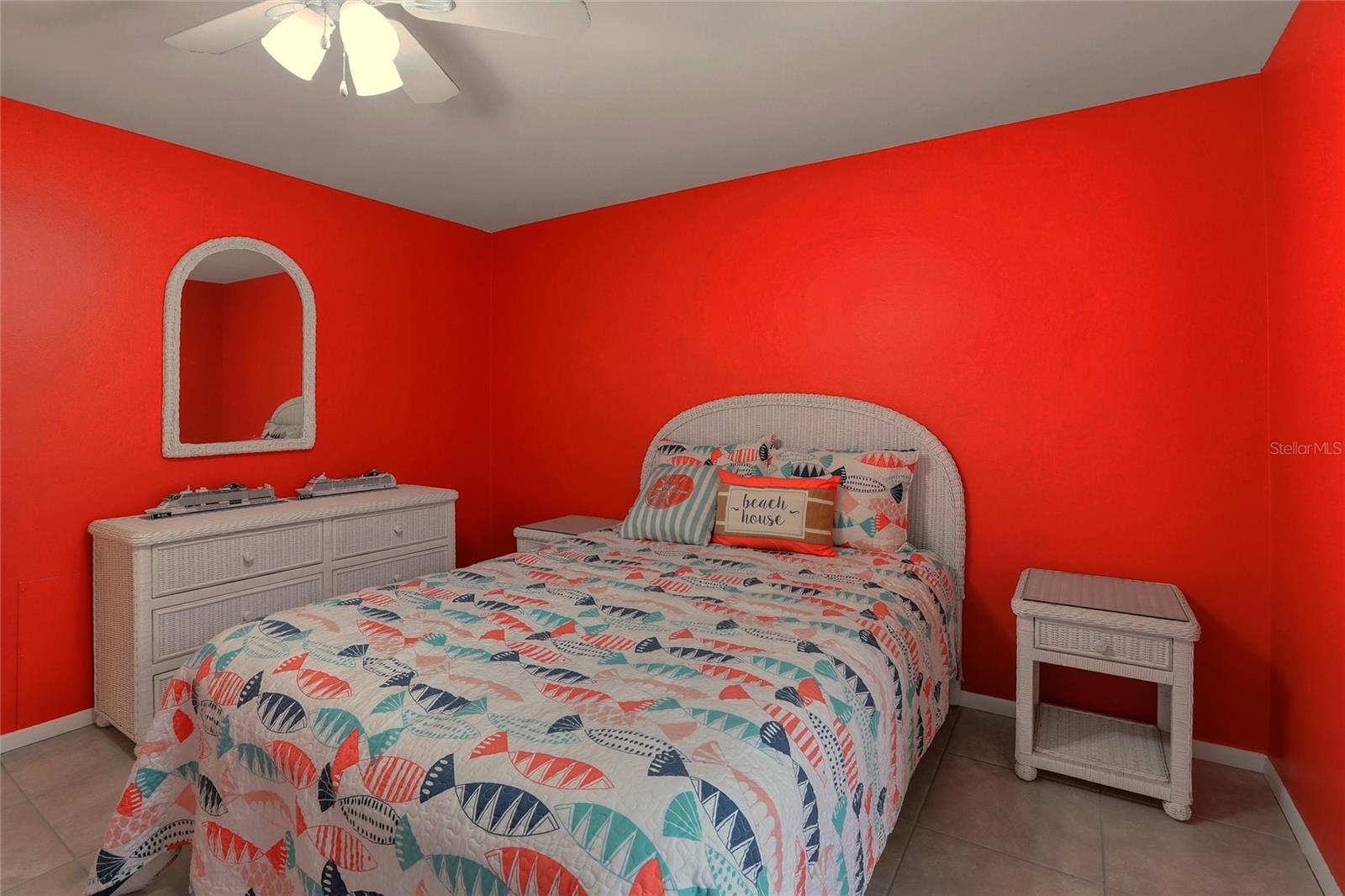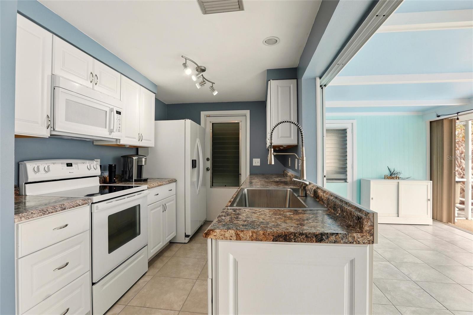 Inside, the home features an inviting layout with easy-to-clean tile flooring throughout and plenty of ceiling fans for year-round comfort. The updated galley kitchen is conveniently positioned between the main living spaces and offers ample cabinets and drawers along with all appliances, while the adjacent dining area is perfectly sized for everyday meals or casual hosting. The spacious primary bedroom, tucked quietly at the rear of the home, easily accommodates a king bed and additional furniture, with a nearby full bath for added convenience. A second bedroom works beautifully as a guest room or home office and is located close to the second bath, creating a functional split-style feel. Rounding out the interior is a dedicated laundry room with extra utility and storage space. There's an attached carport to the home that has been converted into a screened storage space, a flexible bonus area that can easily be converted back to a carport if desired. This creates great flexibility for owners who want space for bikes, beach gear, a workshop setup, or to keep their vehicle out of the sun.