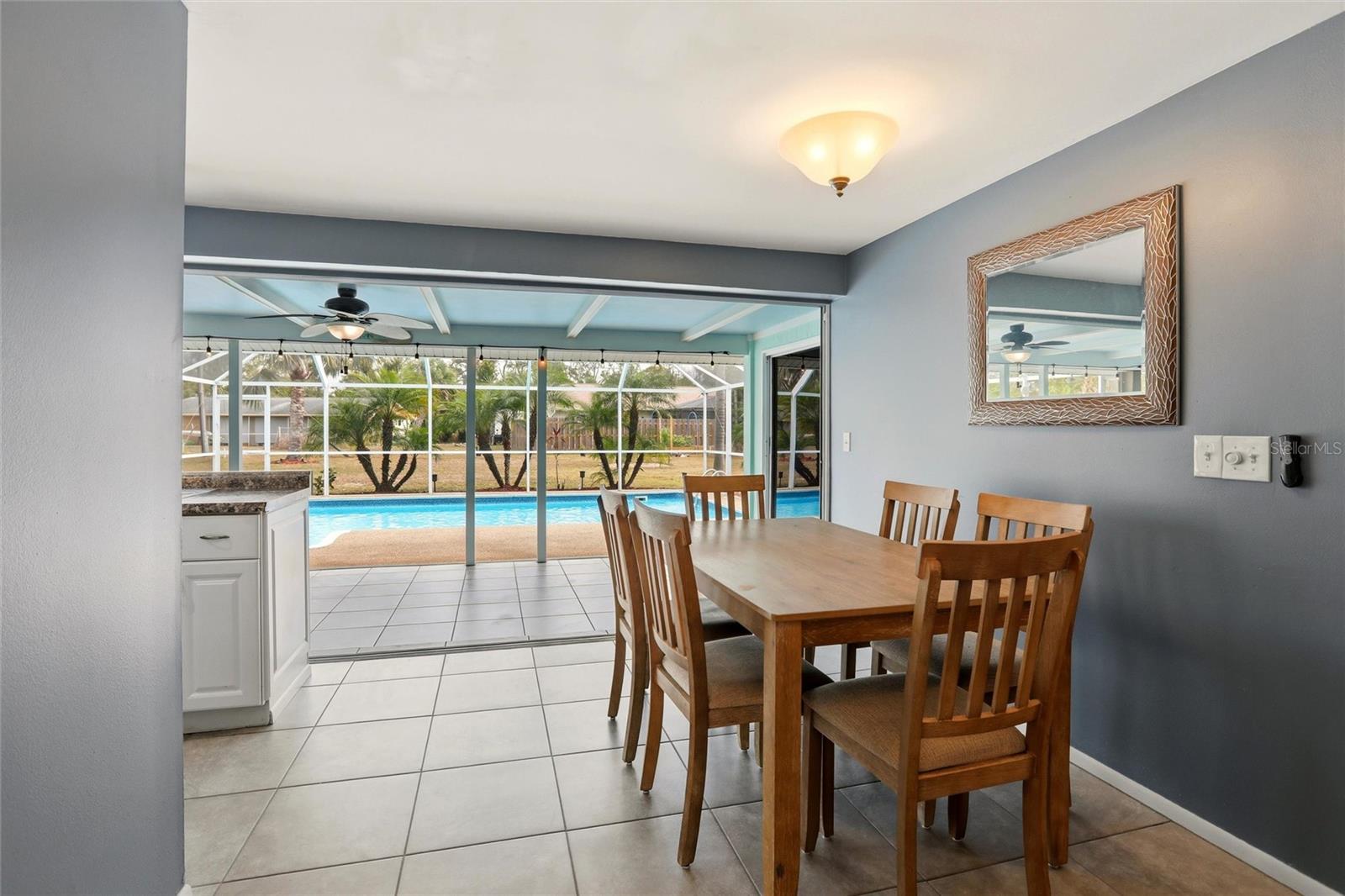 This manageable 918 square foot home truly lives much larger thanks to its seamless connection to the large outdoor living areas. Daily living expands with an additional 312 square foot covered lanai and an impressive 30' x 15' screened pool lanai, delivering the indoor/outdoor lifestyle people flock to Florida for. That sense of openness is created by large triple pocketing sliders that span the entire southeast wall of the dining room and kitchen. Open them fully and the doors tuck neatly away, creating an effortless flow from inside to outside for relaxed entertaining or breezy afternoons at home. With the lanai functioning as a true extension of the interior, it's easy to picture morning coffee, casual dinners, or welcoming neighbors after a day at the beach or on the golf course.