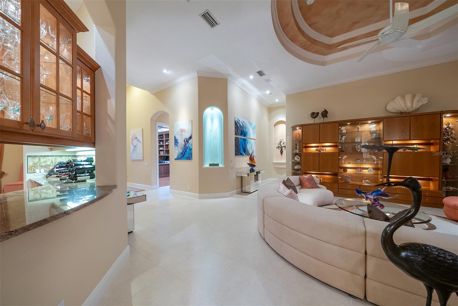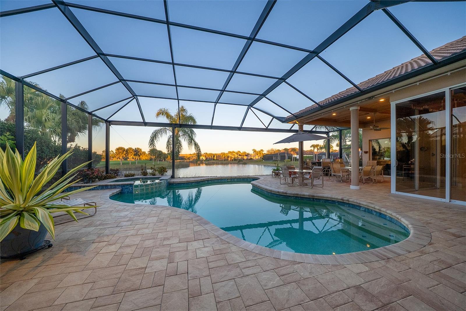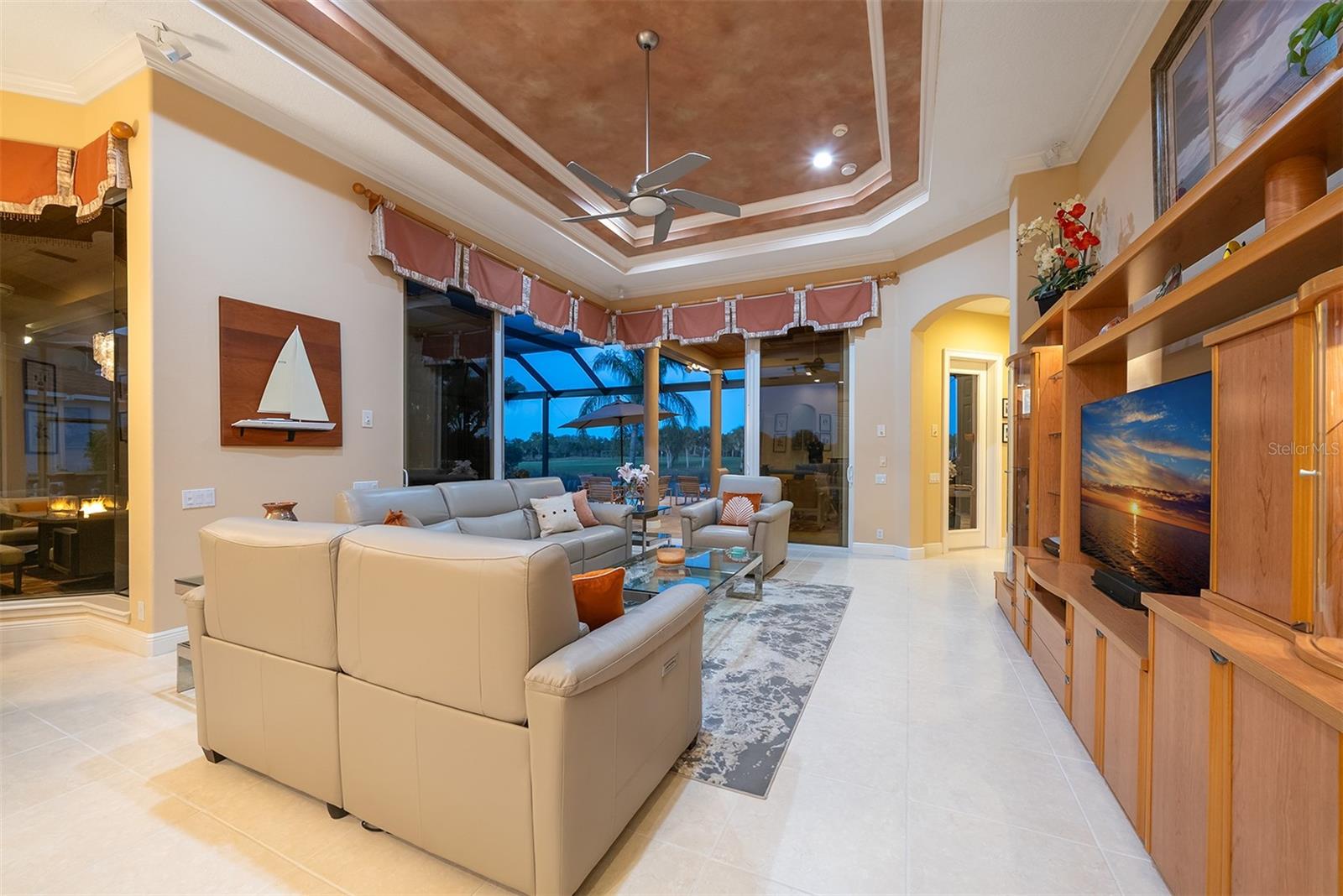 Sweeping water and fairway views abound in this custom-built Arthur Rutenberg home. The decadent approach, architecture and massive entry give a clue to what awaits inside. After entering the double door entry, you're looking through what appears to be a vanishing glass wall, beyond the pool to the lush golf course and panoramic view of the lake, an oasis. So much to take in, the 14-foot tray ceilings, archways, formal dining room and private den. The kitchen was built for a chef featuring gas cooking, custom cabinetry, granite and walk-in pantry. It's easy to be distracted from the view through the nook and large floor-to-ceiling aquarium windows. The adjoining great room with tray ceiling has pocketing corner sliding doors, making the palatial lanai seem never ending. Multiple seating areas, summer kitchen and wet bar, saltwater pool and spa sharing the spectacular view through the panoramic enclosure! The oversize primary suite is just that, with windows and door, near the Jacuzzi. Its bath has a soaking tub, dual marble vanities, separate water closet and Roman shower making this a sanctuary. Ideal for entertaining family and friends with a total of four bedrooms and 3 baths! This home offers a sense of calm during the storm with impact doors and windows, new tile roof and natural gas whole-house generators. Get in your golf cart and head to state-of-the-art country club for lunch or dinner. Golf, tennis, pickleball, fitness and soon Boca Royale's gates will open in Wellen Park for dining, shopping and the ballpark. No, I haven't forgotten your best friend, it is close to the large and small dog parks a block away. Just minutes to the beach, so would you like to start your new lifestyle?