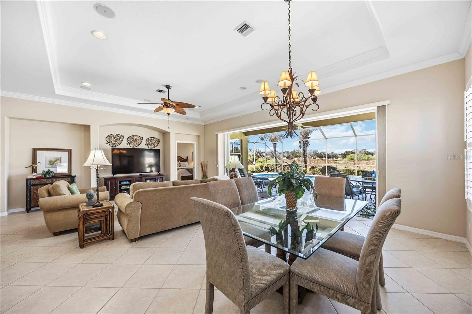 Welcome to resort-style living in the highly sought-after Venetian Golf & River Club. Step through the front door of this beautiful move-in-ready, fully furnished 2-bedroom, 2-bath home with den, where light-filled spaces, thoughtful design, and seamless indoor-outdoor living come together. A new A/C add comfort to for the new owner of this home. The bright, open-concept floor plan immediately draws your eye to stunning views of the heated pool and spa and expansive lanai overlooking a vast natural green space. Open the impressive 20' wall of sliding glass doors to let the outdoors in, enjoying tranquil views from early morning light to breathtaking sunsets--perfect for both quiet evenings and entertaining. The lanai is truly a private retreat, featuring a 25' covered area, custom paver pool deck, and ample space to relax in the shade or enjoy meals outdoors. Prefer the sun? Lounge poolside or unwind in the custom-tiled saltwater pool or hot tub, all while overlooking the expansive green backdrop with gently swaying landscaping. Inside, the home showcases high ceilings, tray ceilings, double crown molding, neutral finishes, and abundant natural light. The kitchen is designed for both function and entertaining, offering granite countertops, a center island, breakfast bar, eat-in nook, ample cabinetry, and under-cabinet lighting, all open to the dining and living areas. The primary suite, privately located at the rear of the home, features serene views of the green space, pool, and lanai. The ensuite bathroom includes a large walk-in closet, walk-in shower, jetted tub, dual granite vanities, linen closet, and private water closet. Guests enjoy privacy at the front of the home with a nearby second bathroom featuring a granite vanity and tub/shower combination. The den, accessed through French doors, is ideal for a home office, study, or additional guest space. This home offers the perfect blend of space, privacy, and Florida lifestyle living--highlighted by peaceful views, a heated pool and spa, and exceptional indoor-outdoor living. Community amenities include restaurant, resort-style pool with tiki bar, lap pool, fitness center, tennis and pickleball courts, scenic river walk trails along the Myakka River, and a gated, guard-attended entrance. Residents may join the Venetian Golf Club for an additional membership fee. Ideally located approximately 3 miles to I-75 and Sarasota Memorial Hospital-Venice, 9 miles to Nokomis Beach and Historic Downtown Venice, 11 miles to Wellen Park, and just 20 minutes to Sarasota.