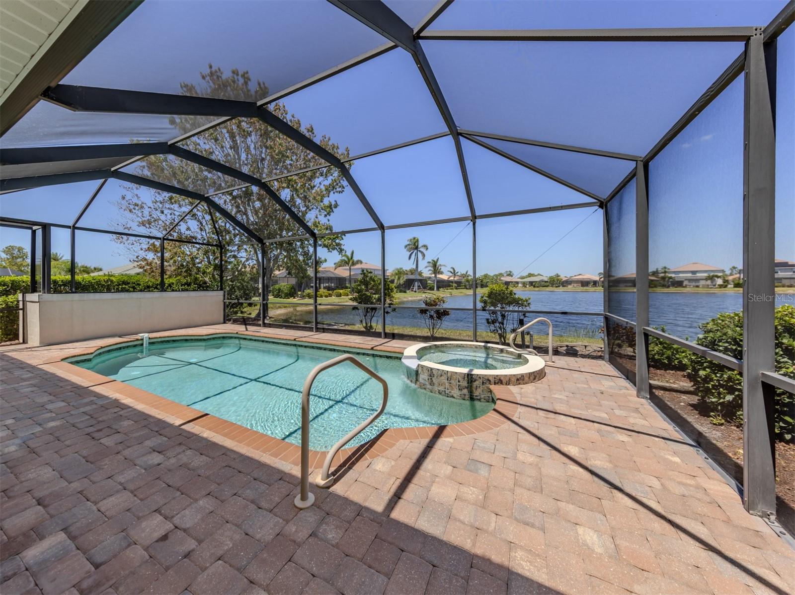 Stunning water views! Discover the epitome of Florida living in this 1,680-square-foot, hurricane-protected, beautifully appointed, with two bedrooms, two baths, den and heated pool home in the gated community of Stoneybrook at Venice. This long-water view home combines modern upgrades, elegant wood and tile flooring throughout, and serene north-facing lanai with long water views, ideal for everyday enjoyment of the pool and lanai. The open concept layout features a living room, family room and versatile den, all enhanced by stylish wood and tile flooring that adds warmth and easy maintenance. The family room boasts sliding glass doors that open to a screened lanai, complete with heated pool and spa, creating a seamless indoor-outdoor living experience. The primary suite, at back of the home, offers tranquil lake views, walk-in closet, and a private en suite with dual sinks and walk-in shower. The second bedroom at front of the home near the second full bath is ideal for guests or family, while the den provides flexible space for a home office or hobby room. The gourmet kitchen shines with a breakfast nook, pantry, built-in desk, raised opaque panel cabinetry, stainless steel appliances, reverse osmosis filtration system and breakfast bar that overlooks the family room. The laundry room with extra cabinetry for storage leads to the two-car garage featuring extended storage space for bikes, beach chairs and more. Modern upgrades include 2022 air conditioner, 2017 photovoltaic solar system (paid in full), 2024 pool heater, and Rinnai tankless water heater with Culligan sediment filter, ensuring efficiency and comfort. This home is move-in ready. Stoneybrook at Venice is a family-friendly community with many amenities such as a guarded gate, community center, fitness center, CATV, gathering room with kitchen, movie room, resort-style pool, hot tub, splash pool, sand volleyball, playground, ball fields, splash park and pickleball courts coming soon as monies have been allocated. Close to Interstate 75 and downtown Venice, the newly built Sarasota Memorial Hospital, shopping, dining, pristine Gulf beaches, Sarasota County's A-rated schools and Atlanta Braves spring training ballpark. Furnishings available for purchase outside the contract.