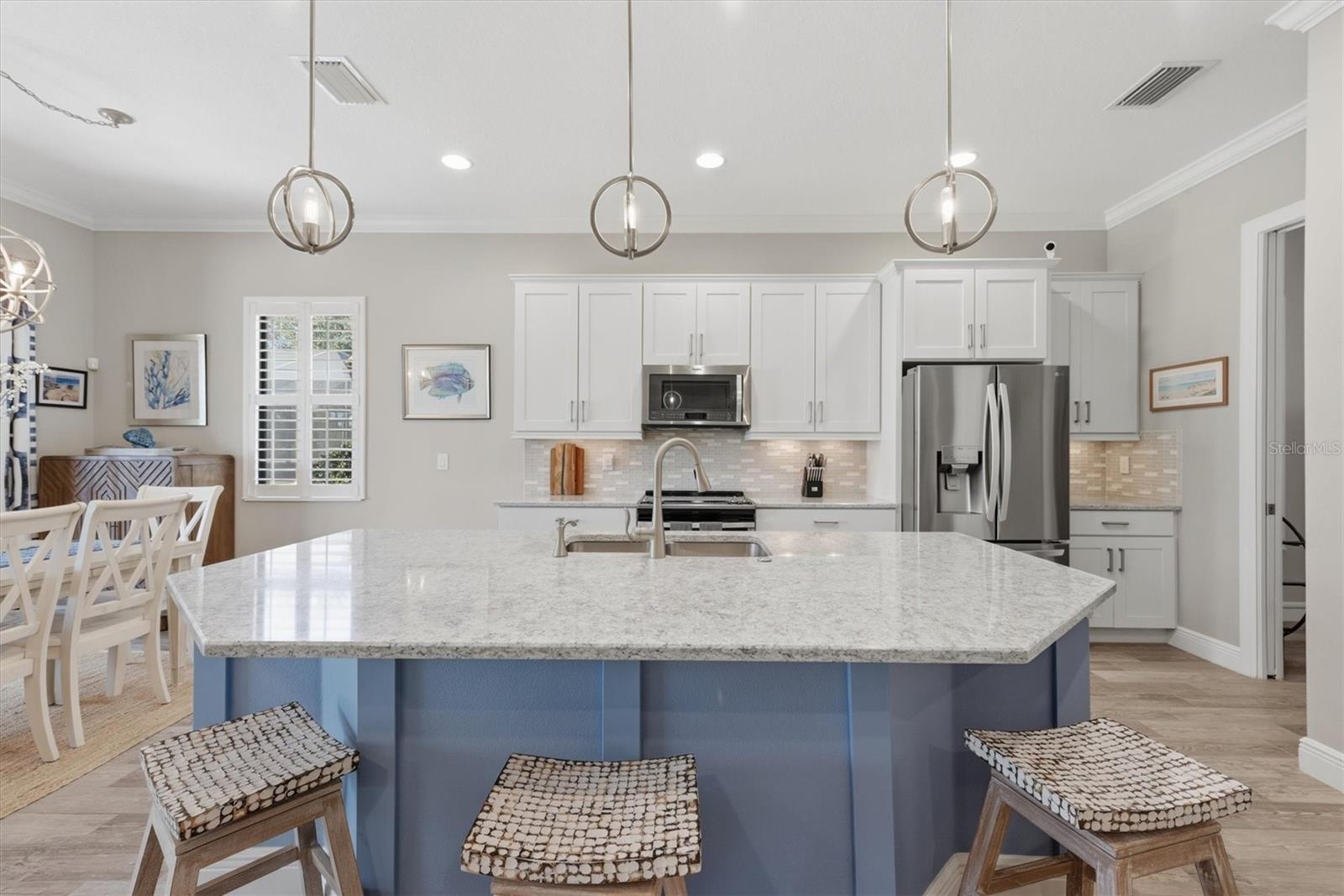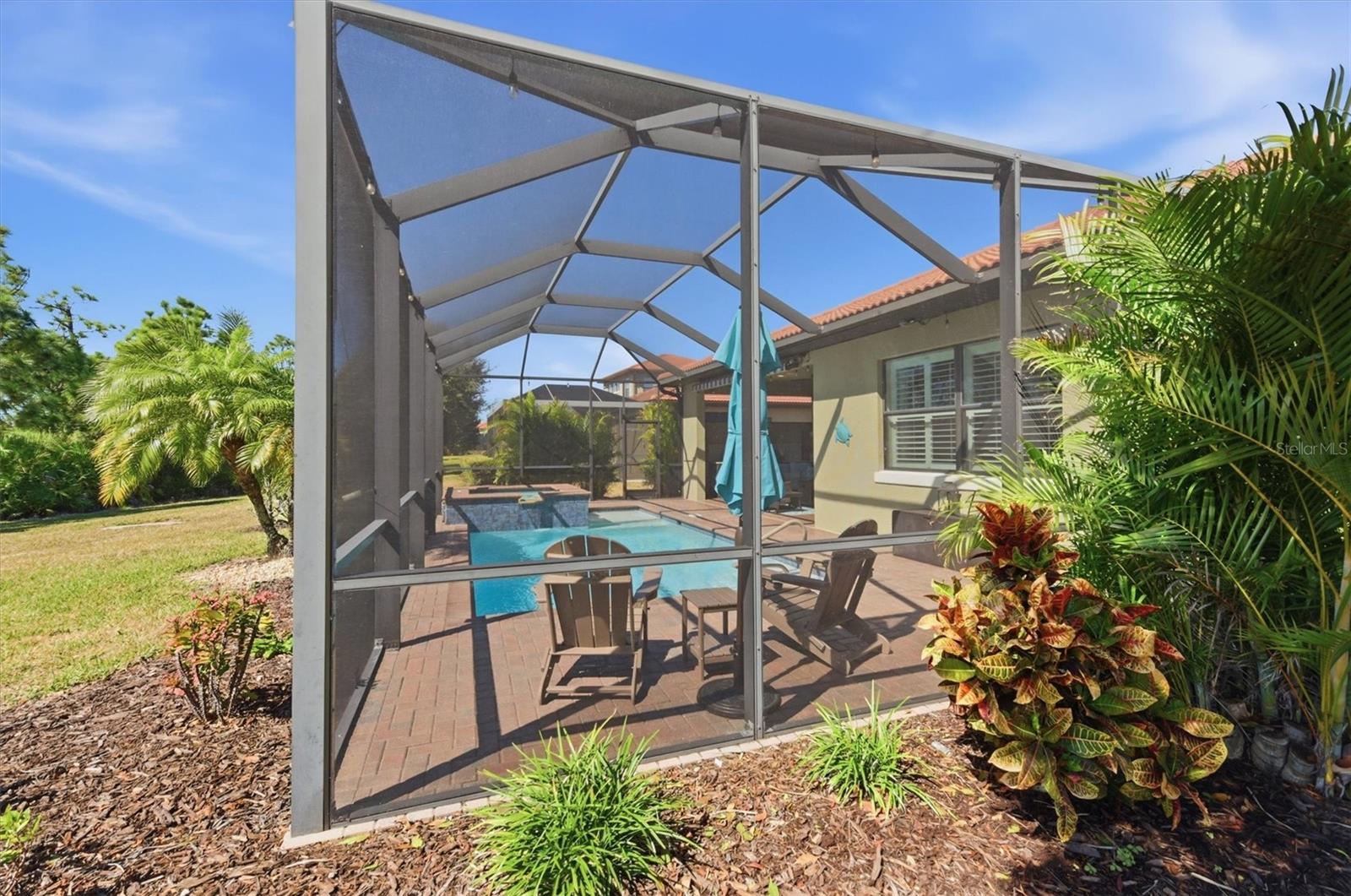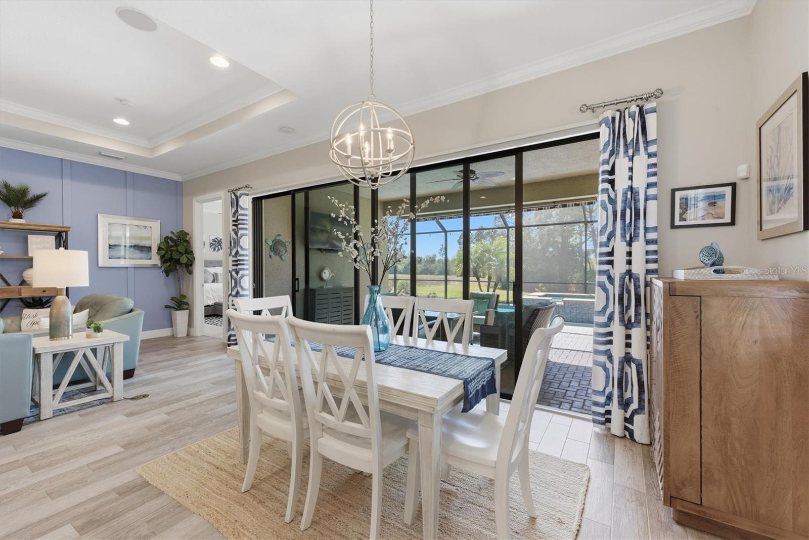 Discover the epitome of Florida living in this stunning 3-bedroom, 2-bathroom home at 10399 Medjool Drive, nestled within the sought after Sarasota National community. Boasting the well-designed Florencia floor plan by renowned WCI builders, this residence features elegant quartz counters in the stylish kitchen and bathrooms, complemented by designer lighting and ceiling fans throughout. Enjoy planked tile flooring in the main living areas, trey ceilings in the great room, office/den, and primary bedroom, along with glass French doors in the office/den for a touch of sophistication. The home is adorned with 8-foot tall doors, crown molding, plantation shutters, and unique feature walls in the great room and each bedroom.Step outside to your private oasis, where four sliders create a seamless wall of glass overlooking a beautiful heated saltwater pool and spa. Savor the best of both worlds with serene preserve and water views, enhanced by motorized retractable awnings and a fully equipped outdoor kitchen--perfect for entertaining or relaxing in style.As a resident of Sarasota National, you'll have access to world-class amenities, including a 30,000-square-foot clubhouse with elegant dining at the Palm Club Restaurant and poolside fare at the Tiki Bar. Stay active in the 7,000-square-foot fitness facility, unwind at the fabulous resort-style pool with dedicated lap lanes, or enjoy bocce, tennis, and pickleball courts. All this is surrounded by 1,300 acres of pristine preserves, lakes, and conservation land, with miles of sidewalks inviting you to embrace the ultimate Florida lifestyle. Don't miss this opportunity to call it home.