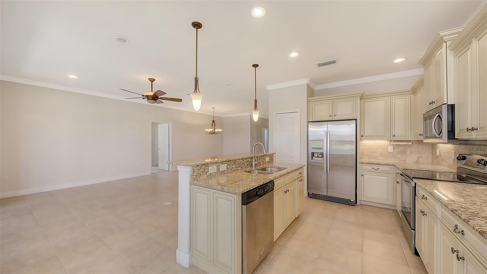 Enjoy beautiful lake views from this 2-bedroom, plus den, 2-bathroom Florence home in the 55+ resort-style community of Venetian Falls! This home features an open floor plan with crown molding, enhanced baseboards, and ceramic tile floors in all main living areas and new carpet in the bedrooms and den. An expansive lanai offers a wonderful outdoor living area to relax, grill, and dine while taking in the views! You can catch colorful sunrise and sunset skies. The kitchen features solid-wood cabinets with pull-out shelves and undermount lighting, plus granite countertops also on the dining bar and desk area. The dinette is situated by two large windows and a slider to take advantage of the view. You will love the primary suite with two closets (one a large walk-in) and ensuite with spacious shower, separate vanities with granite countertops, private WC, and linen closet. The guest bedroom has a view over the front of the home, two closets (one a walk-in) and ensuite bathroom which can also be conveniently accessed from the foyer. French doors provide additional privacy for the den. Pavers enhance the driveway, entryway, and lanai. A screened front entryway, decorative beveled glass front door, laundry room with storage cabinets, and two-car garage complete this beautiful home. For peace of mind, painted panel storm shutters are included. Enjoy an additional sense of privacy as this lot is situated adjacent to a vacant, community owned lot. Venetian Falls amenities include a clubhouse with heated lap pool, spa, resistance walking pool, state-of-the-art exercise facility, billiard room, bocce, putting green, events, activities director and more! Maintenance-free lawn care, basic cable TV, and internet are included in the reasonable HOA. Venetian Falls is located just a few miles from sunny beaches, shops, restaurants, and historic Venice MainStreet!