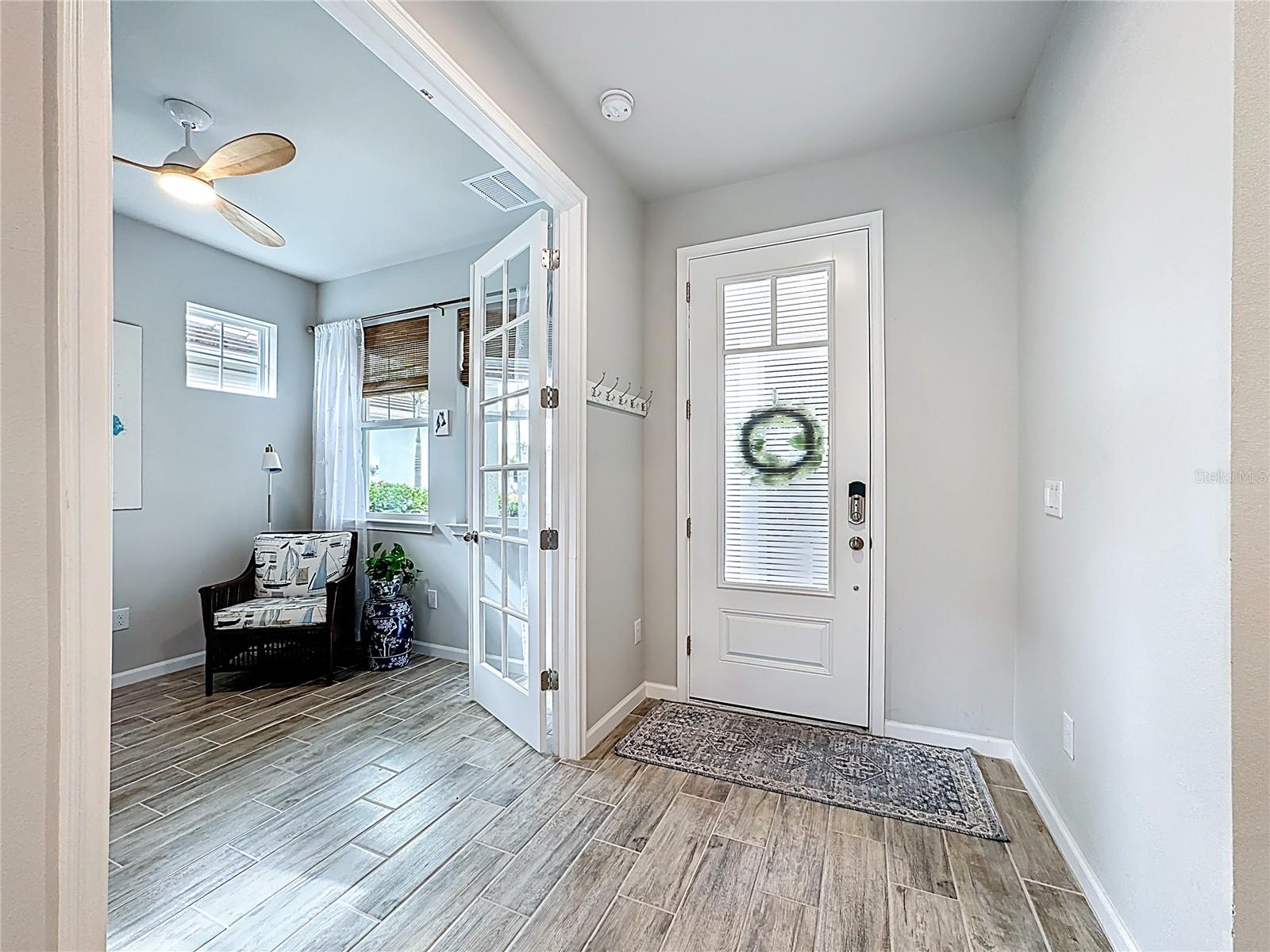 IMPROVED PRICE! Welcome to refined, low-maintenance Florida living in this impeccably maintained Largo model villa, ideally situated within the sought-after, gated community of Renaissance at Wellen Park. Built in 2022 and gently enjoyed, this move-in-ready residence showcases contemporary design, elevated finishes, and thoughtful custom enhancements--all set against the serene backdrop of a screened lanai and private backyard retreat. A decorative paver driveway and walkway lead to a charming covered front porch and striking glass entry door. Inside, a light-filled foyer reveals a spacious open-concept floor plan designed for both comfort and entertaining. Wood-look plank tile flooring, 8-foot interior doors, upgraded lighting and ceiling fans, and a statement shiplap accent wall create a refined yet inviting ambiance. Just off the foyer, a versatile den with French doors offers flexibility - ideal as a home office, third bedroom, media lounge, or hobby space. The split floorplan ensures privacy for guests, who will appreciate the generously sized secondary bedroom and full bath with a quartz vanity and tub/shower combination. At the heart of the home, the gourmet kitchen flows seamlessly into the dining and living areas. The main living space is enhanced by plantation shutters and abundant recessed lighting. The kitchen features 42-inch cabinetry, quartz countertops, stainless steel appliances, under-cabinet lighting, and upgraded pendant fixtures--balancing style and function with ease. Sliding glass doors extend the living space outdoors to a screened lanai and expanded paver patio, offering a lovely setting for morning coffee, evening cocktails, grilling, or relaxing year-round. The primary suite is a private retreat with a spa-inspired bath featuring dual vanities, a tiled walk-in shower, private water closet, and a customized walk-in closet with added shelving and double hanging rods for optimum storage. Additional highlights include full hurricane shutters, a tile roof, and the added peace of mind of being located in Flood Zone "X." Residents enjoy resort-style amenities including a zero-entry swimming pool with lap lanes and spa, fully equipped fitness center, clubhouse with catering kitchen, outdoor fireplace patio, tennis and pickleball courts, playground, and dog park. Lawn care is included in the HOA fee, allowing for truly carefree living. Ideally located just minutes from Downtown Wellen Park, CoolToday Park (Spring training home of the Atlanta Braves) area dining, shopping, farmers markets, I-75, Tamiami Trail, Venice beaches, historic downtown Venice, and Costco, this home offers exceptional convenience within one of the region's most vibrant master-planned communities. The impeccable furnishings are also available for sale under separate purchase...allowing you to move right in and start enjoying your slice of paradise! Why wait to build when this gently loved home is available now in an established neighborhood with no construction delays or unexpected costs? Experience the perfect balance of modern elegance, effortless maintenance, and dynamic community living in one of Wellen Park's most desirable enclaves.