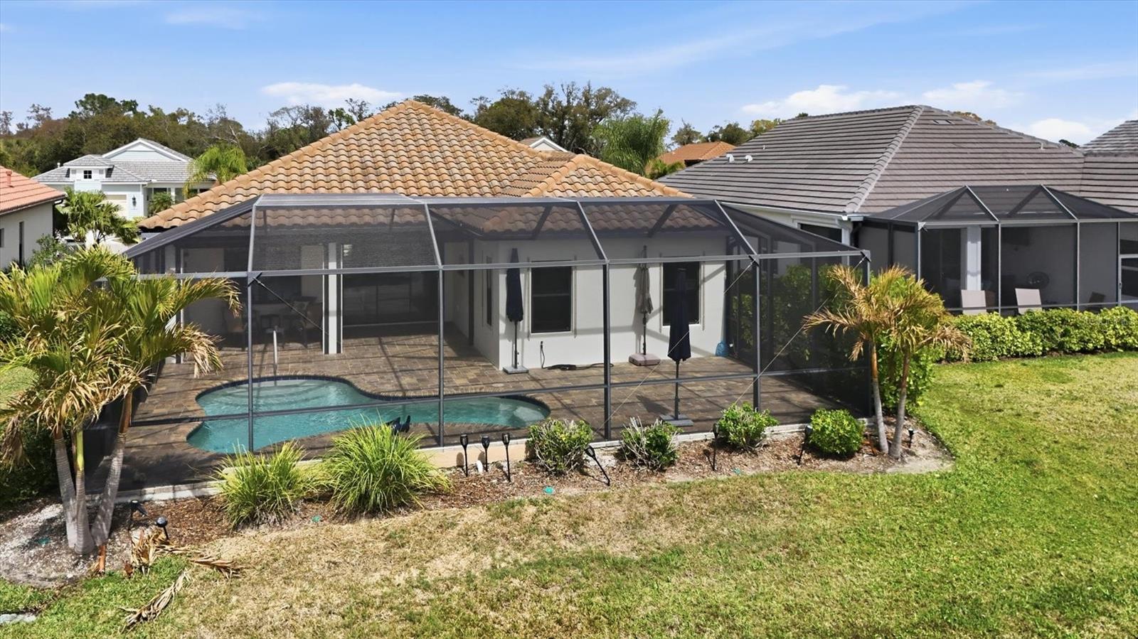 Beautiful maintained and upgraded 2019 White Star model with lake view. 3 bedroom plus den, 2 1/2 bathroom home with private pool and modern open floor plan with tray ceilings and crown molding. The home sparkles with ceramic tile flooring throughout and abundance of natural light. A stunning kitchen with granite counter tops, stainless steel appliances and plenty of counterspace and gas stove makes entertaining fun. The split bedroom floor plan gives everybody privacy. The master suite enjoys the lake view a en-suite bath with dual sinks and generous walk in closet. The house is in an x flood zone, has whole house hurricane protection as roll down shutters, a Generac natural gas generator, surge protector and integrated security system to give a buyer complete serenity. Located in the Grand Palm Community with endless resort-style amenities and activities, ranging from a resort-style pool, splash pad, dog park, pickleball, tennis, playground, fishing piers and much more so residents can relax or stay active without even leaving the community. Home comes furnished (except: antique chest in living room, office desk, chair and table, white chest in bedroom closet and reclyner in 2nd bedroom) House has fresh paint inside and out. New hot water circulation with pump and timer, New front load GE washer and dryer, New Pure MX ultraviolet light in HVAC, Monkey Bar 4'x8' shelves in Garage rated at 750 pounds, New front door with glass, New pool pump and all new furniture and 85" TV