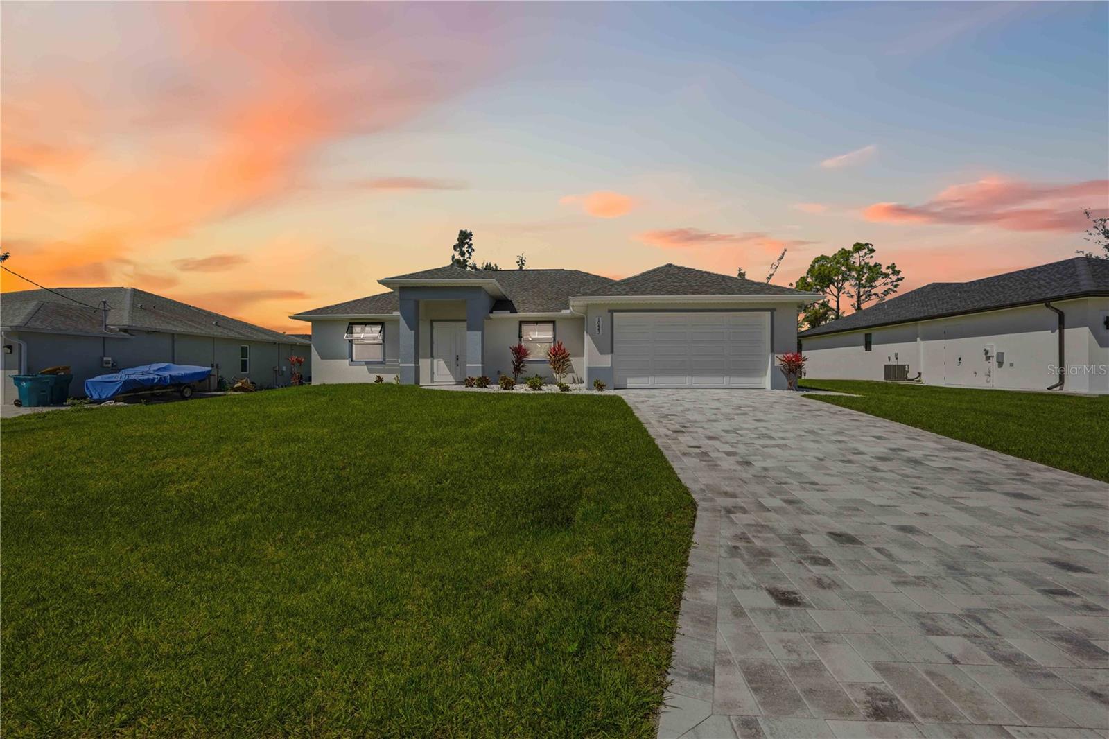 Brand-new custom home in the highly sought-after waterfront community of South Gulf Cove, offering modern design, quality construction, and a bright open layout that today's buyers are searching for. This beautiful 3-bedroom, 2-bath home features high ceilings and 8-foot doors throughout, creating an airy, light-filled interior that immediately feels spacious and welcoming. The centerpiece of the home is the impressive chef's kitchen, designed for both everyday living and entertaining, featuring granite countertops, soft-close cabinetry, GE stainless steel appliances, a Broan range hood, farmhouse sink, oversized center island, and a large walk-in pantry with exceptional storage. The open living and dining areas flow seamlessly to the covered paver lanai, providing the ideal indoor-outdoor living space Florida buyers love. The private primary suite offers a relaxing retreat with sliding glass doors leading to the lanai, double-door entry into the en-suite bathroom, and a unique layout that connects the spacious walk-in closet directly to the laundry room for added convenience. The primary bathroom features quartz countertops, dual vanities, modern finishes, and a large walk-in shower. Two additional bedrooms are located on the opposite side of the home and share a stylish guest bathroom with quartz countertops and contemporary design. Exterior highlights include impact-rated windows and doors, Bahama shutters, paver driveway, epoxy-coated garage floor, irrigation system, and a large covered paver lanai perfect for relaxing outdoors year-round. Located in the popular South Gulf Cove boating community, residents enjoy access to community boat ramps, parks, dog parks, pickleball courts, and a clubhouse. The home is ideally positioned just a short drive or boat ride from Boca Grande and its world-famous beaches, while also being close to the shopping, dining, and entertainment of Englewood and Port Charlotte. New construction homes with these upgrades in South Gulf Cove are in high demand. Schedule your showing today before this one is gone.