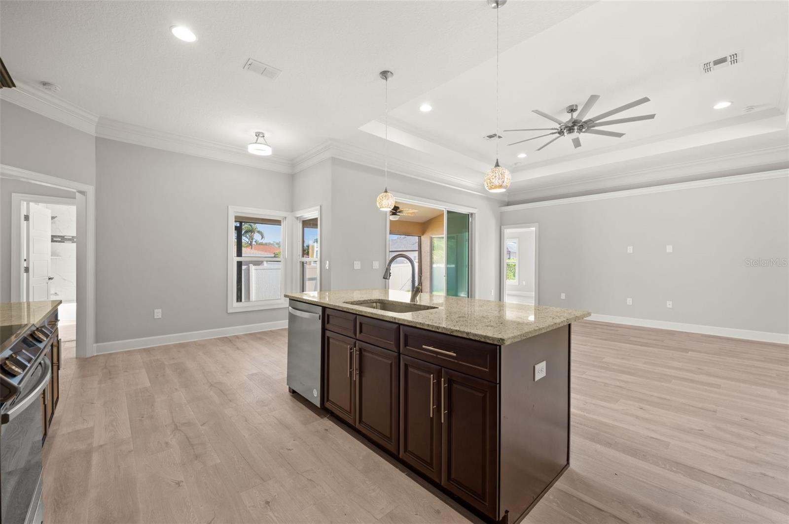 One or more photo(s) has been virtually staged. Welcome to this beautifully crafted 2022 new construction home in desirable South Venice, offering 3 bedrooms, 2 bathrooms and 1,840 sq ft of thoughtfully designed living space--with NO HOA and NO CDD fees. Ideally located between Manasota Beach and Venice Beach, this property also provides access to the private South Venice Beach ferry and is just minutes from Legacy Trail and Shamrock Park.This move-in ready home features an open-concept floor plan that seamlessly blends the family room, dining area, breakfast nook and kitchen--perfect for both entertaining and everyday living. The kitchen is equipped with stainless steel appliances, granite countertops, a pantry and an oversized breakfast bar. Elegant interior details include tray ceilings, crown molding and decorative high baseboards in the dining area. Enjoy engineered wood and tile flooring throughout and a split-bedroom layout that provides added privacy. The spacious primary suite offers a large walk-in closet and an en-suite bath complete with dual vanities, a soaking tub, a walk-in shower with glass doors and a linen closet. Additional highlights include a screened-in lanai, separate laundry room with utility sink and a two-car garage. The home is equipped with a new well featuring a softener and purification system, new septic system, sprinkler system, gutters with downspouts and hurricane shutters. The roof is built with 30-year mildew-resistant shingles. Don't miss this opportunity to own a modern, well-appointed home in a prime South Venice location--schedule your showing today!