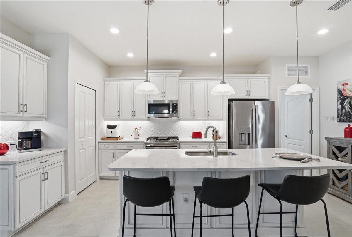 Come experience this spacious Sandcastle model in the highly sought-after community of Boca Royale Golf and Country Club! This three-bedroom villa with a den, features an open floorplan centered around a gourmet kitchen, complete with quartz countertops, upgraded Timberlake pewter glazed cabinets, under cabinet LED lighting, stainless steel appliances, tile backsplash, and a large center island perfect for entertaining. The great room showcases a coffer ceiling and pocket sliding impact glass door, accented by a custom made accordion shade creating a seamless indoor-outdoor living experience. Step onto the extended screened lanai, where tranquil pond views provide the perfect backdrop for dining and relaxation. A gas line rough-in is in place, providing a convenient option for outdoor grilling. This home offers peace of mind with full hurricane protection, including impact windows throughout and Storm Smart screens enclosing the lanai. A retractable front door screen allows a refreshing breeze to flow throughout the home, enhancing comfort while keeping insects out. Upgraded tile flooring extends throughout the home, while the split-bedroom layout ensures privacy for both owners and guests. The spacious primary suite features an ensuite bath and dual vanities, a walk-in glass enclosed shower and over-sized walk-in closet. The versatile office/den can easily function as a fourth bedroom and is conveniently located near a full bath with walk-in shower. Additional highlights include a well-appointed laundry room with built-in cabinetry; two-car garage with utility sink, epoxy floor, and ample storage; and gas appliances (range, water heater, dryer.) Just steps away, residents can enjoy the Belize community pool and hot tub. Boca Royale Golf & Country Club offers a wide range of amenities, including a renovated clubhouse, fitness center, optional golf, tennis and pickleball. Ideally located just minutes from Gulf of America beaches, historic Dearborn Street, downtown Venice, Wellen Park and local farmers' markets and festivals - this home presents an exceptional opportunity to enjoy the best of Florida living.
