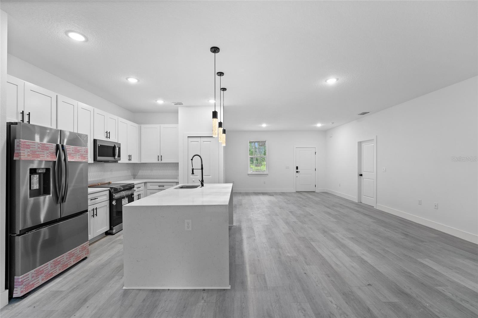 New Construction! Fully completed and Move-in Ready! Don't wait! Brand new concrete block construction in the heart of North Port -- no HOA, no CDD, and no flood zone (X). This beautifully crafted 4-bedroom, 3-bathroom home offers an elegant open floor plan with a epoxy finished two-car garage, and premium finishes throughout.The gourmet kitchen features a large center island with waterfall-edge quartz countertops on both sides, soft-close cabinetry, stainless steel Samsung appliances -- ideal for entertaining and everyday living. Luxury vinyl plank flooring flows throughout the home, offering style and durability.The spacious primary suite includes his-and-hers walk-in closets and a bathroom with dual sinks and a glass-enclosed walk-in shower. A secondary bedroom includes a private en-suite bath, and a walk-in closet perfect for guests or multi-generational living. All bedrooms with blinds and modern celling fans. Additional features include impact-resistant windows and doors, a smart thermostat, upgraded lighting, a water filtration system, and garage doors with glass panels that allow natural light in. Enjoy Florida living year-round on the covered lanai with a nicely sized backyard and extended paver driveway.Easy access to I-75, commuting to Sarasota, Fort Myers, and top-rated Gulf Coast beaches like Siesta Key and Venice Beach. An excellent opportunity for homeowners and investors alike!Schedule your private showing today!