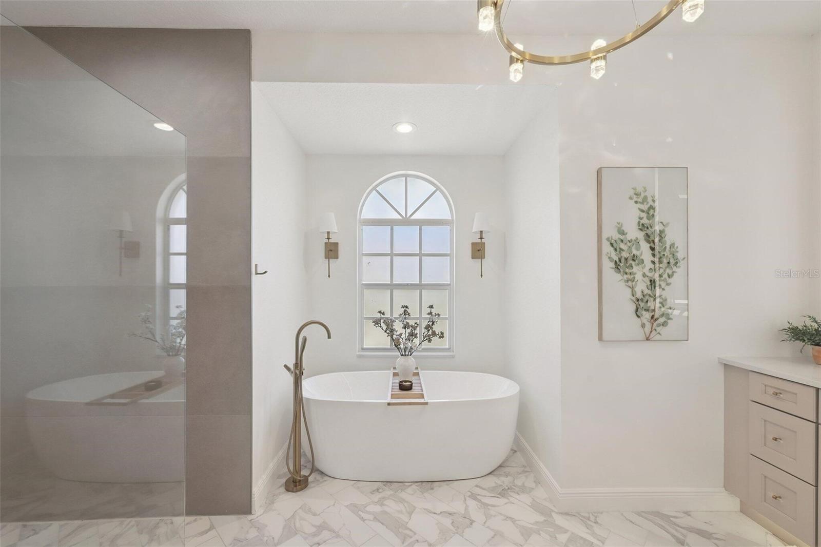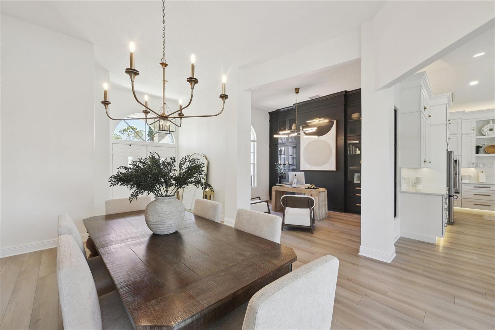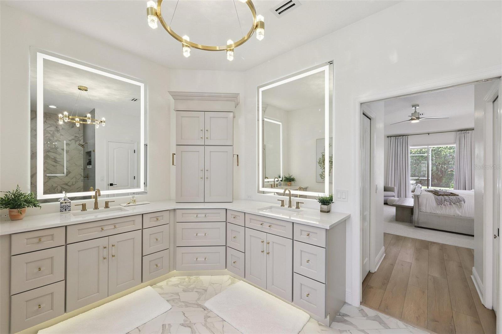Situated on a large corner lot within the gated Eastlake community, this extensively updated home provides unobstructed lake views, a side-entry two-car garage, and a relaxed neighborhood setting with low HOA dues. The open and functional floor plan features soaring 12-foot ceilings in the main living areas, abundant natural light, and electric roller shades that provide privacy at the touch of a button.The custom kitchen was thoughtfully designed for both everyday living and entertaining, featuring high-quality cabinetry, an oversized quartz island, induction cooktop, KitchenAid appliances, Delta Pot filler, full-extension pantry storage, and layered accent lighting. Lighting continues throughout the home with adjustable gallery and art lighting that enhances both function and atmosphere.Additional interior highlights include a custom office that easily doubles as a guest room, a fully upgraded laundry room with ceiling-height cabinetry, and generously sized bedrooms, including a guest suite with direct access to the pool area. Recent improvements include a 2022 HVAC system with transferable warranty, 2024 blown-in attic insulation, whole-home surge protection, and integrated lighting and climate features throughout.Outdoor living is equally well considered, with a spacious paver patio, screened lanai, temperature-controlled in-ground pool and swim spa, and professionally landscaped grounds accented by color-changing LED lighting. The primary suite serves as a private retreat with a soaking tub, oversized shower, illuminated mirrors, ambient lighting, and custom walk-in closets. Thoughtful upgrades extend throughout the home, reflecting careful attention to quality, comfort, and long-term livability.