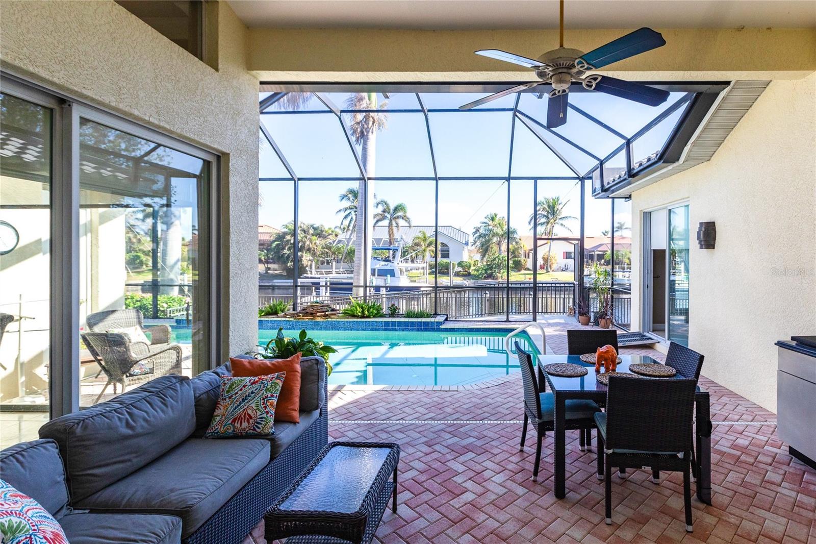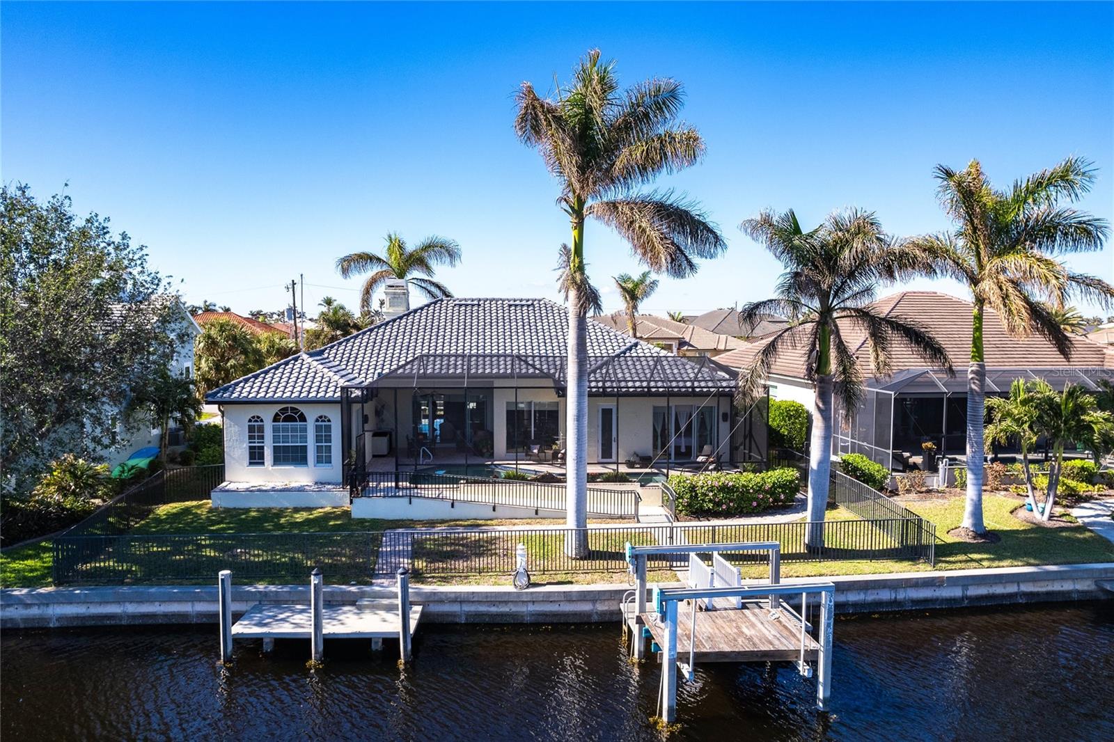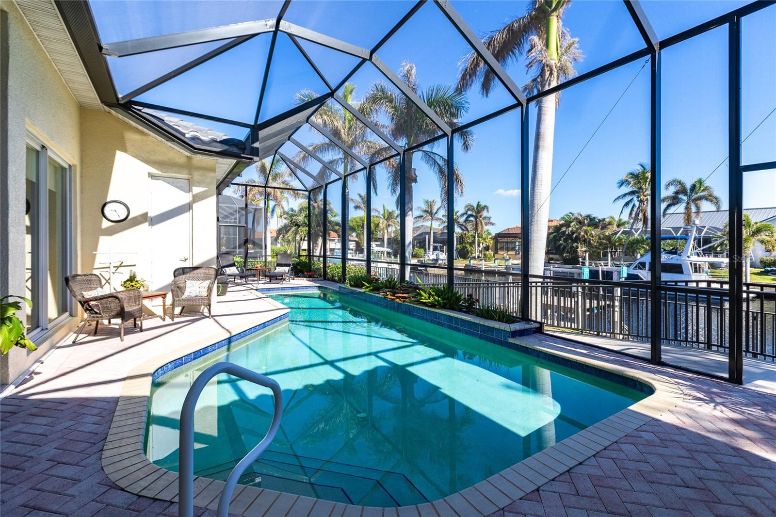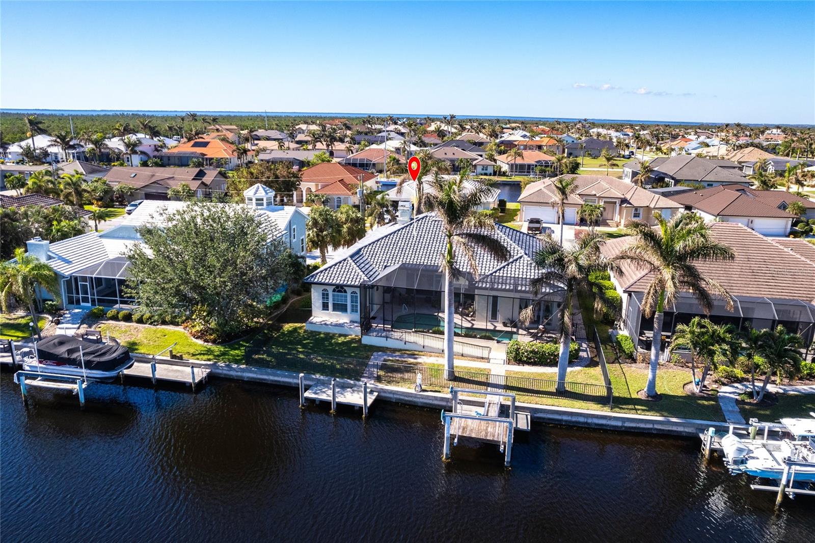 **Experience Waterfront Elegance and Boating Bliss** Indulge in the ultimate waterfront lifestyle with this luxurious 3-bedroom, 2-bathroom + den home, nestled along a deepwater canal just minutes from open water, and no bridges limiting height access. Designed for both comfort and sophistication, this exquisite property boasts two private docks, one equipped with a 10,000 lb boat lift and 30-amp power, offering the perfect haven for your boating adventures. Step into a home where refined details greet you at every turn. From the gleaming marble floors to the intricate coffered ceilings, the artistry and craftsmanship are undeniable. The expansive open-concept layout seamlessly connects the great room, formal dining area, and chef's kitchen, all framed by captivating views of the pool and canal. A wood-burning fireplace anchors the great room, providing warmth and ambiance, while columns, crown molding, transom windows, and arched entryways add architectural charm. The gourmet kitchen is a chef's dream, featuring granite countertops, custom wood cabinetry, a center island, breakfast bar, and premium stainless steel appliances, including a 6-burner gas range with hood and built-in double ovens. The adjacent breakfast nook is perfect for casual dining with serene water views. Retreat to the luxurious primary suite, a private sanctuary with lanai access, stunning canal views, and double walk-in closets. The spa-inspired primary bath offers a jetted garden tub, a dual-entry shower with twin showerheads, split vanities, and a private water closet. The split-bedroom floor plan ensures privacy, with two guest rooms, one with sliding door pool-access, and a pool-access guest bath. Step outside to your personal paradise. The expansive lanai features a brick-paver deck, a sparkling in-ground pool, and a summer kitchen complete with a JennAir grill, prep sink, and bar refrigerator--perfect for entertaining. The 85 ft. of water frontage includes a city-maintained seawall, and two concrete docks, complete with water and electric hookups, making this home a boater's dream. Additional features include whole-house hurricane protection with a mix of impact windows and shutters, a brand-new roof, an oversized two-car garage, a built-in wall safe, and a network hub in the laundry room. This home combines elegant waterfront living with practical functionality, offering the ultimate Florida lifestyle. Additional amenities of Punta Gorda Isles include the St. Andrews Golf Course, Punta Gorda Nature Park, and biking trails throughout. Paradise is possible for you in this stunning home!