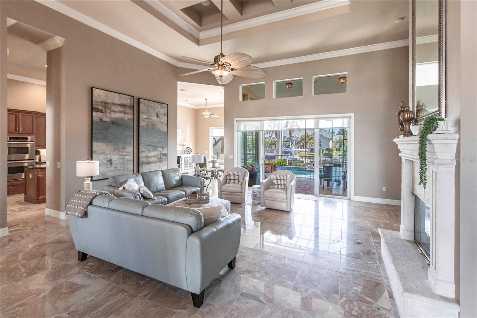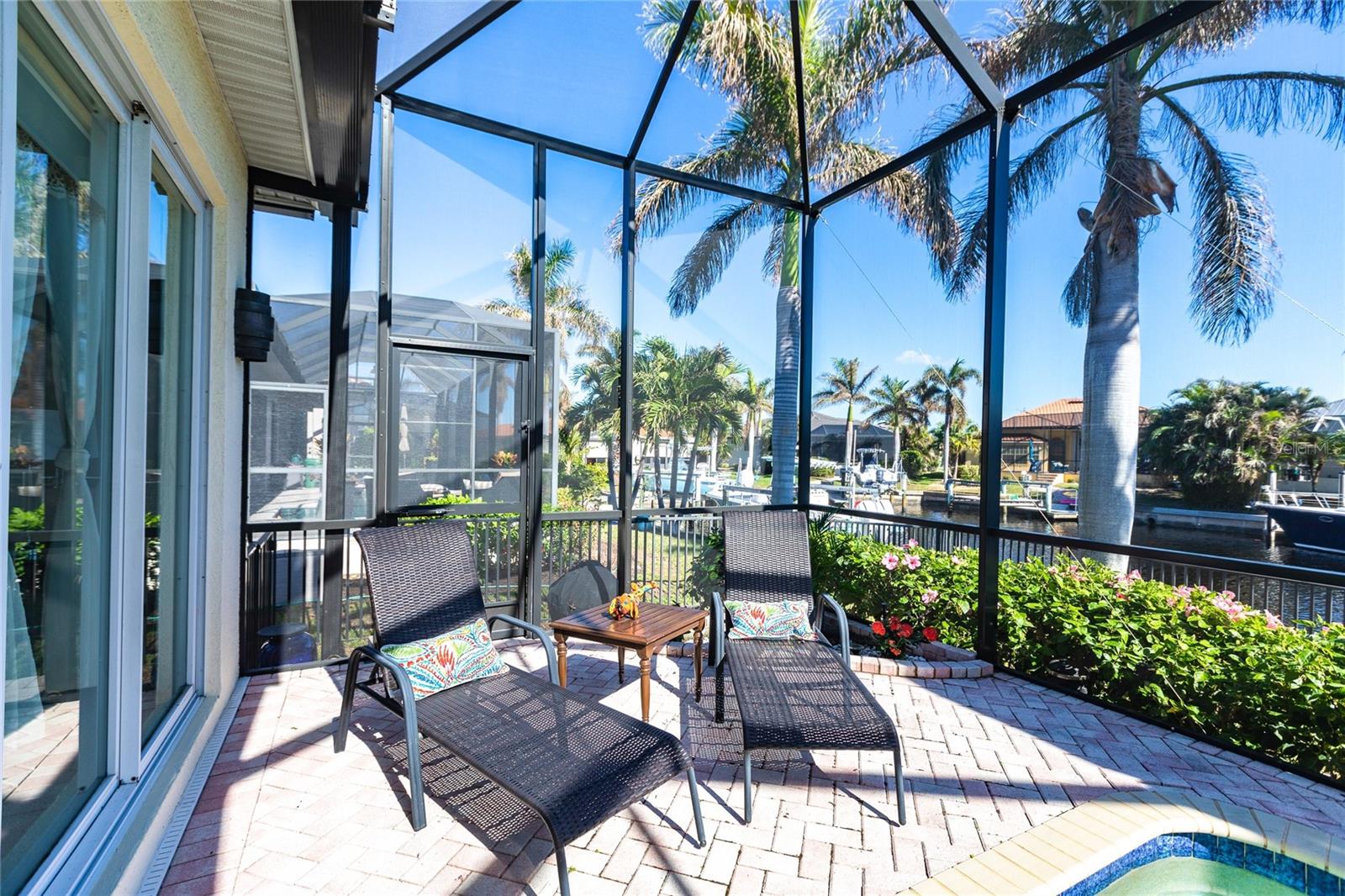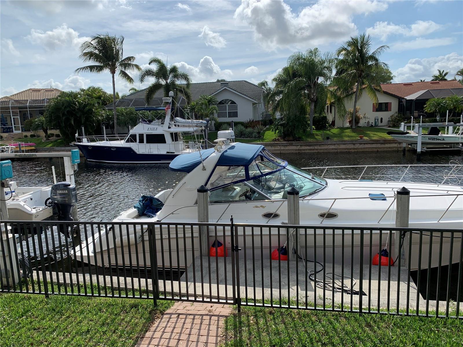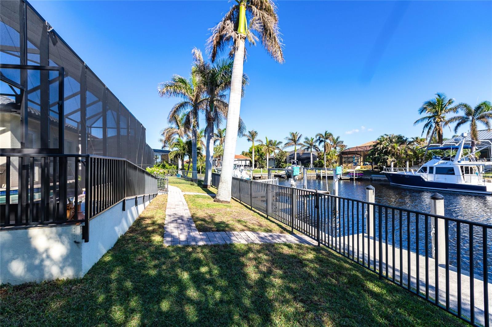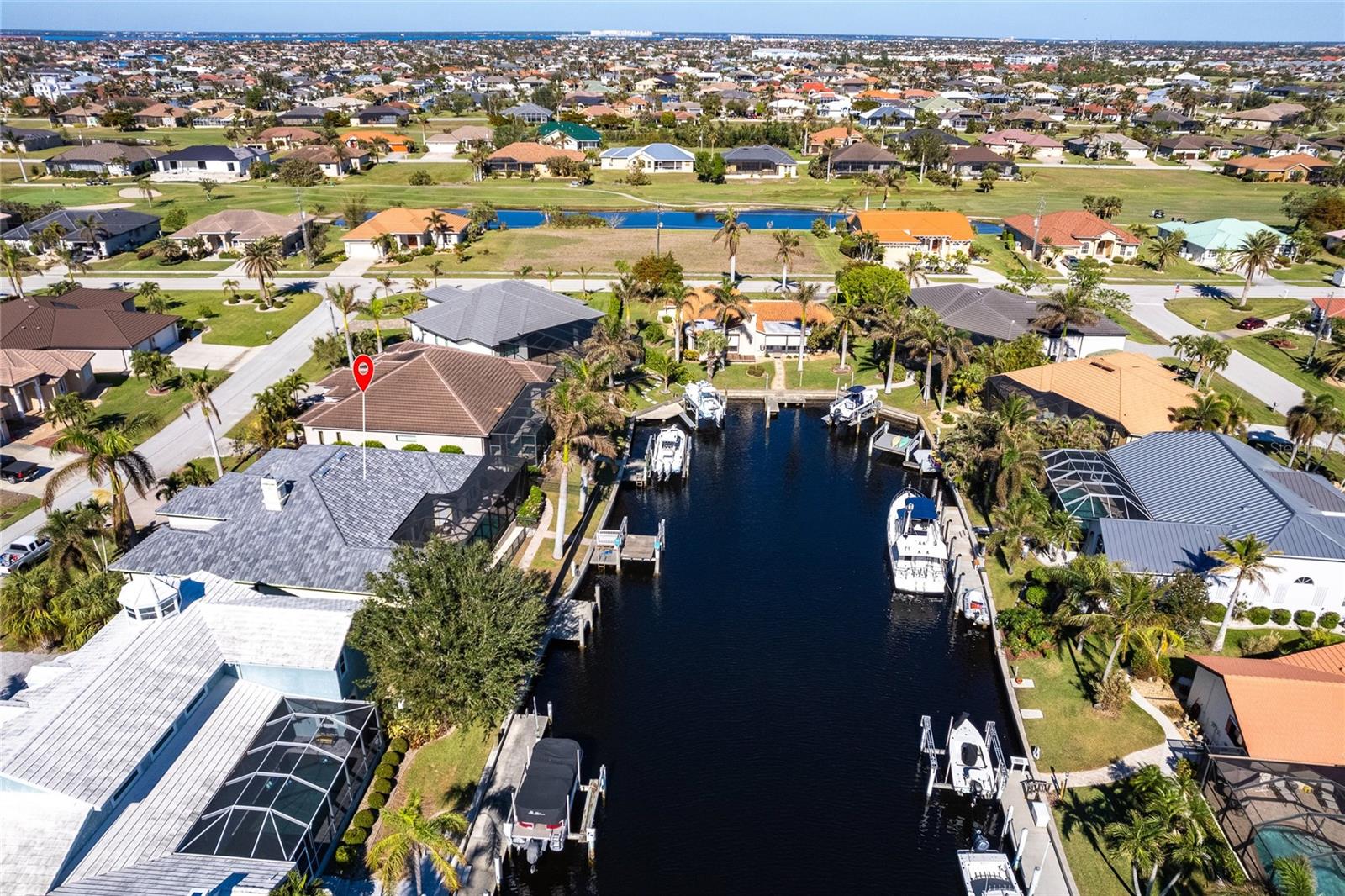 **Experience Waterfront Elegance and Boating Bliss** Indulge in the ultimate waterfront lifestyle with this luxurious 3-bedroom, 2-bathroom + den home, nestled along a deepwater canal just minutes from open water, and no bridges limiting height access. Designed for both comfort and sophistication, this exquisite property boasts two private docks, one equipped with a 10,000 lb boat lift and 30-amp power, offering the perfect haven for your boating adventures. Step into a home where refined details greet you at every turn. From the gleaming marble floors to the intricate coffered ceilings, the artistry and craftsmanship are undeniable. The expansive open-concept layout seamlessly connects the great room, formal dining area, and chef's kitchen, all framed by captivating views of the pool and canal. A wood-burning fireplace anchors the great room, providing warmth and ambiance, while columns, crown molding, transom windows, and arched entryways add architectural charm. The gourmet kitchen is a chef's dream, featuring granite countertops, custom wood cabinetry, a center island, breakfast bar, and premium stainless steel appliances, including a 6-burner gas range with hood and built-in double ovens. The adjacent breakfast nook is perfect for casual dining with serene water views. Retreat to the luxurious primary suite, a private sanctuary with lanai access, stunning canal views, and double walk-in closets. The spa-inspired primary bath offers a jetted garden tub, a dual-entry shower with twin showerheads, split vanities, and a private water closet. The split-bedroom floor plan ensures privacy, with two guest rooms, one with sliding door pool-access, and a pool-access guest bath. Step outside to your personal paradise. The expansive lanai features a brick-paver deck, a sparkling in-ground pool, and a summer kitchen complete with a JennAir grill, prep sink, and bar refrigerator--perfect for entertaining. The 85 ft. of water frontage includes a city-maintained seawall, and two concrete docks, complete with water and electric hookups, making this home a boater's dream. Additional features include whole-house hurricane protection with a mix of impact windows and shutters, a brand-new roof, an oversized two-car garage, a built-in wall safe, and a network hub in the laundry room. This home combines elegant waterfront living with practical functionality, offering the ultimate Florida lifestyle. Additional amenities of Punta Gorda Isles include the St. Andrews Golf Course, Punta Gorda Nature Park, and biking trails throughout. Paradise is possible for you in this stunning home!