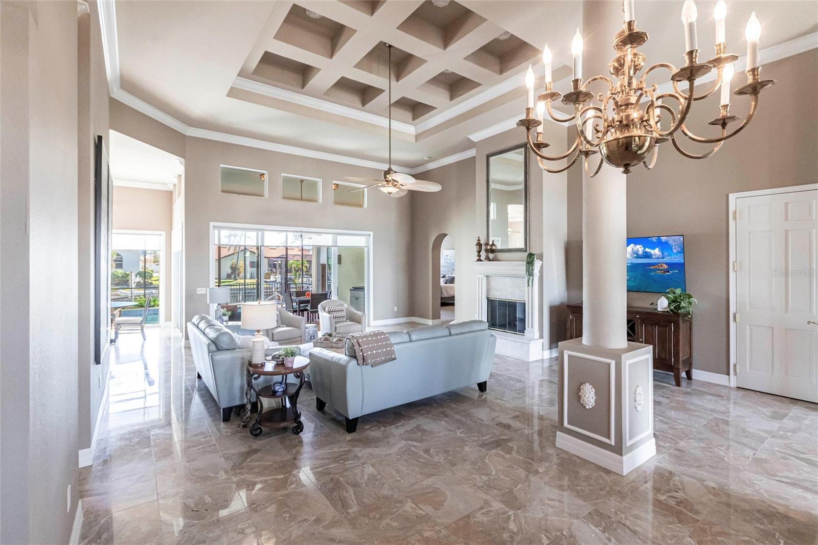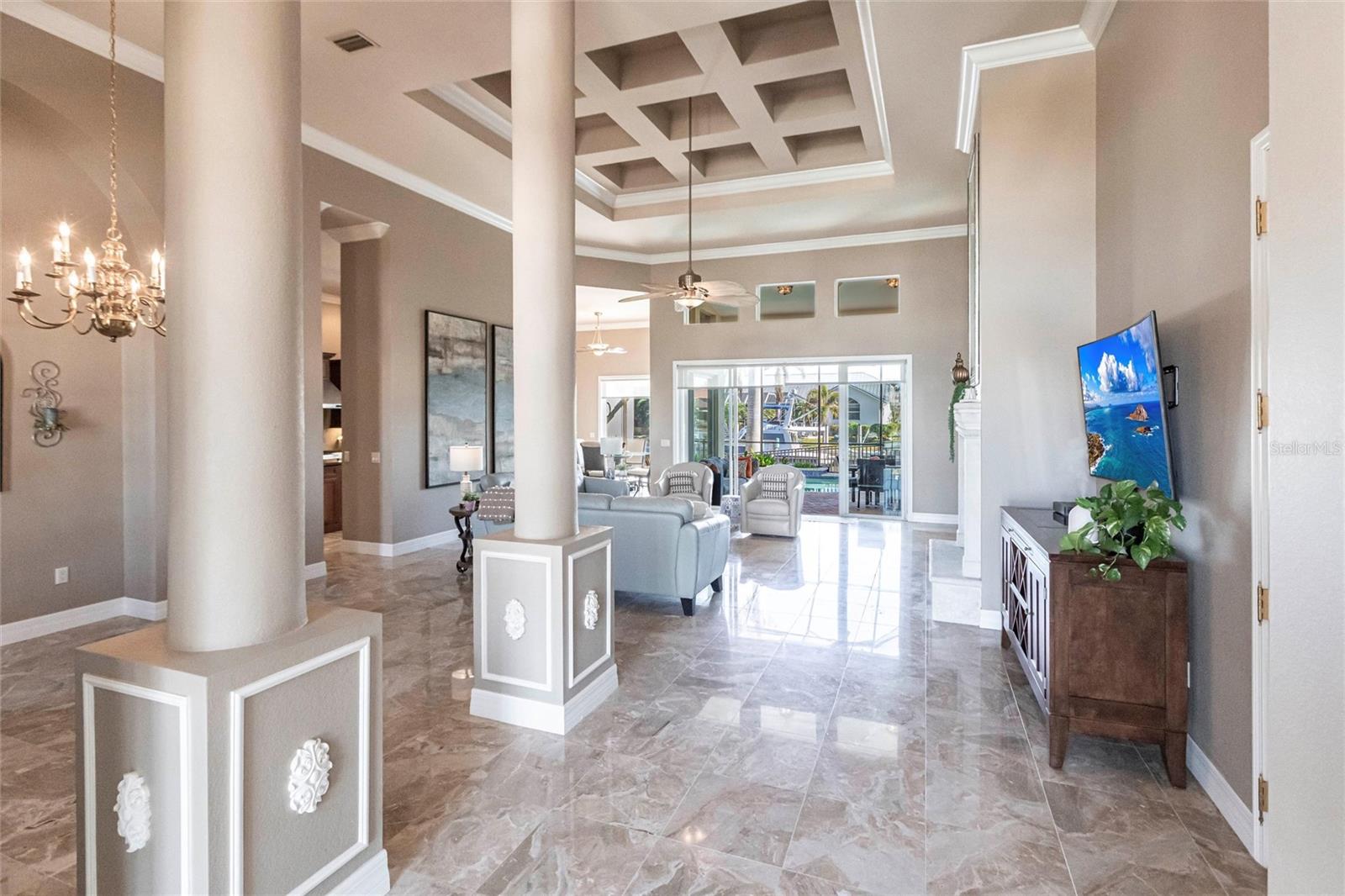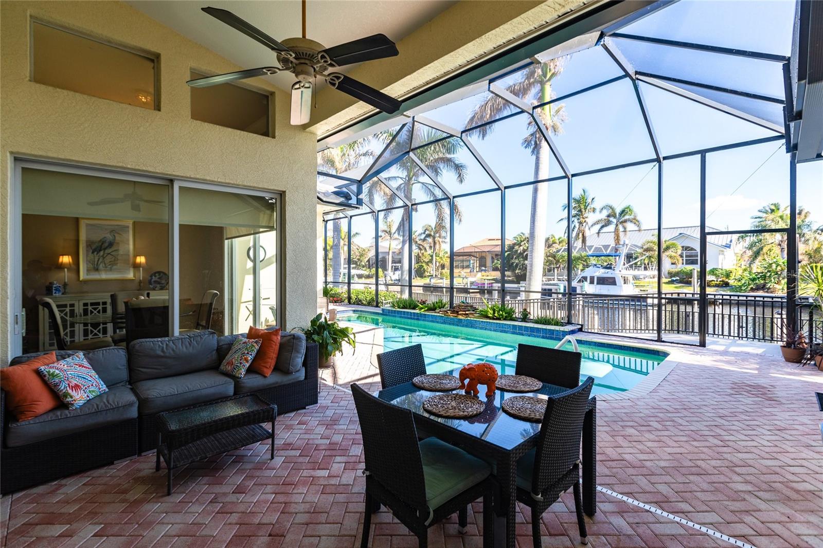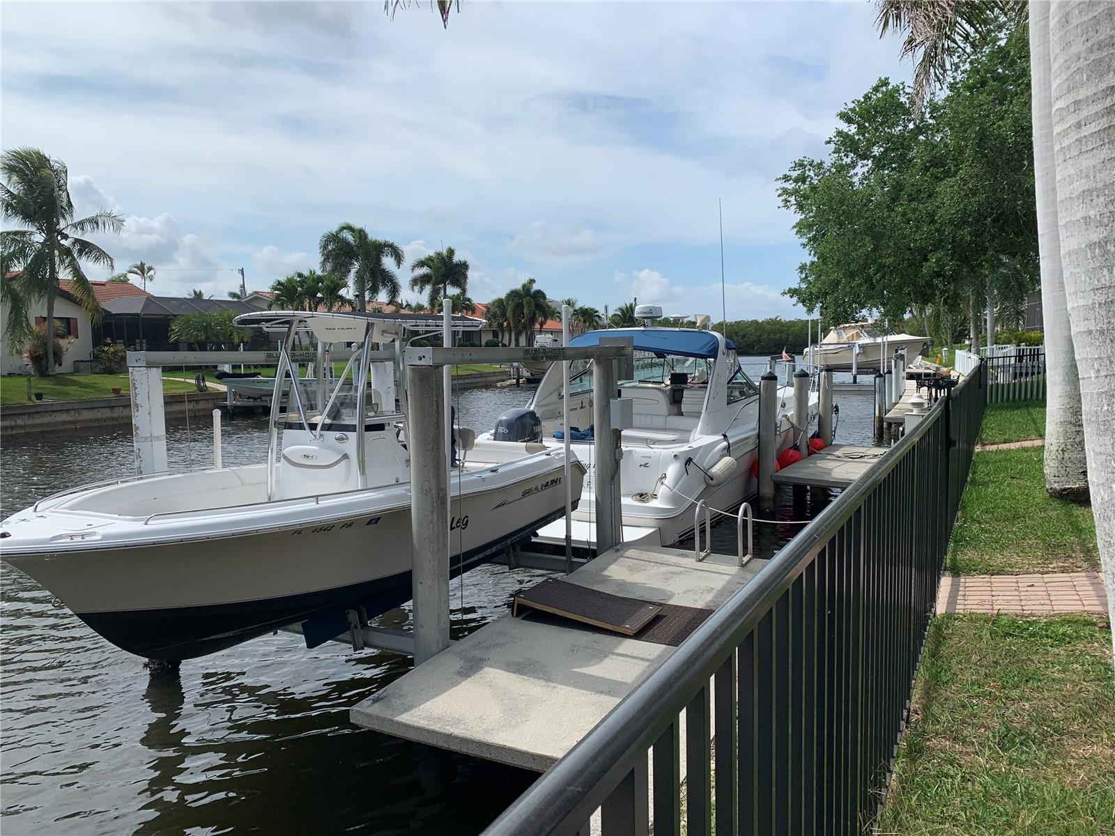 **Experience Waterfront Elegance and Boating Bliss** Indulge in the ultimate waterfront lifestyle with this luxurious 3-bedroom, 2-bathroom + den home, nestled along a deepwater canal just minutes from open water, and no bridges limiting height access. Designed for both comfort and sophistication, this exquisite property boasts two private docks, one equipped with a 10,000 lb boat lift and 30-amp power, offering the perfect haven for your boating adventures. Step into a home where refined details greet you at every turn. From the gleaming marble floors to the intricate coffered ceilings, the artistry and craftsmanship are undeniable. The expansive open-concept layout seamlessly connects the great room, formal dining area, and chef's kitchen, all framed by captivating views of the pool and canal. A wood-burning fireplace anchors the great room, providing warmth and ambiance, while columns, crown molding, transom windows, and arched entryways add architectural charm. The gourmet kitchen is a chef's dream, featuring granite countertops, custom wood cabinetry, a center island, breakfast bar, and premium stainless steel appliances, including a 6-burner gas range with hood and built-in double ovens. The adjacent breakfast nook is perfect for casual dining with serene water views. Retreat to the luxurious primary suite, a private sanctuary with lanai access, stunning canal views, and double walk-in closets. The spa-inspired primary bath offers a jetted garden tub, a dual-entry shower with twin showerheads, split vanities, and a private water closet. The split-bedroom floor plan ensures privacy, with two guest rooms, one with sliding door pool-access, and a pool-access guest bath. Step outside to your personal paradise. The expansive lanai features a brick-paver deck, a sparkling in-ground pool, and a summer kitchen complete with a JennAir grill, prep sink, and bar refrigerator--perfect for entertaining. The 85 ft. of water frontage includes a city-maintained seawall, and two concrete docks, complete with water and electric hookups, making this home a boater's dream. Additional features include whole-house hurricane protection with a mix of impact windows and shutters, a brand-new roof, an oversized two-car garage, a built-in wall safe, and a network hub in the laundry room. This home combines elegant waterfront living with practical functionality, offering the ultimate Florida lifestyle. Additional amenities of Punta Gorda Isles include the St. Andrews Golf Course, Punta Gorda Nature Park, and biking trails throughout. Paradise is possible for you in this stunning home!