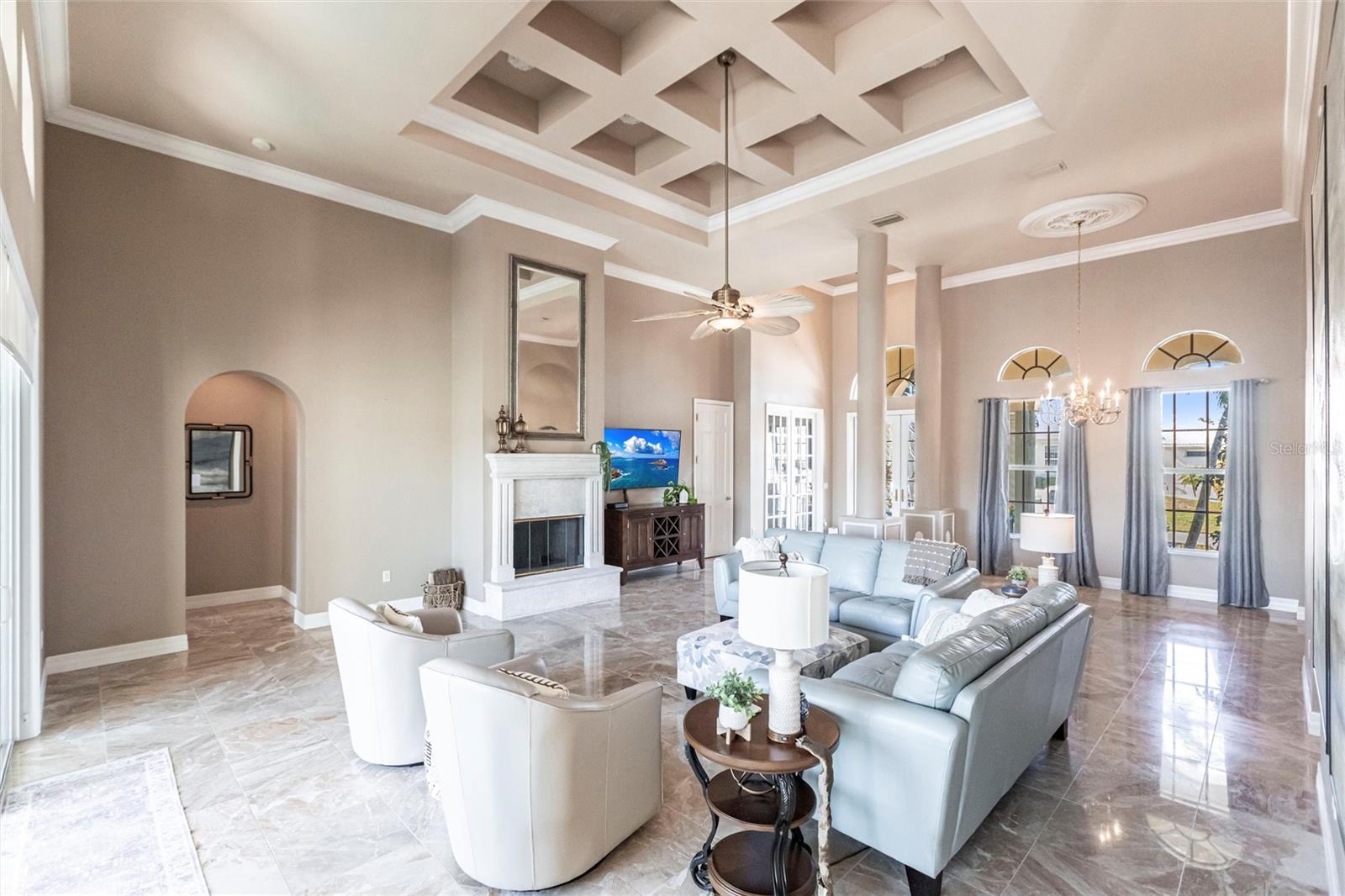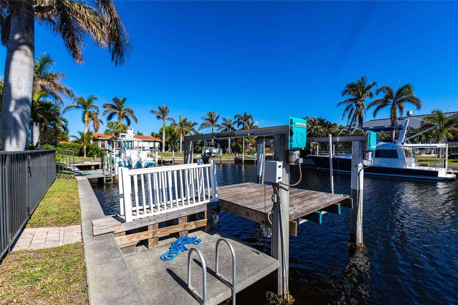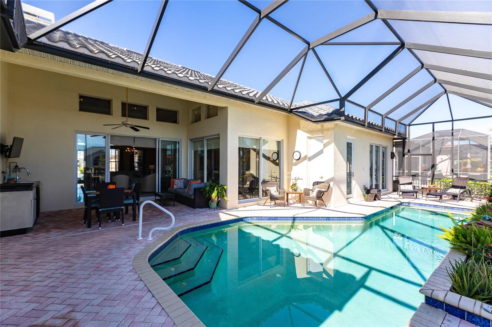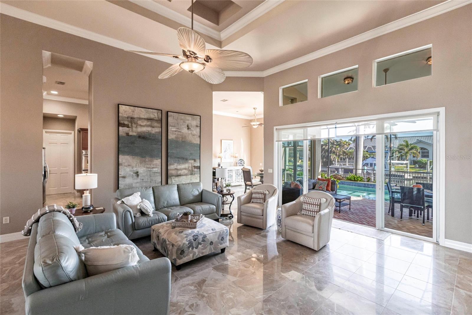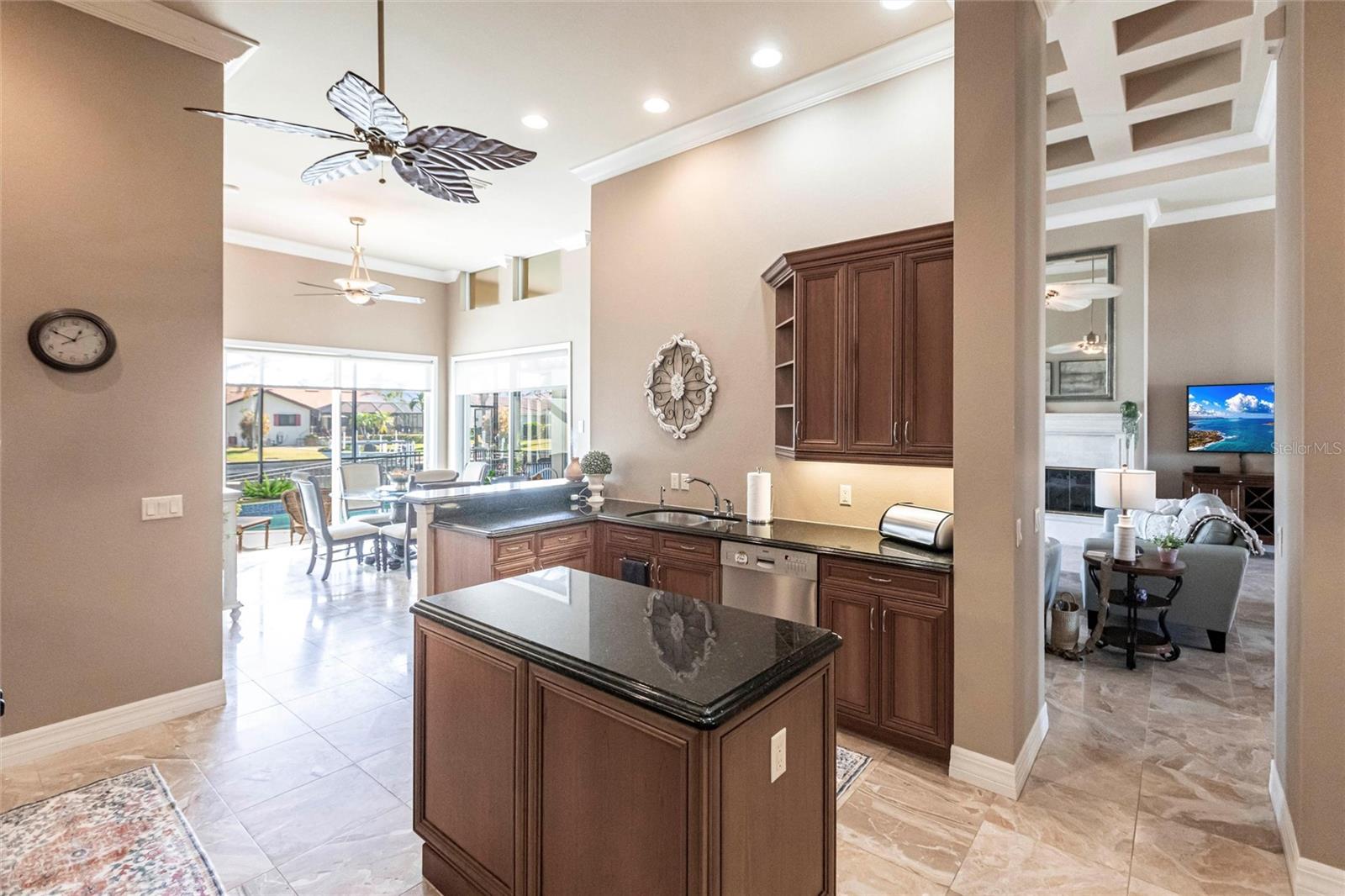 **Experience Waterfront Elegance and Boating Bliss** Indulge in the ultimate waterfront lifestyle with this luxurious 3-bedroom, 2-bathroom + den home, nestled along a deepwater canal just minutes from open water, and no bridges limiting height access. Designed for both comfort and sophistication, this exquisite property boasts two private docks, one equipped with a 10,000 lb boat lift and 30-amp power, offering the perfect haven for your boating adventures. Step into a home where refined details greet you at every turn. From the gleaming marble floors to the intricate coffered ceilings, the artistry and craftsmanship are undeniable. The expansive open-concept layout seamlessly connects the great room, formal dining area, and chef's kitchen, all framed by captivating views of the pool and canal. A wood-burning fireplace anchors the great room, providing warmth and ambiance, while columns, crown molding, transom windows, and arched entryways add architectural charm. The gourmet kitchen is a chef's dream, featuring granite countertops, custom wood cabinetry, a center island, breakfast bar, and premium stainless steel appliances, including a 6-burner gas range with hood and built-in double ovens. The adjacent breakfast nook is perfect for casual dining with serene water views. Retreat to the luxurious primary suite, a private sanctuary with lanai access, stunning canal views, and double walk-in closets. The spa-inspired primary bath offers a jetted garden tub, a dual-entry shower with twin showerheads, split vanities, and a private water closet. The split-bedroom floor plan ensures privacy, with two guest rooms, one with sliding door pool-access, and a pool-access guest bath. Step outside to your personal paradise. The expansive lanai features a brick-paver deck, a sparkling in-ground pool, and a summer kitchen complete with a JennAir grill, prep sink, and bar refrigerator--perfect for entertaining. The 85 ft. of water frontage includes a city-maintained seawall, and two concrete docks, complete with water and electric hookups, making this home a boater's dream. Additional features include whole-house hurricane protection with a mix of impact windows and shutters, a brand-new roof, an oversized two-car garage, a built-in wall safe, and a network hub in the laundry room. This home combines elegant waterfront living with practical functionality, offering the ultimate Florida lifestyle. Additional amenities of Punta Gorda Isles include the St. Andrews Golf Course, Punta Gorda Nature Park, and biking trails throughout. Paradise is possible for you in this stunning home!