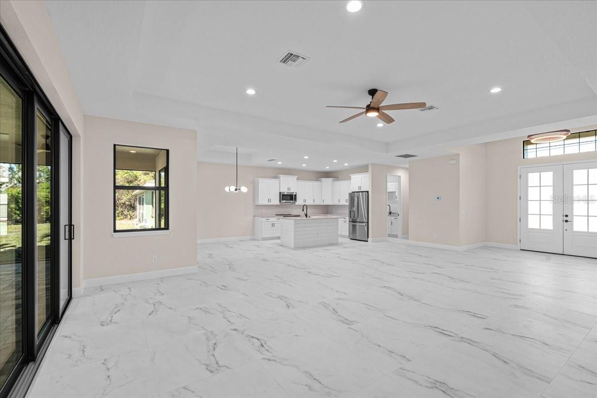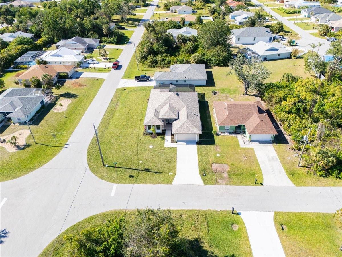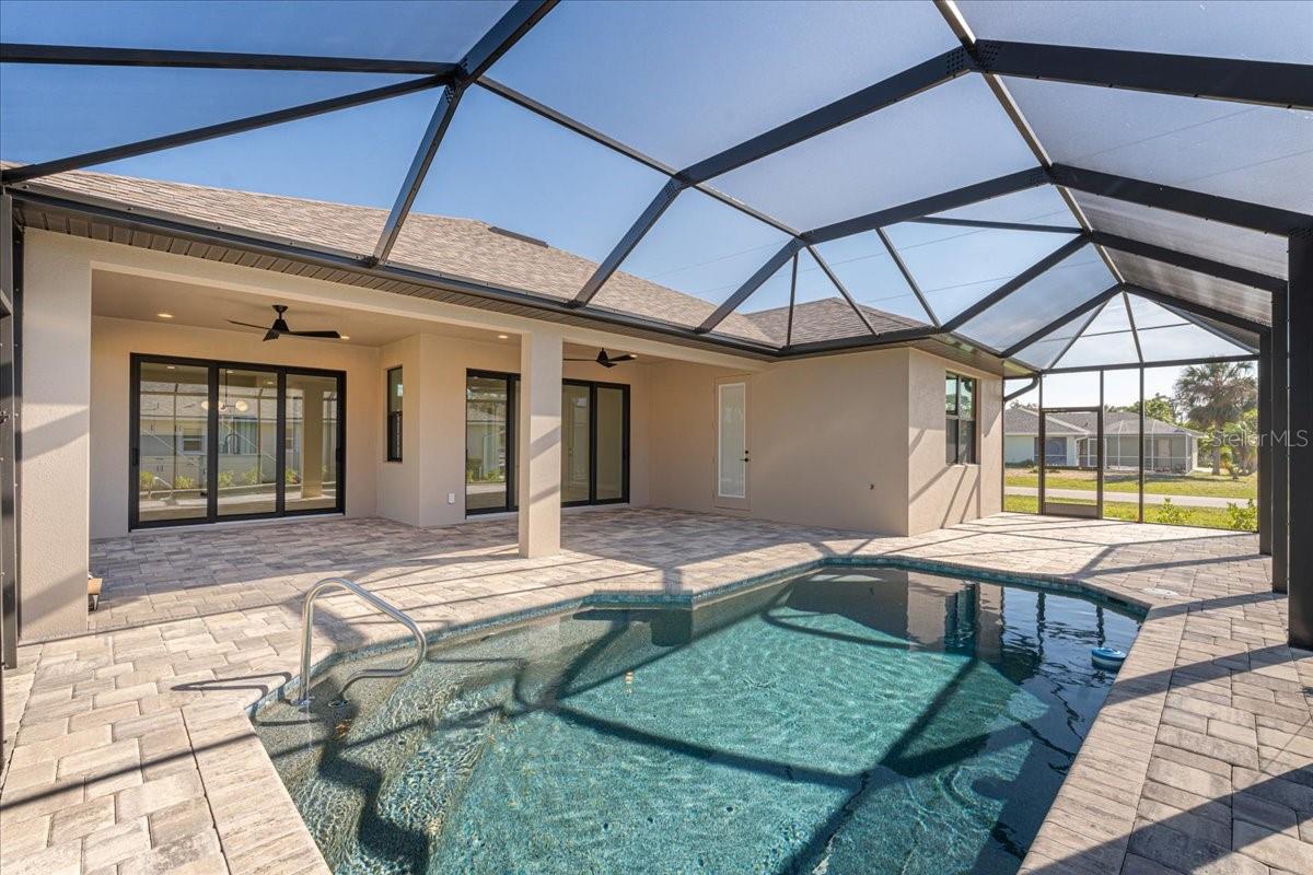 Welcome to 112 Sidney Ct in the desirable Rotonda Heights community! This brand-new construction, built by JWM Residential LLC, is move-in ready and packed with luxurious features. Situated on a corner lot in a low risk X Flood zone, this stunning 3-bedroom, 2-bathroom home showcases an open-concept design with 9'4" ceilings and tray ceilings in the living room, dining area, and Primary Suite for added elegance.Step outside to your private oasis, featuring a screened-in lanai, a spacious paver pool deck, and a 21x12 Pebble-Tec concrete pool. The pool area is seamlessly connected to the home with quadruple sliders from the living room, triple sliders from the dining area, and direct access from the Primary Suite.Inside, enjoy porcelain tile flooring throughout, quartz countertops, and a chef's kitchen complete with upgraded GE Profile appliances, a tile backsplash, and LED lighting. The Primary Suite offers dual walk-in closets, dual sinks, a private water closet, and lanai access. Additional features include Hurricane Impact windows, sliders, and doors, an 8-foot garage door, recessed LED lighting, and a large laundry room with full cabinetry.The beautifully landscaped yard is fully irrigated with a RainBird system, and 360-degree seamless gutters provide efficient water management. The textured Spraycrete front porch and epoxy-coated garage floor add the perfect finishing touches to this incredible home. Schedule your showing today and make 112 Sidney Ct your forever home!