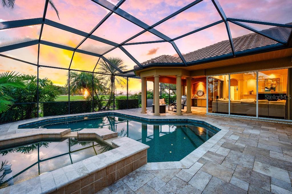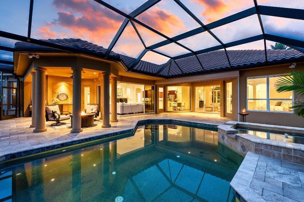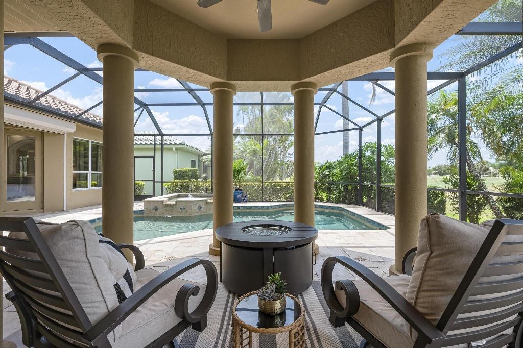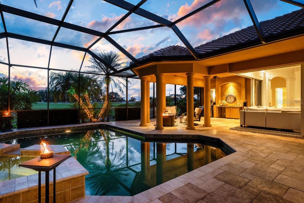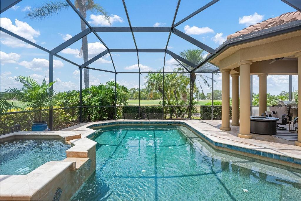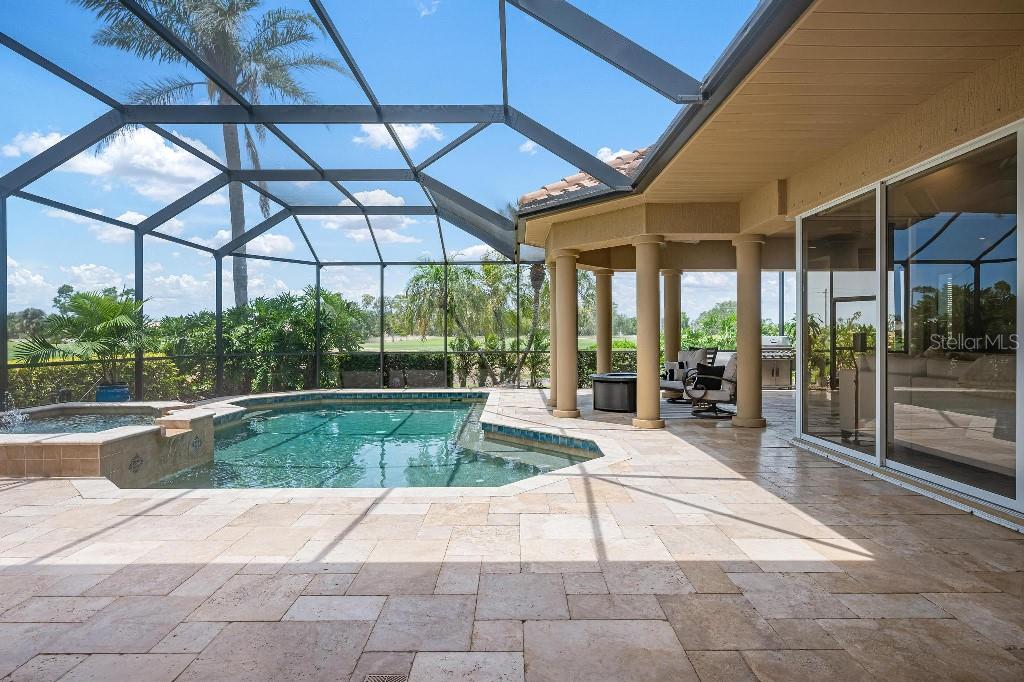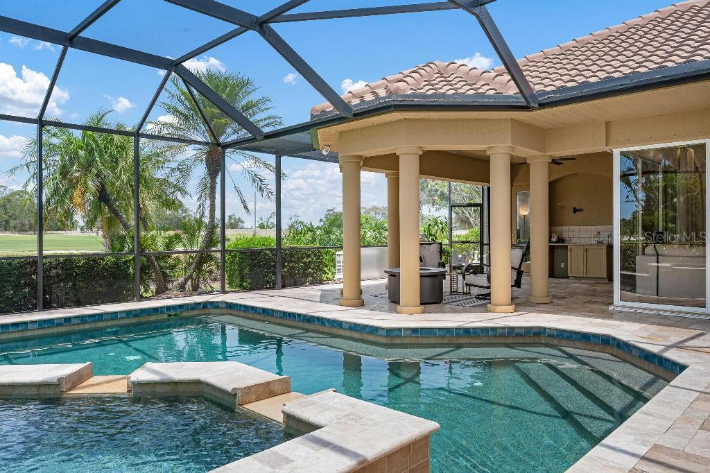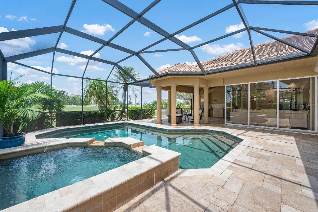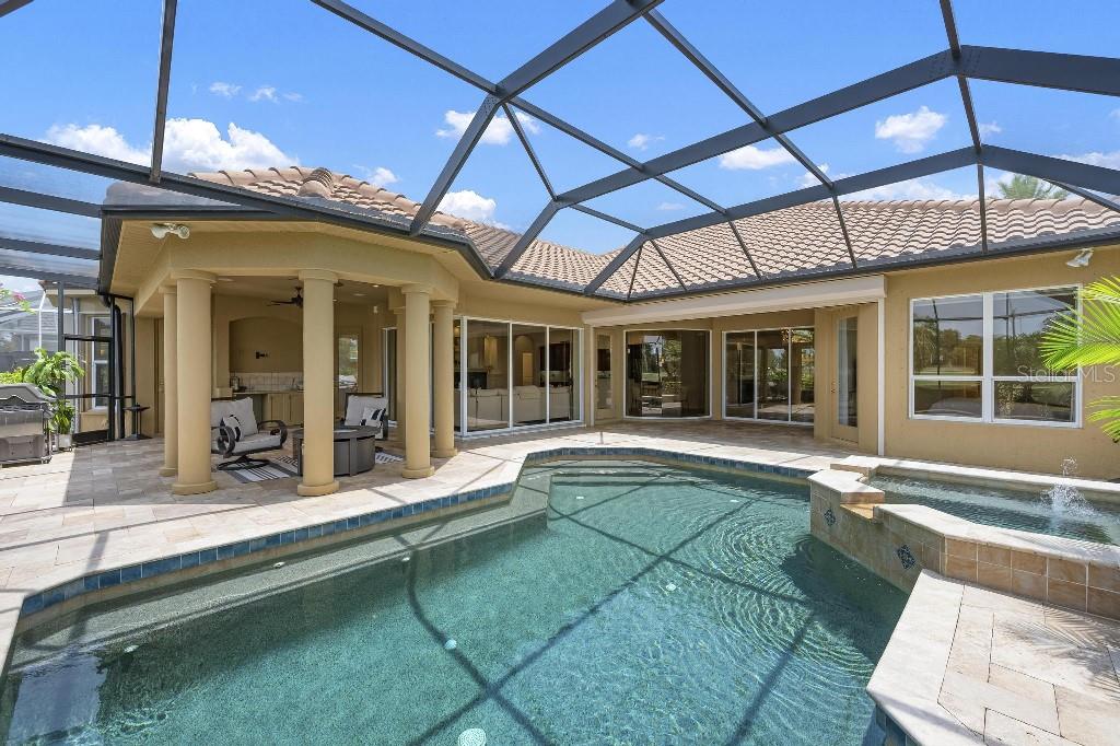 Experience the ultimate Florida lifestyle in the exclusive, award-winning gated community of Pelican Pointe Golf and Country Club. This Arthur Rutenberg-designed home offers the perfect blend of luxury, comfort, and resort-style living. With 3 bedrooms, 3 full bathrooms, a versatile den/office/bonus room, a Pebble Tec heated pool and spa, plus a large 3-car garage, this home is designed for both style and practicality. Enjoy the assurance and peace of mind of the recently installed tile roof (2023), equipped with a whole-house 22kw Generac generator with a buried 500 gallon natural gas tank, added safety and convenience with impact windows in the front of the home, electric storm shutters across the back lanai and accordion for the side windows. Step inside to high-end details, including soaring 10 and 12-foot ceilings with crown molding, 8-foot doors. The chef-inspired kitchen boasts 42" solid wood cabinets with pull-out shelving, high-end Kitchen Aid appliances. Designer touches include new pendant lights, under cabinet lighting, full-length aquarium window. A whole-house water filtration system and water softener, plus an under-the-counter reverse osmosis for the kitchen. Enjoy the convenience of a central vacuum system for everyday ease, and surround sound ceiling speakers throughout the home for both indoor and outdoor entertainment. The luxurious primary suite features a spa-inspired en suite bath with a walk-in Roman shower, soaking tub, dual sinks, a private water closet, and added luxury of 2 separate walk-in closets. The open concept design allows natural light to flood the home with a dramatic zero corner sliding glass doors for a seamless indoor-outdoor resort-style living space on your 15x24 covered cabana with a built-in wet bar. Surround yourself with elegance as you step onto the timeless beauty of Travertine pavers around the pool to watch the perfect sunsets! Additional upgrades include: (2025)Pentair 3.0 hp WiFi pool pump, (2025) water Heater with a recirculation system for instant hot water, (2023)Tile Roof, (2024)New professionally painted interior, including ceilings and trim, Sherwin Williams (2025)New interior doors, (2025) Custom closet doors, (2024) New carpet in all bedrooms, (2024) Window treatments and shades, (2024) Electrolux washer and dryer, (2025) Interior Lighting. Low HOA fees include lawn care, ground maintenance, cable TV, Internet, 24-hour Guard, irrigation, social membership, Fitness center, heated pool, tennis, and pickleball. Pelican Pointe offers unparalleled amenities that cater to every lifestyle with a full-service clubhouse with restaurant and bar, as well as a Golf Pro shop. For the golf enthusiasts, the 27-hole championship golf course, membership optional! Schedule your showing today. Visit the Website for additional pictures and info.