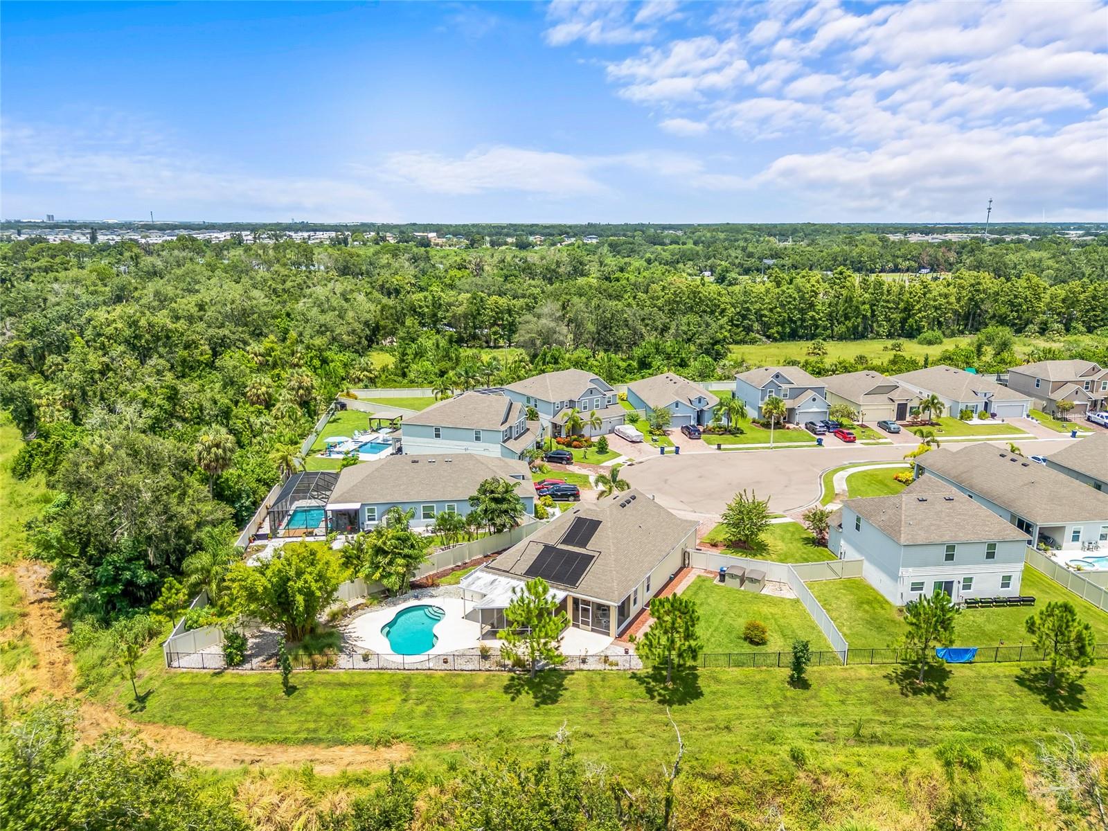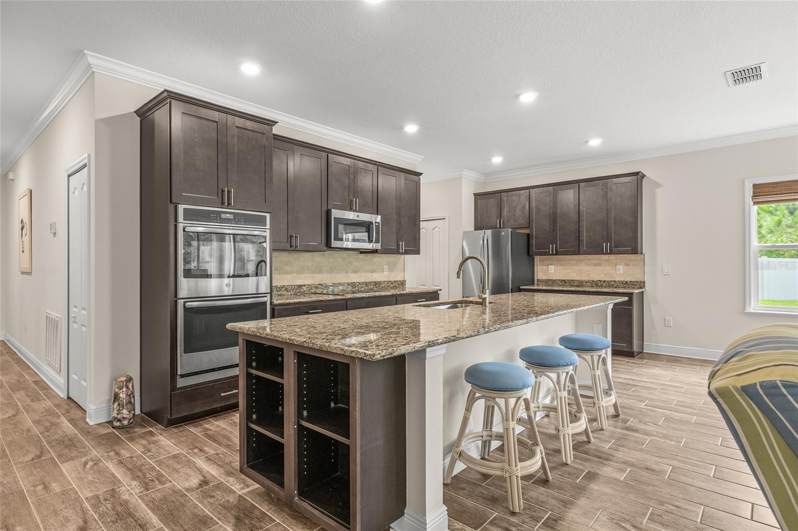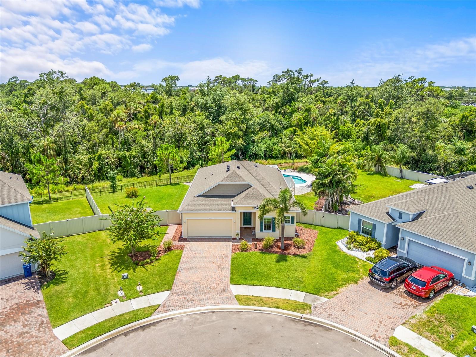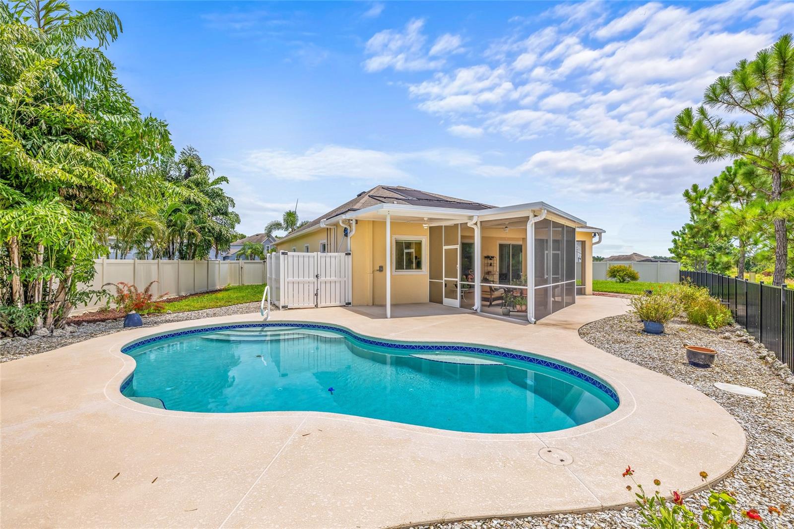 Tucked away at the end of a quiet cul-de-sac in the desirable Heron Creek community, this beautifully maintained 2018-built pool home offers 1,878 sq ft of thoughtfully designed living space. The open-concept floor planfeatures three spacious bedrooms and two full bathrooms, including a master suite with dual vanities and a luxurious rainfall shower for a spa-like experience. The kitchen is outfitted with high-end Wolf wood cabinetry,GE appliances including two self-cleaning ovens, and an oversized stainless steel sink with a Pfister kitchen faucet. You'll also appreciate the convenience of a pantry and USB/electrical outlets for easy device charging.Throughout the home, quality finishes such as granite countertops, brushed nickel light fixtures, and Kwikset satin nickel hardware add a touch of elegance. Step out to the generous screened lanai overlooking yoursolar-heated pool with automatic chlorine feed--a perfect setting for relaxing or entertaining. The .27-acre fenced backyard backs to open space with no rear neighbors, ensuring privacy and tranquility. Impact-grade,low-E dual pane vinyl windows provide added security and energy efficiency, complemented by R-30 ceiling insulation and a high-efficiency Trane heat pump with variable speed A/C. Additional features include an 8'8"first-floor ceiling height, Classique-style raised panel interior doors, decorative wood window sills, wall-to-wall carpet, Plank tile. The home is built with structural steel-reinforced concrete block exterior walls and a 10-yearstructural warranty for peace of mind, with hurricane shutters included. Outside, a brick driveway and walkway enhance the curb appeal, while a two-car garage offers ample storage space. Low HOA fees and no CDDcharges make this home an excellent value. Located in Flood Zone X with no flooding history, making flood insurance is not required. This move-in-ready home perfectly balances comfort, style, and functionality in one ofthe area's most sought-after neighborhoods.