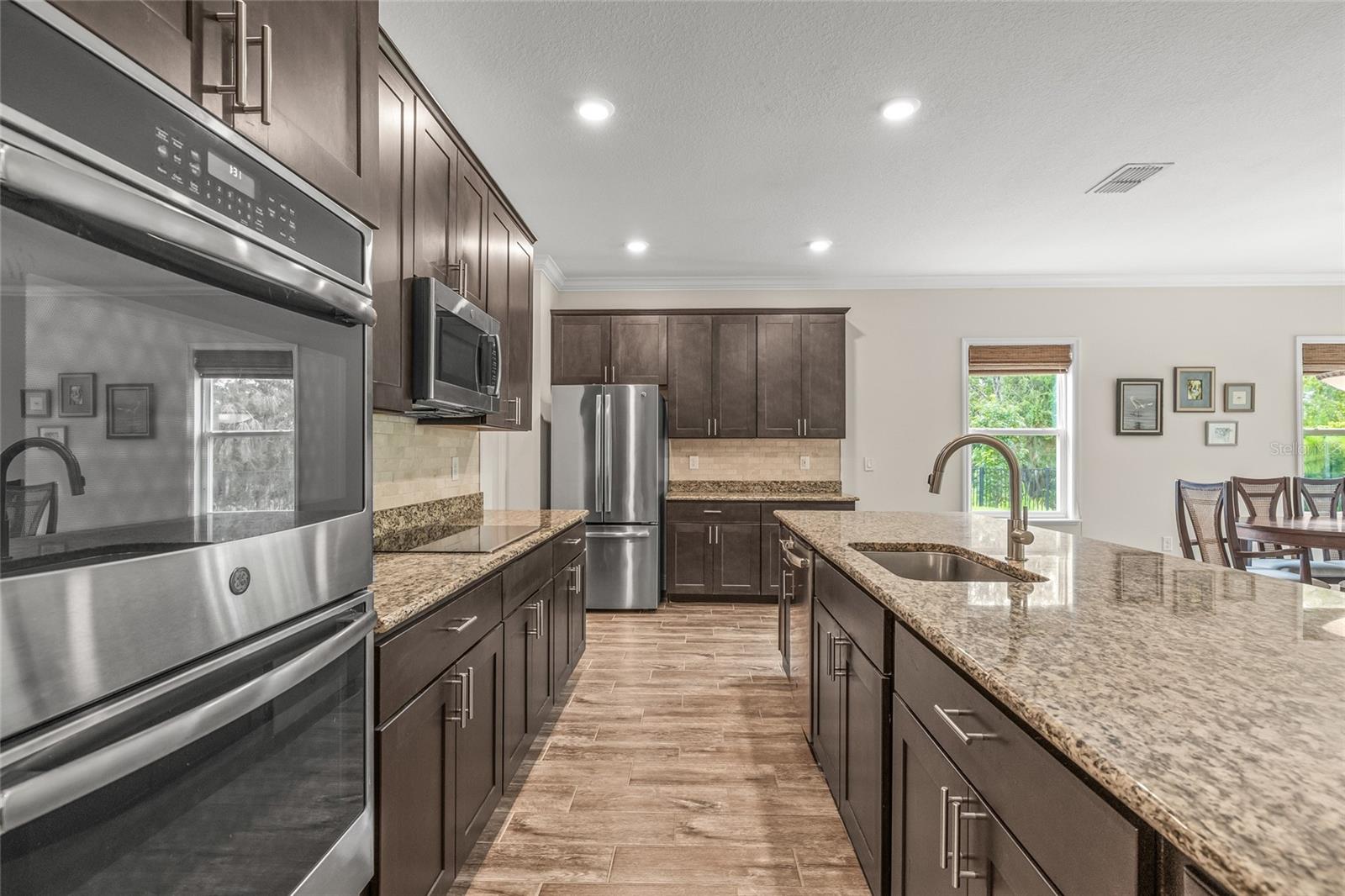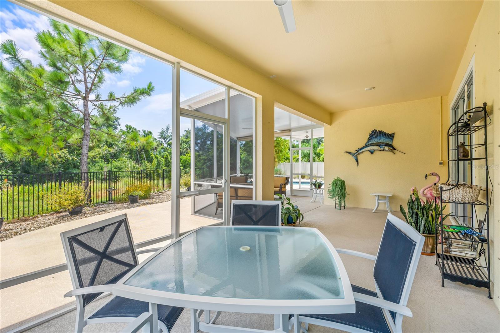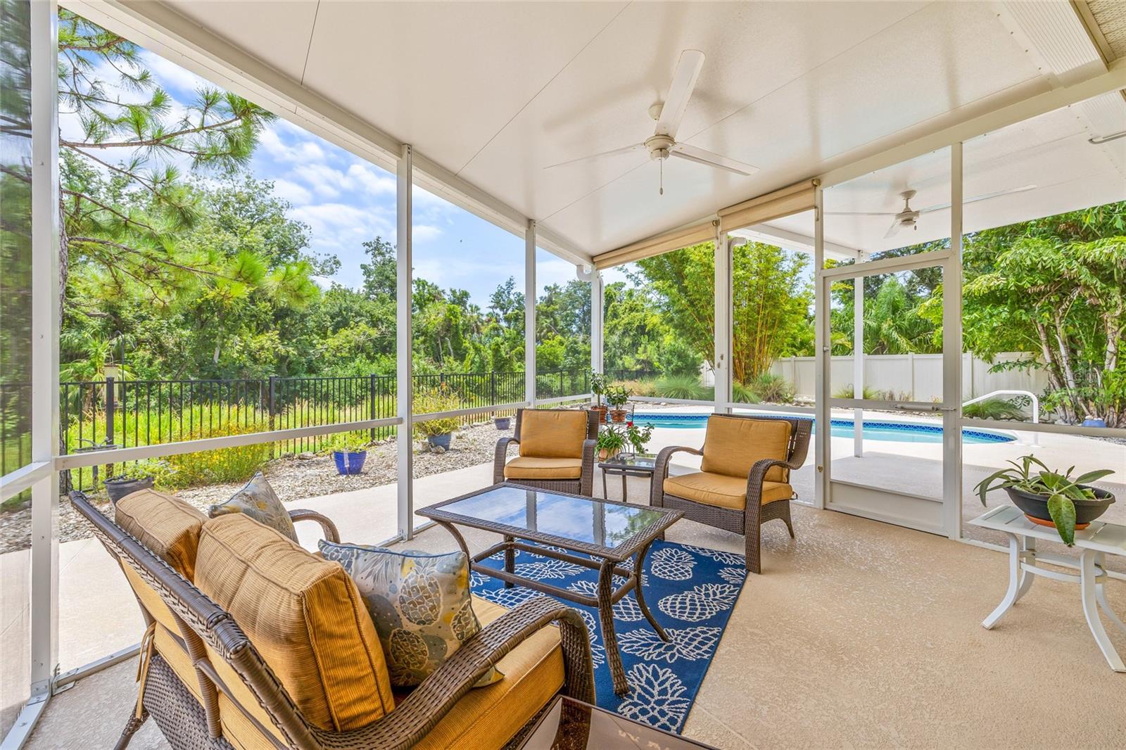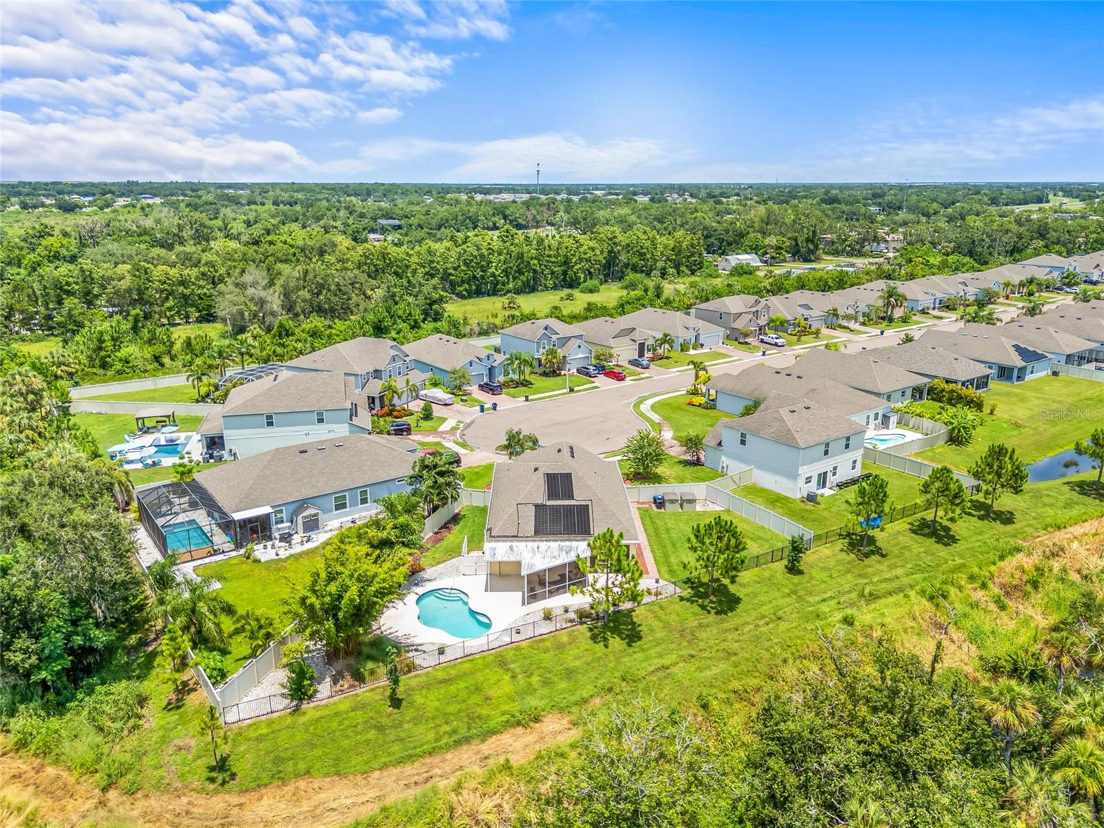 Tucked away at the end of a quiet cul-de-sac in the desirable Heron Creek community, this beautifully maintained 2018-built pool home offers 1,878 sq ft of thoughtfully designed living space. The open-concept floor planfeatures three spacious bedrooms and two full bathrooms, including a master suite with dual vanities and a luxurious rainfall shower for a spa-like experience. The kitchen is outfitted with high-end Wolf wood cabinetry,GE appliances including two self-cleaning ovens, and an oversized stainless steel sink with a Pfister kitchen faucet. You'll also appreciate the convenience of a pantry and USB/electrical outlets for easy device charging.Throughout the home, quality finishes such as granite countertops, brushed nickel light fixtures, and Kwikset satin nickel hardware add a touch of elegance. Step out to the generous screened lanai overlooking yoursolar-heated pool with automatic chlorine feed--a perfect setting for relaxing or entertaining. The .27-acre fenced backyard backs to open space with no rear neighbors, ensuring privacy and tranquility. Impact-grade,low-E dual pane vinyl windows provide added security and energy efficiency, complemented by R-30 ceiling insulation and a high-efficiency Trane heat pump with variable speed A/C. Additional features include an 8'8"first-floor ceiling height, Classique-style raised panel interior doors, decorative wood window sills, wall-to-wall carpet, Plank tile. The home is built with structural steel-reinforced concrete block exterior walls and a 10-yearstructural warranty for peace of mind, with hurricane shutters included. Outside, a brick driveway and walkway enhance the curb appeal, while a two-car garage offers ample storage space. Low HOA fees and no CDDcharges make this home an excellent value. Located in Flood Zone X with no flooding history, making flood insurance is not required. This move-in-ready home perfectly balances comfort, style, and functionality in one ofthe area's most sought-after neighborhoods.