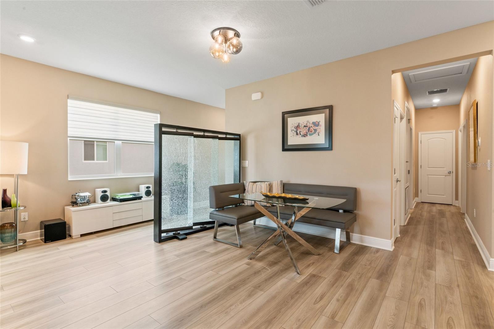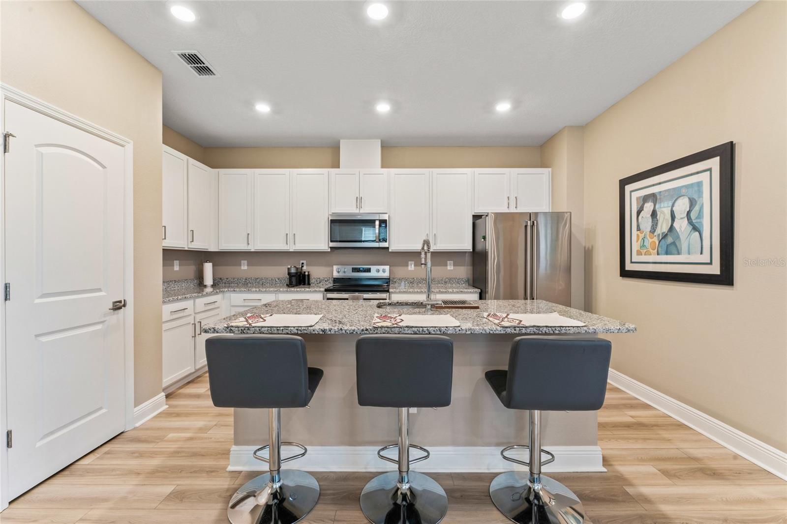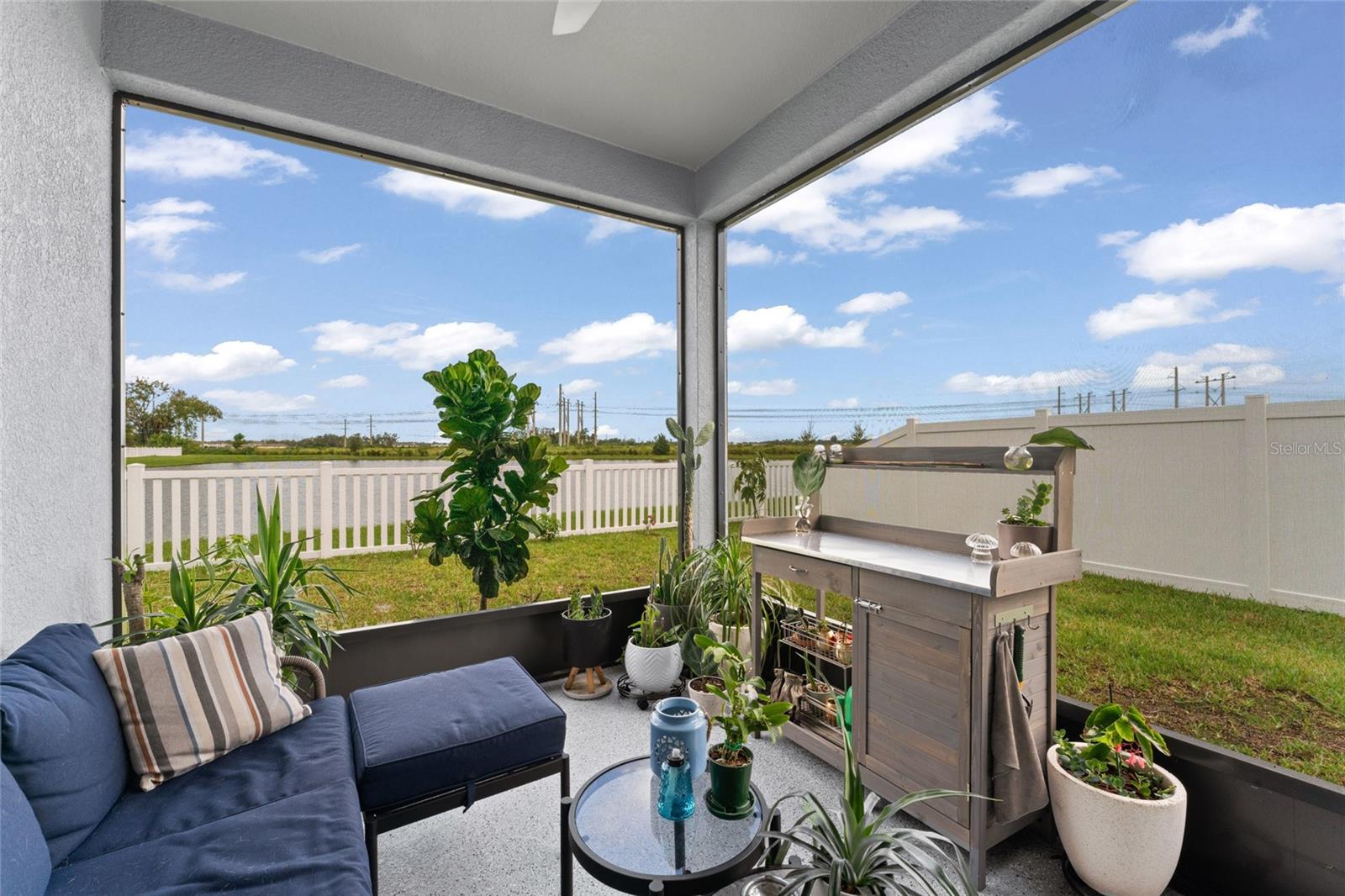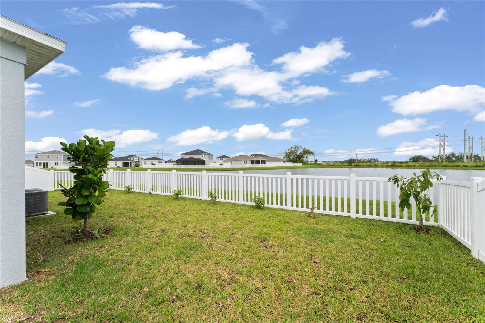 Sawgrass Lakes features this beautiful 3-bedroom, 2-bathroom home with a stunning pond view. Luxury vinyl plank flooring runs throughout the entire residence. The kitchen boasts 42-inch white cabinets, granite countertops, and stainless steel appliances, and it overlooks the dining and living areas. The split-bedroom layout provides privacy for both guests and family. The primary suite includes a walk-in closet and a spacious en-suite bathroom. The secondary bedrooms also have walk-in closets. Relax and enjoy the pond view from the screened lanai with epoxy flooring. Additional upgrades include an epoxy garage floor, a vinyl-fenced yard, upgraded appliances, including a washer and dryer, knobs & handles on cabinets and drawers, custom lighting fixtures, upgraded paint, and enhanced landscaping throughout the exterior, pavered driveway and sidewalk.