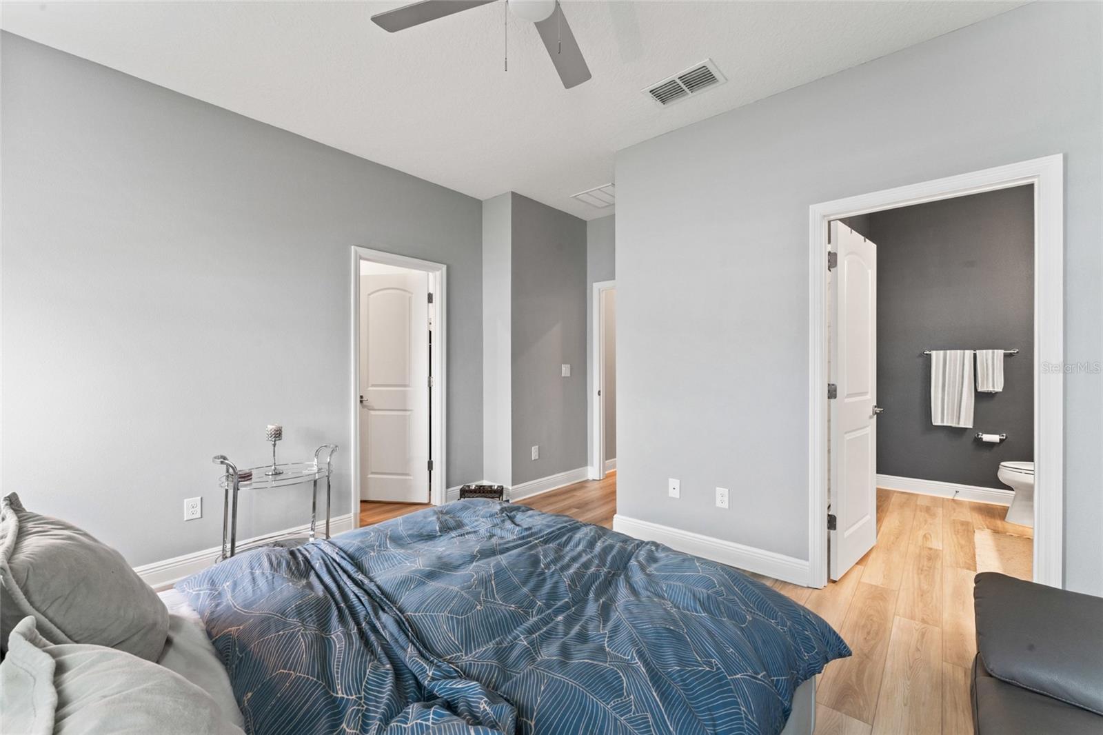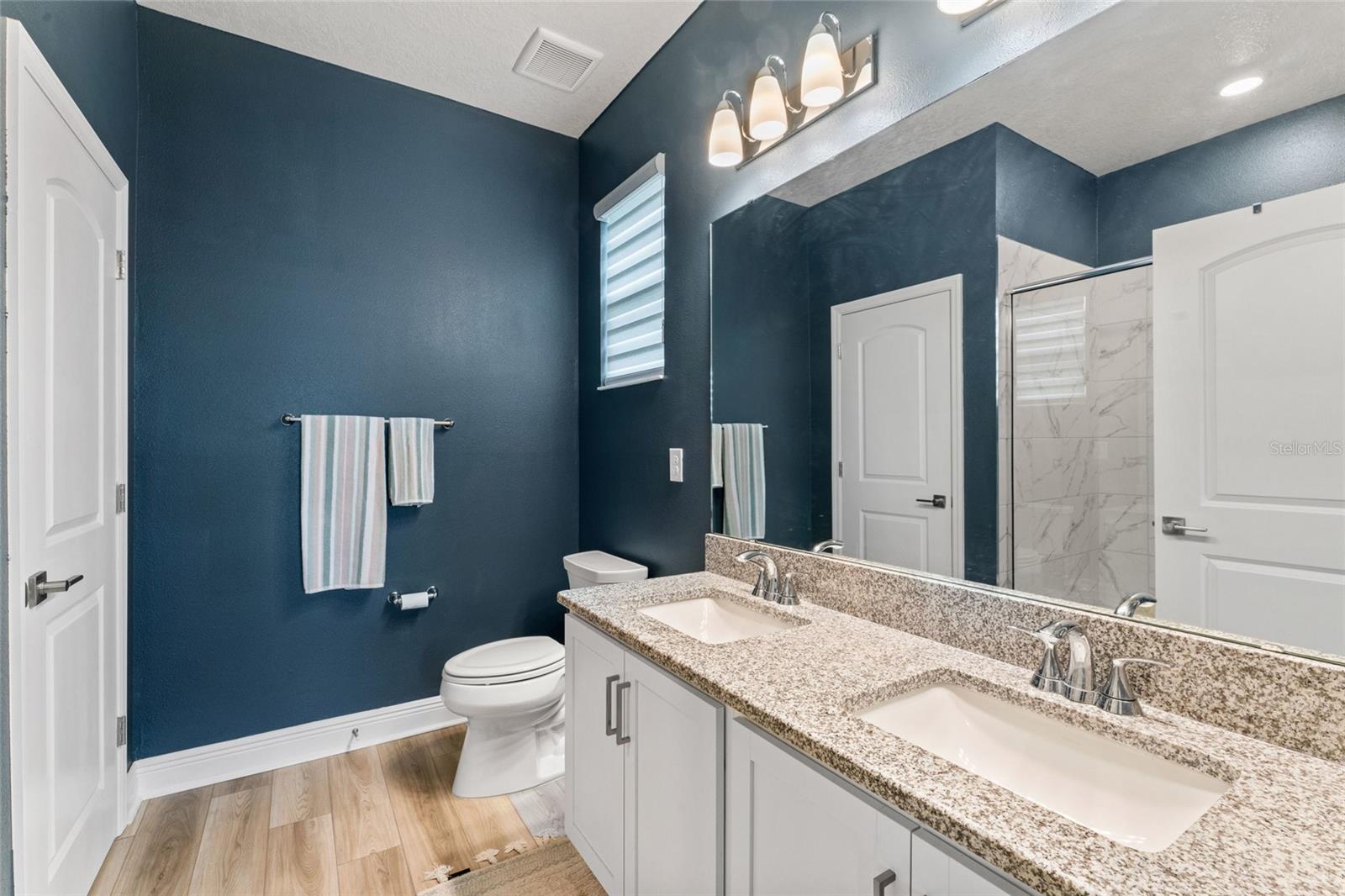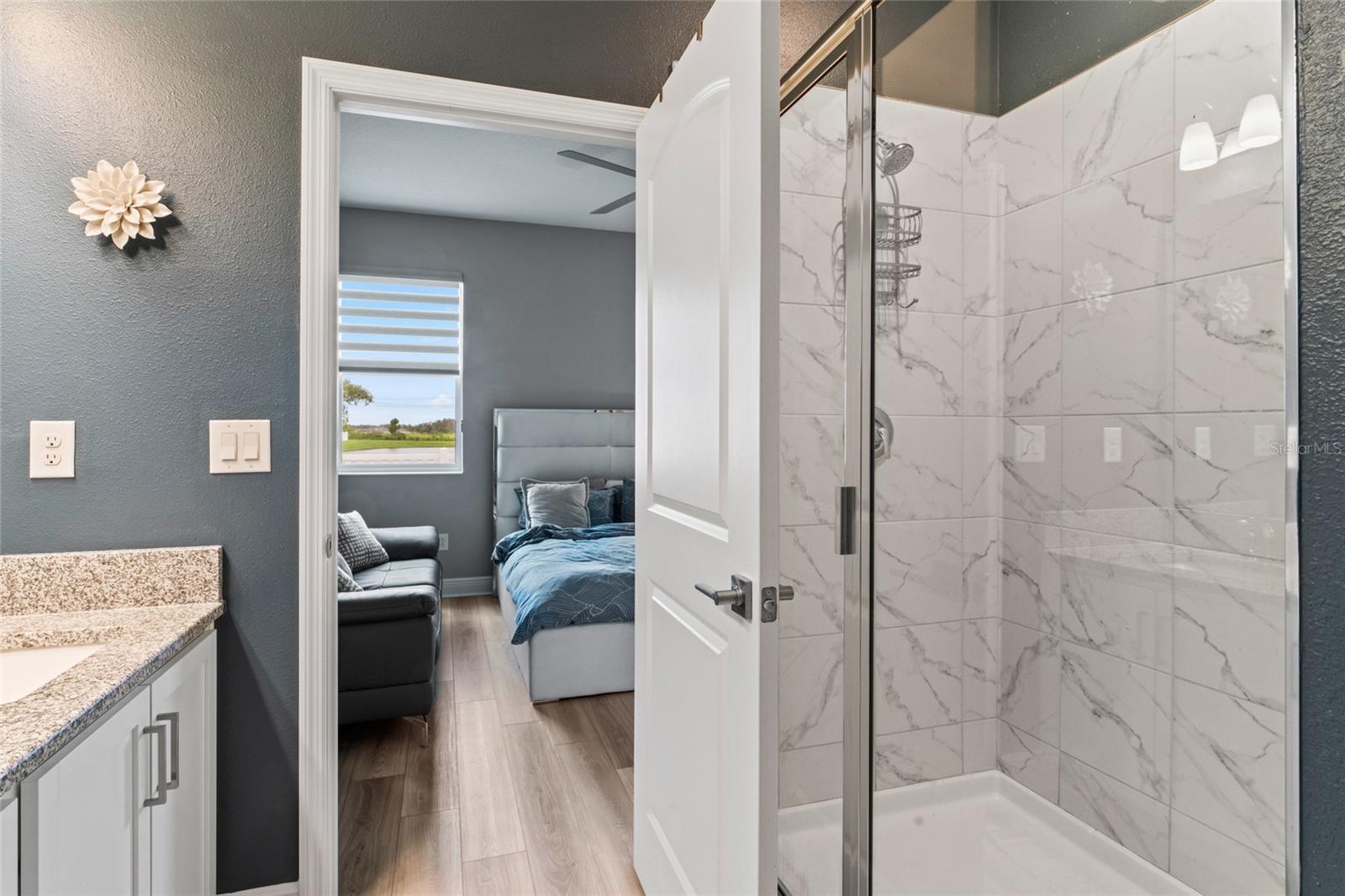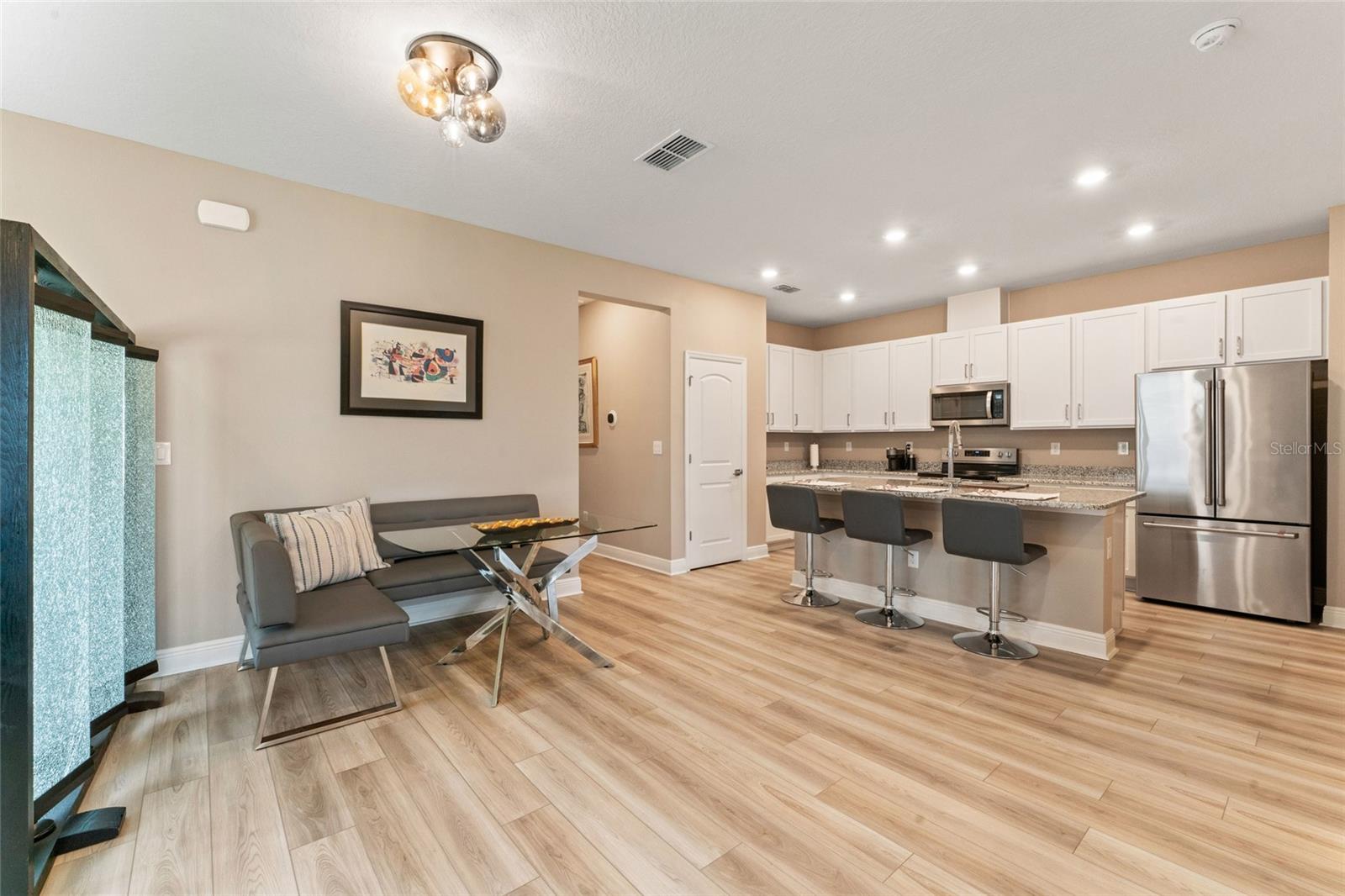 Sawgrass Lakes features this beautiful 3-bedroom, 2-bathroom home with a stunning pond view. Luxury vinyl plank flooring runs throughout the entire residence. The kitchen boasts 42-inch white cabinets, granite countertops, and stainless steel appliances, and it overlooks the dining and living areas. The split-bedroom layout provides privacy for both guests and family. The primary suite includes a walk-in closet and a spacious en-suite bathroom. The secondary bedrooms also have walk-in closets. Relax and enjoy the pond view from the screened lanai with epoxy flooring. Additional upgrades include an epoxy garage floor, a vinyl-fenced yard, upgraded appliances, including a washer and dryer, knobs & handles on cabinets and drawers, custom lighting fixtures, upgraded paint, and enhanced landscaping throughout the exterior, pavered driveway and sidewalk.