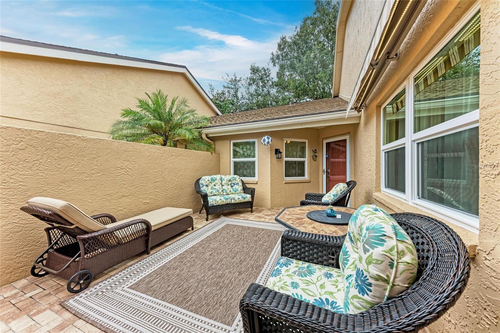 Exterior: Awning(s), Courtyard, Lighting, Rain Gutters
