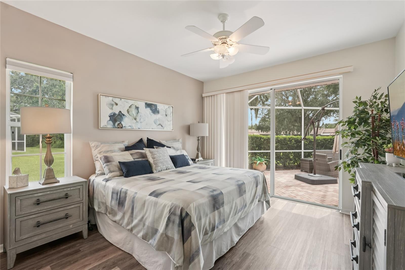 Situated at the end of a quiet cul-de-sac, this beautiful 3 bedroom, 2 bath home offers the grand lifestyle of luxury Florida living. Featuring pocket sliding glass doors, the central living room completely opens onto the screened-in lanai that includes a heated pool/spa, and golf course view! The brightly lit kitchen has an abundance of cabinet space, modern appliances, quartz countertops, built-in desk for organizing family business and a beautiful breakfast nook overlooking the pool. An adjacent formal dining room lies just outside the kitchen two guest bedrooms; full bath and separate laundry room are at one end of the house. At the other end, the main bedroom is spacious and features his/her walk-in closets, double sinks, a large tub and walk-in shower. A sliding glass door opens onto the lanai as well. Tasteful plank vinyl wood grained flooring is found throughout the home. Beautifully landscaped, the property has a long concrete driveway and large two-car garage. The Ron Garl 27 hole University Park Country Club is a short distance away and several membership categories (social, racquet and full golf) are available. additional club information is available from the listing agents. Abundant shopping and restaurants are within minutes.