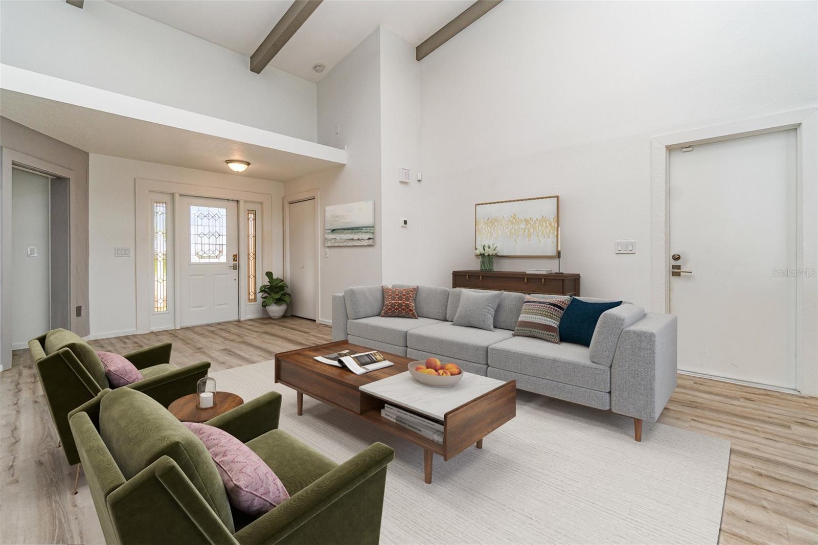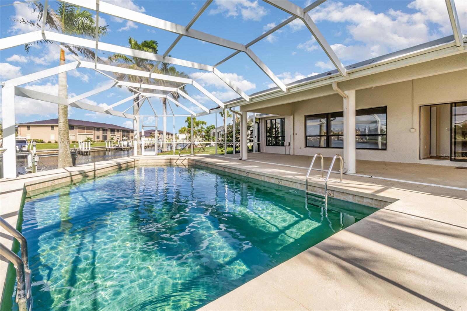 One or more photo(s) has been virtually staged. Welcome home to this exceptional 3-bedroom, 3-bathroom waterfront estate in the highly desirable Punta Gorda Isles community, a true boater's paradise with no HOA fees. This single-story residence blends privacy, luxury, and convenience, offering quick access to Charlotte Harbor and the Gulf of Mexico with only one high-clearance bridge to navigate. Set on an oversized waterfront parcel with expansive basin views, the home welcomes you with abundant natural light, vaulted wood-beam cathedral ceilings, neutral tones, and an open floorplan designed to showcase serene water and pool vistas. The great room flows into an informal dining space and a generously sized chef's kitchen with ample storage and a comfortable breakfast bar. The executive-style master suite features an updated ensuite bathroom with dual vanities, a jetted tub, a Roman shower, and refreshed finishes, while both guest bedrooms provide excellent natural light and spacious closets. A flexible interior laundry room offers potential as an office or hobby space. A standout feature of this home is the rare 5-car garage, ideal for car enthusiasts, craftsmen, or collectors, complete with multiple bays, overhead storage, epoxy flooring, and its own bathroom. Outside, enjoy a clear-view screened pool enclosure, stamped pool decking, and a concrete dock overlooking wide, tranquil waterfront vistas. Recent updates include a standing seam metal roof, new flooring, refreshed bathrooms, upgraded electrical components, updated hardware, epoxy-coated garage floors, fresh interior and exterior paint, and a newer water heater. Additional highlights include a circular paver driveway, crown molding, built-in storage, multiple linen closets, and a bright, welcoming layout throughout. Conveniently located near waterfront dining, pristine beaches, world-class fishing, Fishermen's Village, parks, golf courses, shopping, entertainment, Punta Gorda Airport, and major roadways, this move-in ready home offers an unmatched combination of lifestyle and location. Sold AS-IS for seller convenience; seller has never occupied the home and no disclosures are available. Virtual furnishings may have been added to listing photos to help illustrate the home's potential.