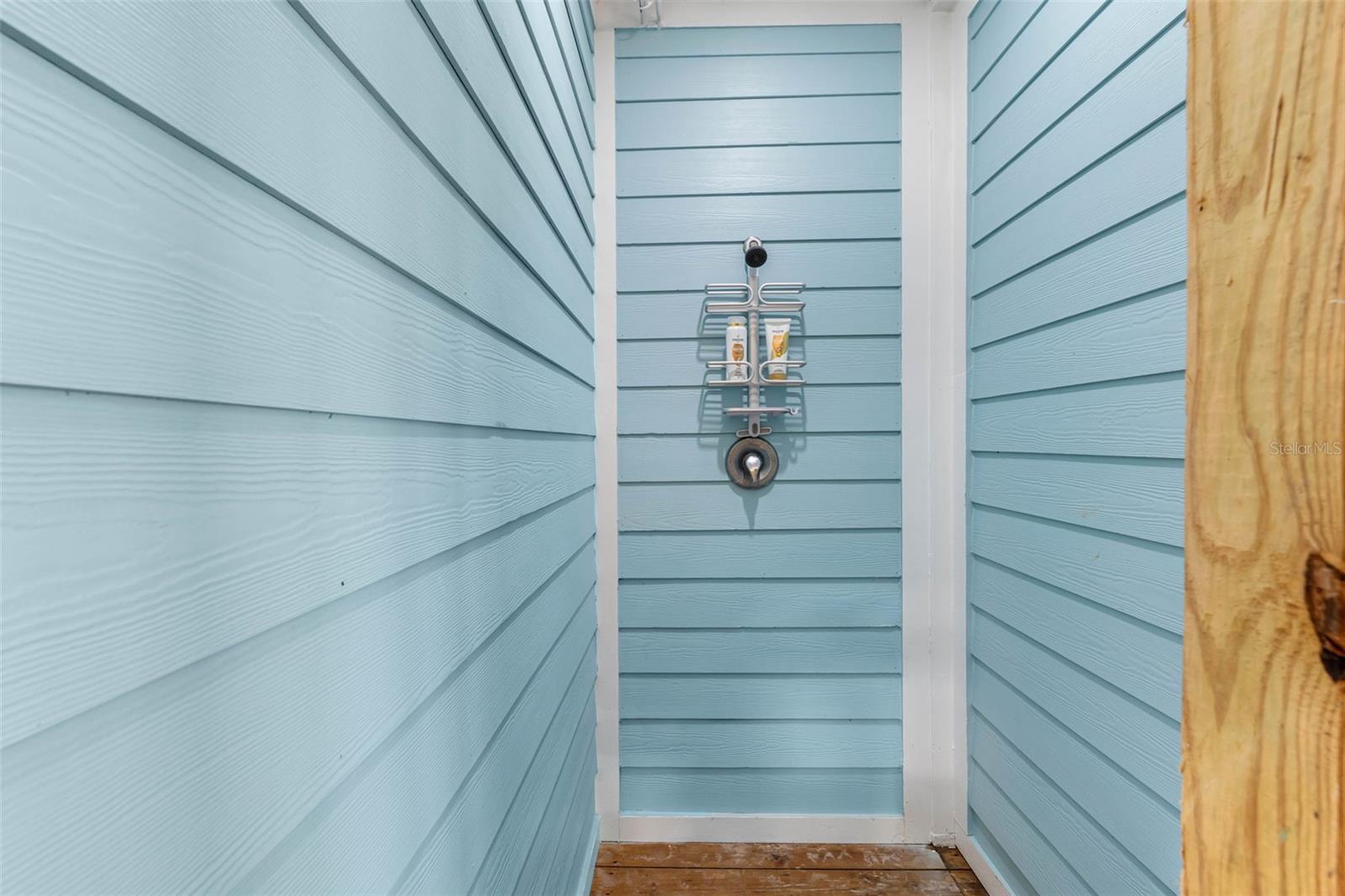 Exterior: Lighting, Outdoor Shower, Rain Gutters, Sliding Doors, Storage