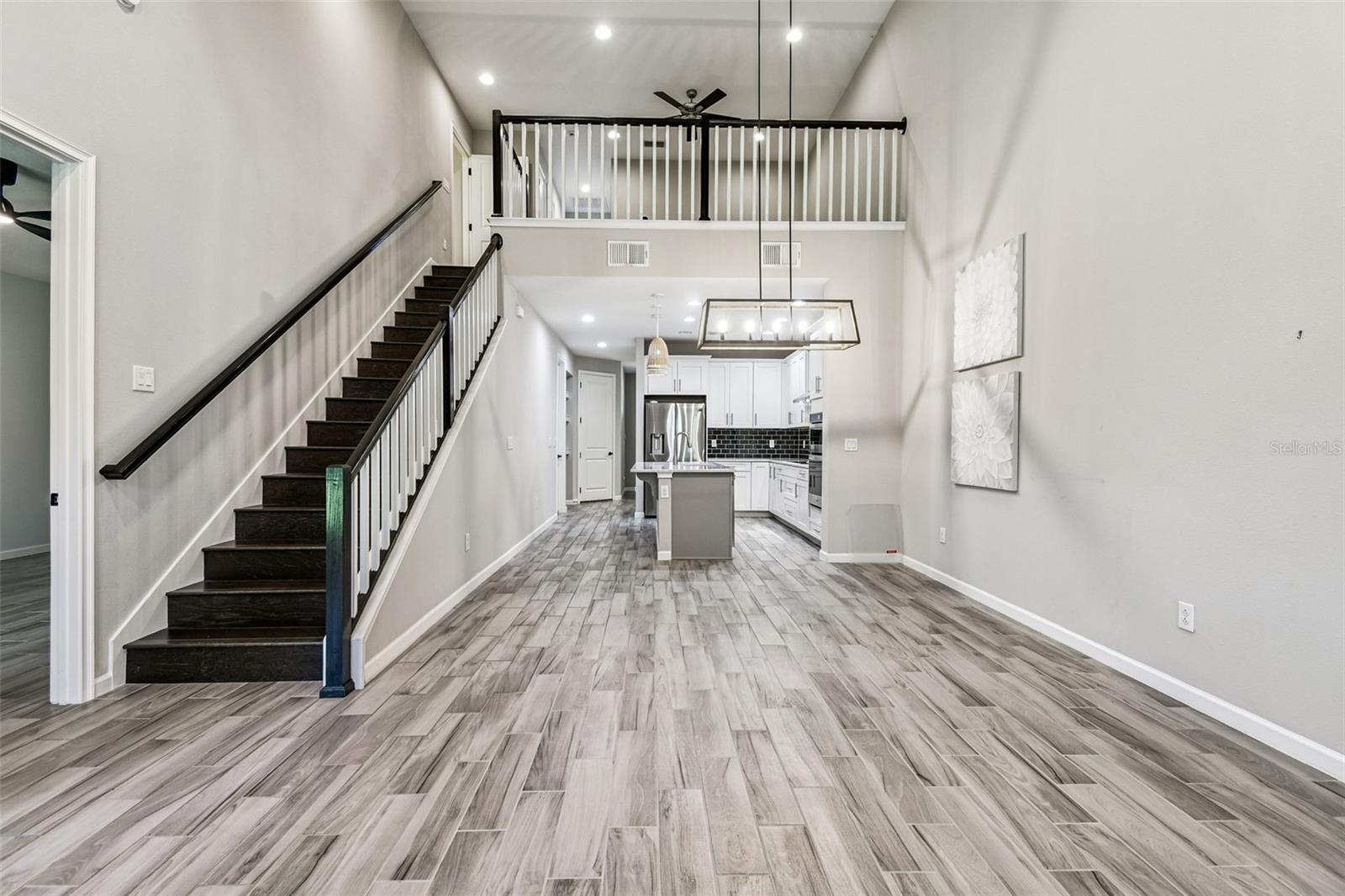 Luxurious and inviting, this Harmony at Lakewood Ranch residence blends contemporary design with effortless comfort. Featuring three elegant bedrooms, two and a half designer baths, and an expansive loft/bonus area with an enclosed storage room, this home was crafted for those who appreciate style and substance in every detail.Impeccable upgrades and refined finishes are found throughout. Soft grey tile flooring flows seamlessly through the open-concept main level, complemented by sleek quartz countertops, bright, custom cabinetry with soft-close drawers, and a timeless subway tile backsplash. The island kitchen is both functional and beautiful, offering the perfect space for casual dining or elegant entertaining.Striking two-story ceilings enhance the airy, light-filled living spaces, while modern fixtures and stainless-steel appliances add a touch of sophistication. The primary suite, conveniently located on the first floor, provides a private retreat with a spa-inspired bath, dual vanities, and a large walk-in shower with designer tilework.Upstairs, a spacious loft offers flexibility for a media lounge, home office, or fitness area, alongside two generously sized bedrooms and a full bath. Additional features include a hardwood staircase, epoxy-coated garage flooring, and a screened paver lanai--perfect for enjoying serene evenings outdoors.Set within the sought-after community of Harmony at Lakewood Ranch, residents enjoy resort-style amenities including a sparkling pool, fitness center, clubhouse, and playground. With beautifully maintained landscaping, affordable HOA dues, and proximity to premier dining, shopping, parks, and top-rated schools, this home captures the essence of modern luxury living in Lakewood Ranch.