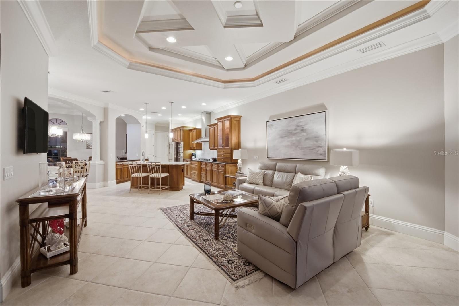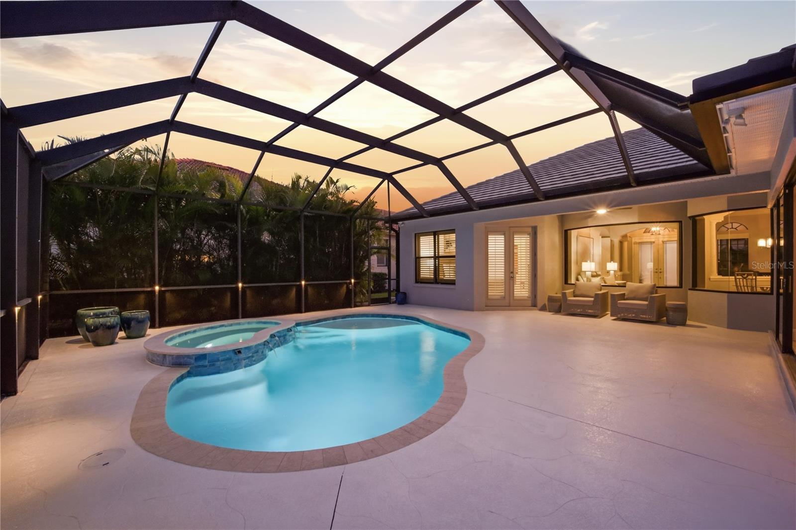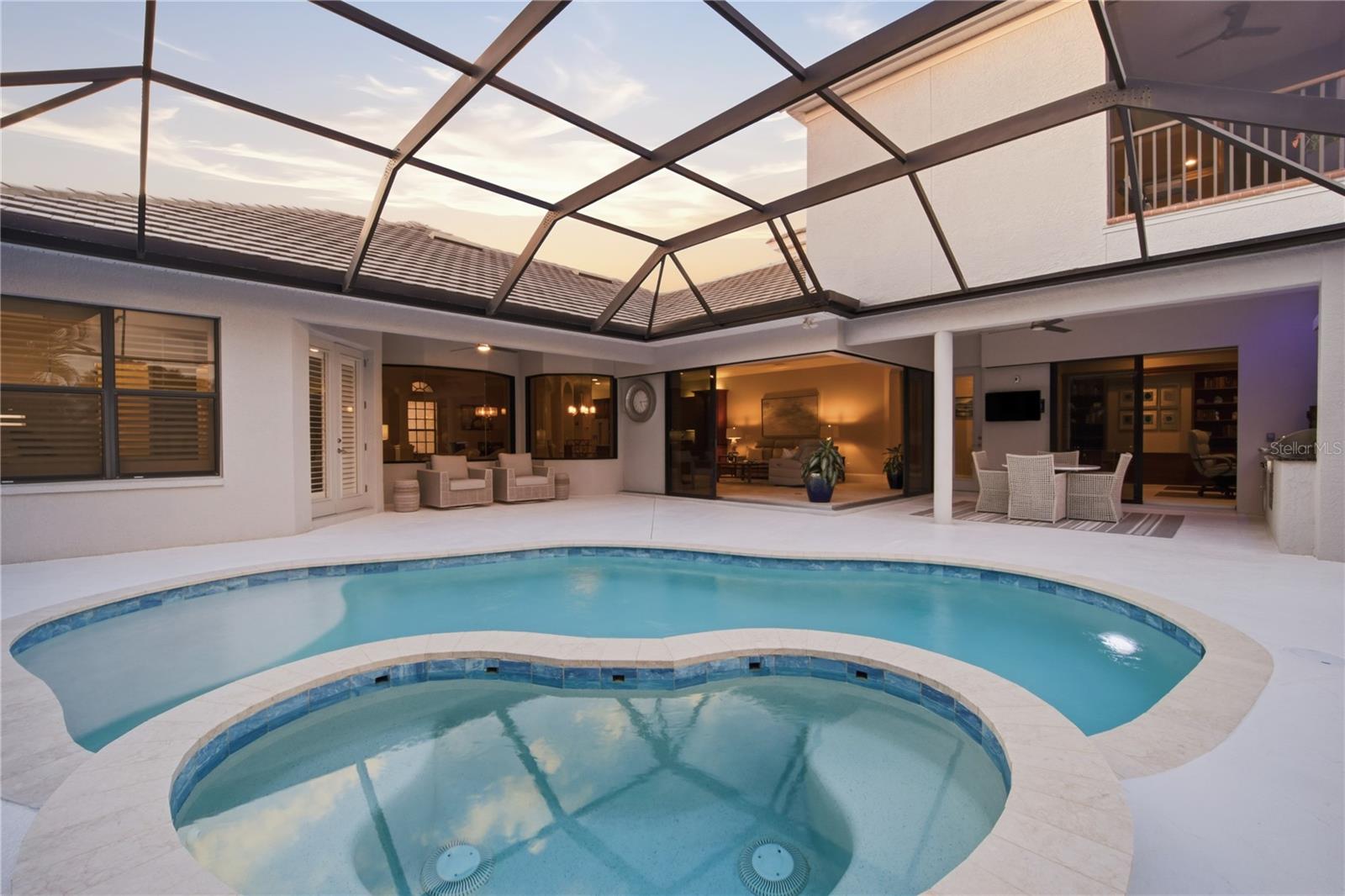 CASUAL ELEGANCE in this lovely home located on a premium Golf course lot, on a cul-de-sac in the impressive Lakewood Ranch Country Club. Custom-built home offers a panoramic view of the 13th green on the King's Dunes Championship Golf Course. Light and bright with an open-concept design flowing effortlessly from the light-filled living and dining areas to a gourmet kitchen featuring contrasting center island, granite countertops, breakfast nook, stainless appliances and large pantry. Continuing, is a large great room with "disappearing" corner sliding glass doors to a covered lanai that includes a summer kitchen, swimming pool, spa and large backyard. The owners suite includes two separate custom closets, lighted tray ceiling and access to deck and pool. Bath ensuite offers a Roman shower, relaxing soaking tub and separate granite vanities. There are two additional bedrooms plus a custom designed office with ample built-in storage and bookshelves, and serene views of the golf course and pool! Upstairs on the second-floor is a bonus room including a built-in entertainment center, half-bath and balcony overlooking the landscaped backyard and golf course. Numerous upgrades include a completely renovated pool and spa, new pool equipment with remote control, resurfaced deck, new garage floor epoxy finish and belt-driven doors, power blinds throughout and plantation shutters in all bedrooms and bathrooms. The Lakewood Ranch Country Club offers world-class amenities including: four championship golf courses, 18 Har-Tru tennis courts, 12 pickleball courts, fitness center, aquatic facilities, three well-appointed clubhouses and an active social calendar. Membership is optional. Beyond the gates, enjoy A-rated schools, top medical facilities, premier shopping and dining and easy access to the Gulf Coast's pristine beaches. Welcome to your year-round Florida Vacation! CALL TODAY!