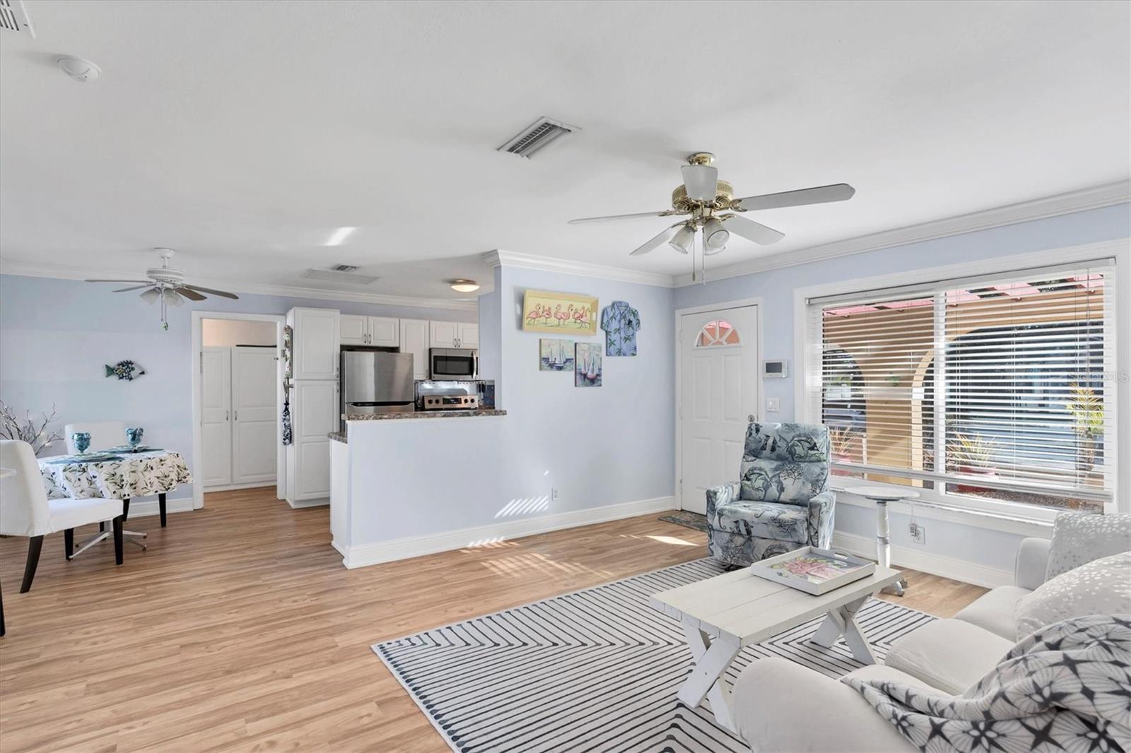 RARE FIND with IN-LAW QUARTERS and charming PRIVATE ENTRANCE through a COVERED SIDE PORCH graced with 5 ARCHES and a TERRACOTTA TILE floor. Walking up to it I was drawn to just sit a spell. It is NO SURPRISE that the current owner has had a HISTORY of loyal RETURNING SEASONAL RENTERS. Use it as you wish, ART STUDIO, home office, GUEST HOUSE, home for AGING PARENT'S distance from the teenagers or DUAL LONG TERM RENTAL income.This CHARMING home is situated on a 4 LOT PARCEL caressed with DOUBLE functioning FOUNTAINS and MATURE PALMS and OAK TREES. Feel the TRICKLING FOUNTAINS melt the stress as you approach the front door. Step inside and notice the crown molding, light neutral homogenous flooring and FRENCH DOORS that lead to an additional WINDOWED ROOM overlooking the SPACIOUS YARD. From there step outside onto the BRICK PAVED PATIO to catch the Florida sunshine.Not only is this home inviting, warm and cozy, but once you move in you can start relaxing and enjoying it immediately. The big projects are done, a NEW ROOF and new HURRICANE IMPACT WINDOWS installed 2025. The kitchen and baths have also been updated. BRING all your BIG LAND and SEA TOYS and PARK them on either of the two rock driveways or in either side yard or pull them into the 20 X 20 THREE SIDED STEEL CARPORT. This is the coveted South Venice Neighborhood where there are NO HOA's. And those toys have a NEARBY PARK TO PLAY at the PRIVATE BOAT LAUNCH to the GULF. RESIDENT MEMBERSHIP is renewed at just $200.00/year. No boat? No problem, the same park offers a PRIVATE FERRY to a SECLUDED BEACH ISLAND, resident membership $150.00/year. Don't want to wait for the ferry, the KAYAK LAUNCH is $100.00 /year.This park is less than 3 miles away and is also near the SOUTH VENICE YACHT CLUB and the CIVIC COMMUNITY CENTER where renovated PICKLE BALL COURTS are enjoyed. Here they host classes and events in the social hall.Even closer at 1.5 miles is THE SHAMROCK NATURE CENTER with a playground, Children's butterfly garden, TENNIS COURTS and access to the LEGACY TRAIL for a ride all the way up to Sarasota. Head just a few miles in either direction and enjoy the QUAINT TOWNS and BEACHES of HISTORIC VENICE or the OLD FLORIDA VIBE of ENGLEWOOD. Both towns offer dining, festivals, farmer's markets and parks. Both offer their own unique "CHILL VIBE" with, their ART CENTERS and BEACH YOGA at SUNRISE or SUNSET, and DRUM CIRCLE and STREET MUSIC and CONCERTS at the center of town GAZEBO.Join the VENICE GARDEN COMMUNITY POOL or ADD A POOL in your own expansive yard. The current owner has investigated splitting the lot or adding an additional guest house on the property so there is plenty of room to grow in place in any direction. Even GRANDMA can enjoy peer fellowship and activity at nearby SENIOR FRIENDSHIP CENTER.This is the most AFFORDABLE ACTIVE FLORIDA LIVING. Something for EVERY AGE. A-LA-CARTE AMENITIES with NO CDD'S or HOA RULES.
