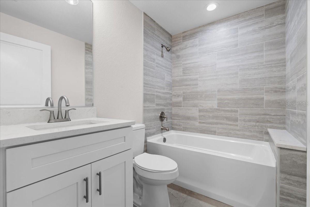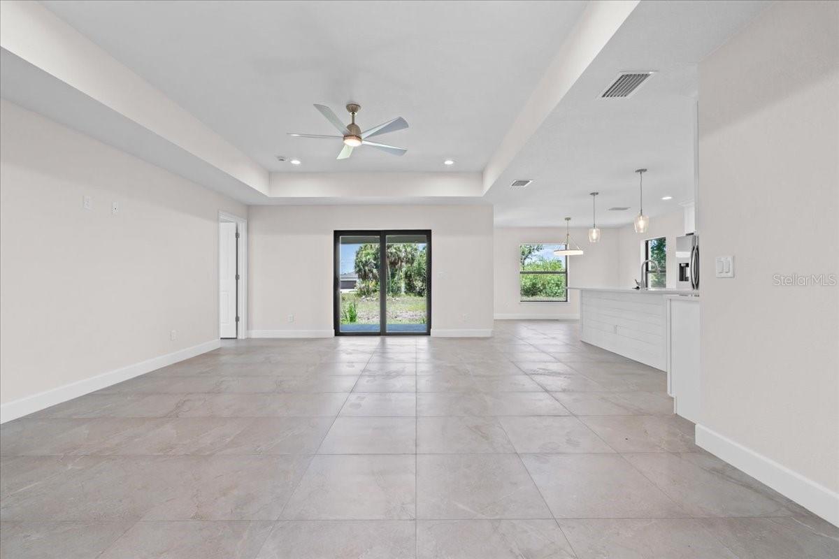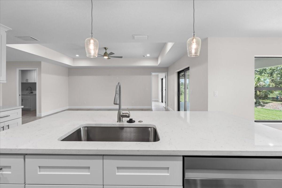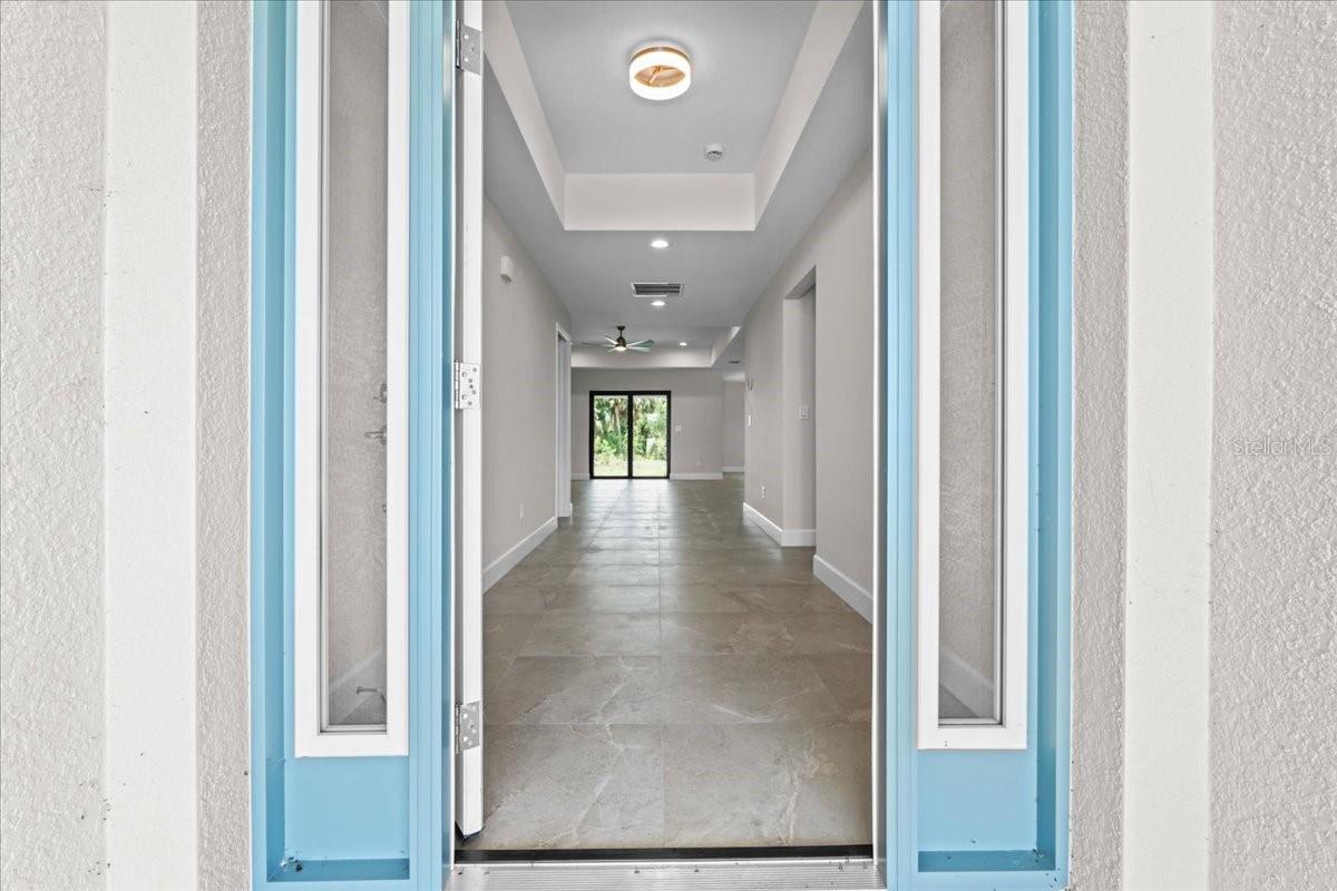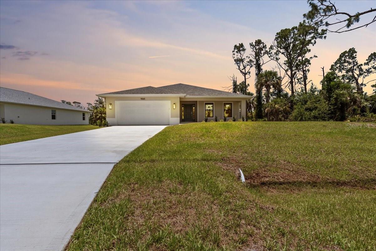 Move right into this never-occupied, beautifully built 3-bed, 2-bath concrete block home combining modern style with thoughtful features. The property includes a 2-car garage with epoxy chip floors, Rain Bird irrigation system, architectural shingle roof, full gutter system, and a wind resistance hip roof design. PGT impact windows and sliders provide storm protection and energy efficiency.Inside, the kitchen features quartz countertops, shaker cabinets, Samsung appliances, and a sleek tile backsplash. Porcelain tile flooring runs throughout the home, complemented by tray ceilings that add depth and character. The primary suite offers a walk-in closet and a dual-vanity bath. Front and rear porches with spraycrete flooring extend the living space outdoors.Low-maintenance, high-quality construction and move-in ready--schedule your showing today.