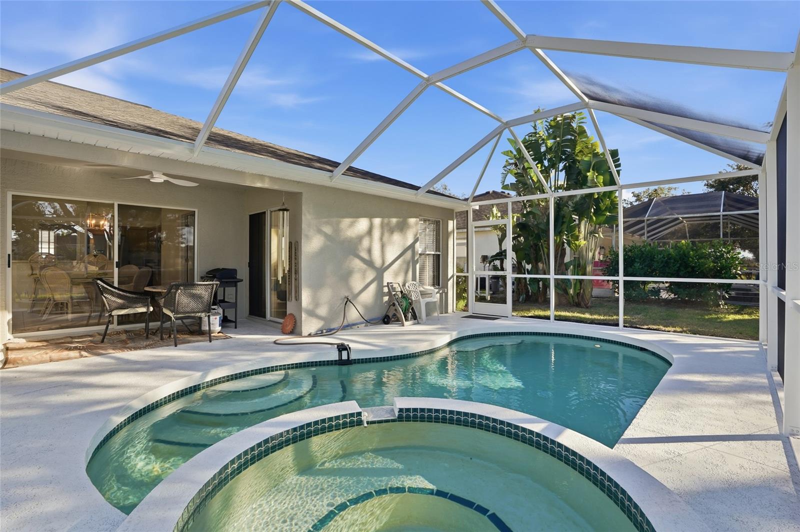 Pool & Spa Home with Pond Views, Vaulted Ceilings & Major UpdatesThis well-maintained block home built in 1997 offers 3 bedrooms and 2 full baths with a sought-after split-bedroom floor plan and vaulted ceilings that fill the main living areas with natural light. Step outside to classic Florida living with a screen-enclosed pool and spa, all overlooking a serene pond surrounded by mature landscaping--a private, peaceful backdrop for everyday enjoyment or entertaining.The primary suite is a true retreat, featuring private sliders to the pool and lanai for effortless indoor-outdoor living. Significant recent upgrades include a new roof, new HVAC, fresh interior and exterior paint, a newly painted pool deck, and a new pool pump, offering comfort, efficiency, and peace of mind.Inside, the home is clean, bright, and well cared for, presenting an excellent opportunity to personalize with cosmetic updates. With durable block construction and a location in an established neighborhood, this property delivers the perfect blend of lifestyle, privacy, and long-term potential.