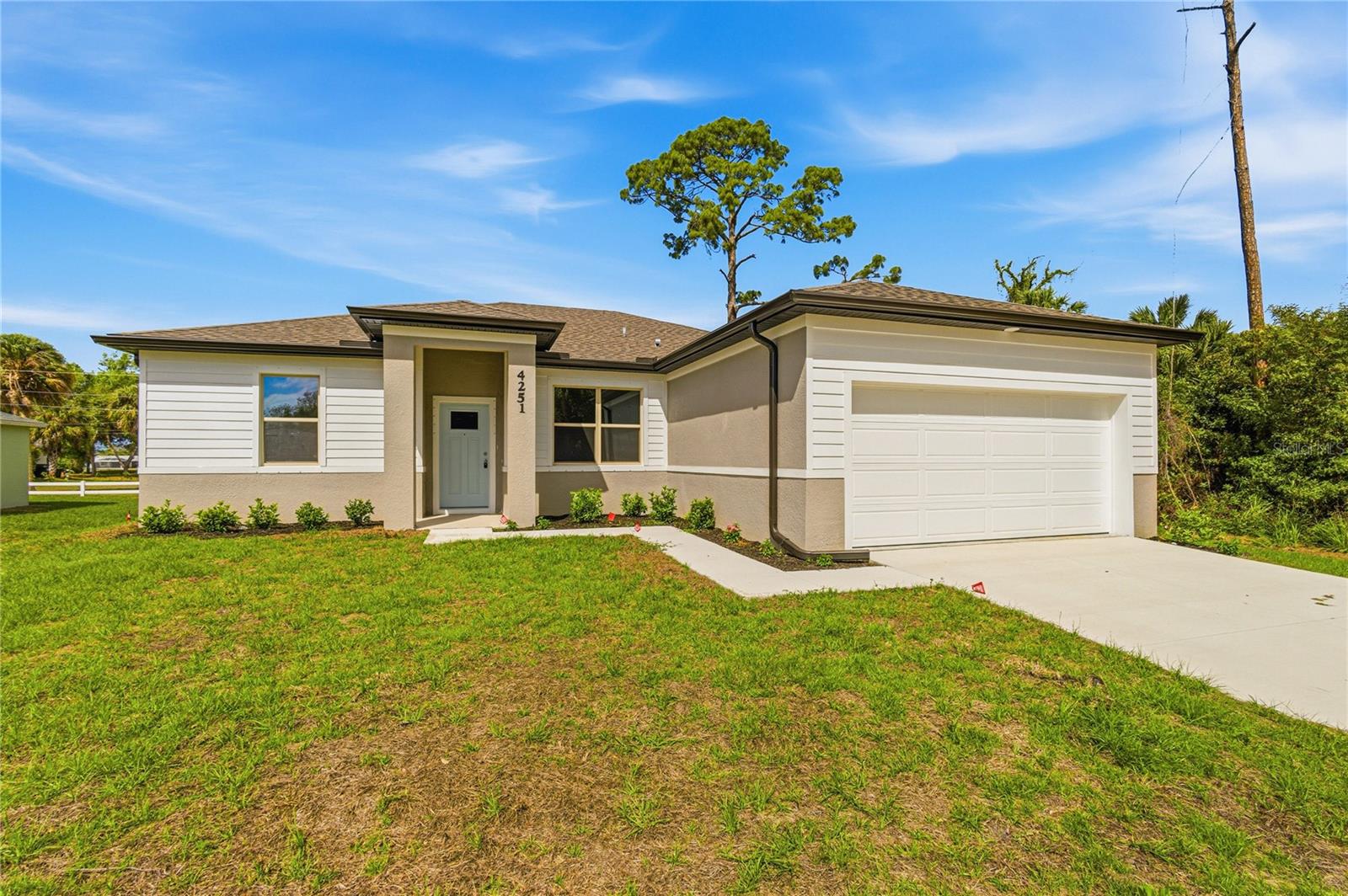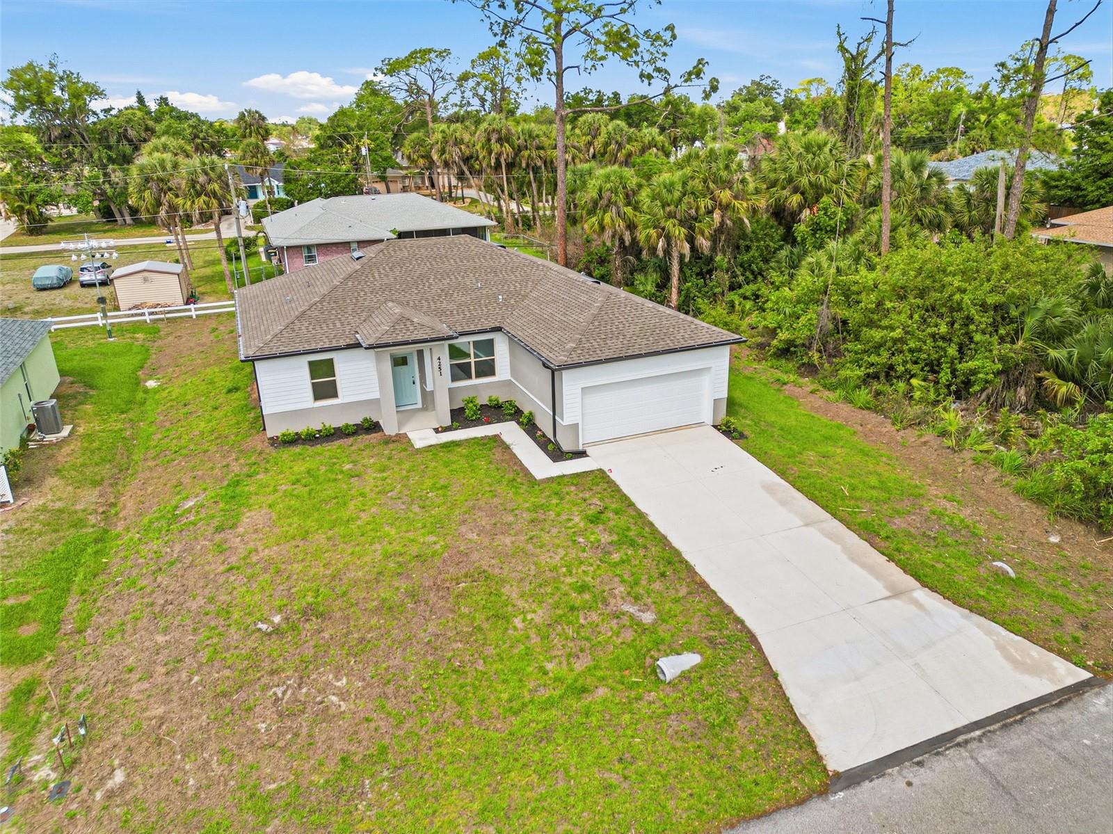 Excellent price with luxury features and move-in ready! A brand new home with city water and septic system in North Port - no HOA fees! Great location! Ideally located for quick access to Highway 41, shopping, schools, medical facilities, Warm Springs Park, and the Aquatic Park. This affordable new home is ready for you and is just what you've been looking for... No HOA fees and city water! This home features 9-foot ceilings, a spacious and open layout with a versatile floor plan. The home has 4 bedrooms, 2 full bathrooms, a formal dining room, a living room, an open kitchen, and a two-car garage, with 1,810 square feet of living space. The living space is well-utilized, with high ceilings and numerous windows providing natural light. The interior finishes will provide you with the quality and luxury you were looking for in your new home. This home has a split floor plan, with the primary suite on one side and the guest bedrooms on the other. The primary bedroom has tray ceiling and large windows allowing for plenty of natural light. You will also enjoy a spa-like bathroom with a spacious walk-in shower with floor-to-ceiling tiled walls and a glass enclosure. It also features a linen closet, a double vanity, and a large walk-in closet. The living room has large windows and several LED light fixtures providing ample light, with access to the covered lanai. The living room is open to the kitchen, where you will find a large center island with additional seating for casual dining and plenty of cabinetry. The kitchen features stainless steel appliances, Shaker-style cabinets with crown molding , decorative hardware, a subway tile backsplash, and granite countertops. The dining room is located at the front of the house, with large windows allowing for abundant natural light. The home includes luxury vinyl plank flooring in the main living areas and bathrooms for durability and comfort. You'll love these floors! They are easy to maintain and offer a modern design, perfect for new homes. Other features include the same beautiful Shaker-style cabinets with hardware and granite countertops in the bathrooms, 5-inch baseboards, a garage door opener, exterior gutters, R38 insulation, a 16 SEER HVAC system, and much more. Visit our showroom and compare the features and quality to other homes, and you'll see the difference. We make buying easy for you! The photos and videos are the same floor plan, but different location.