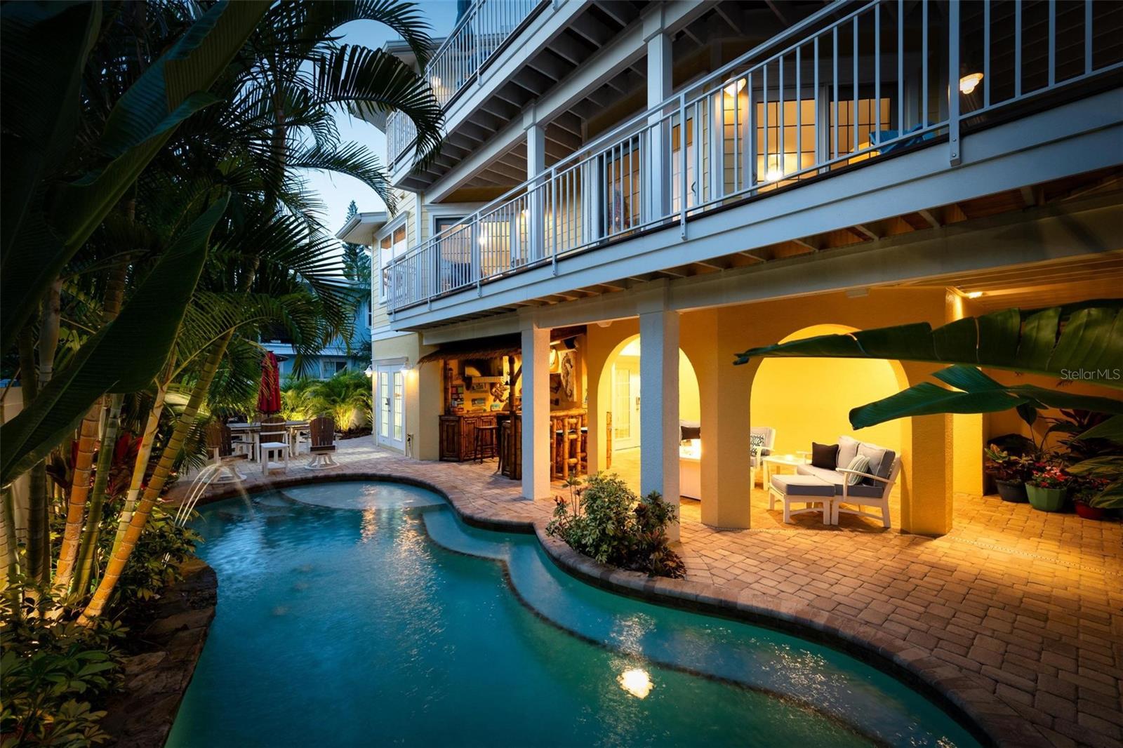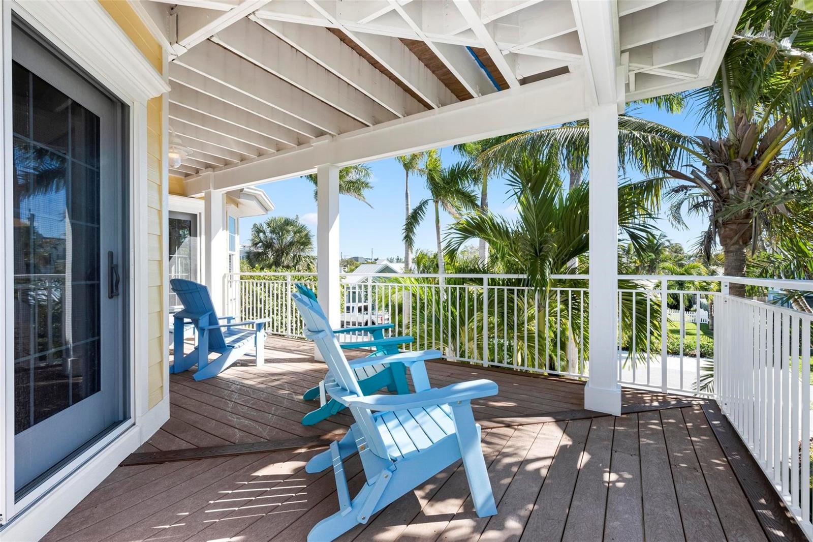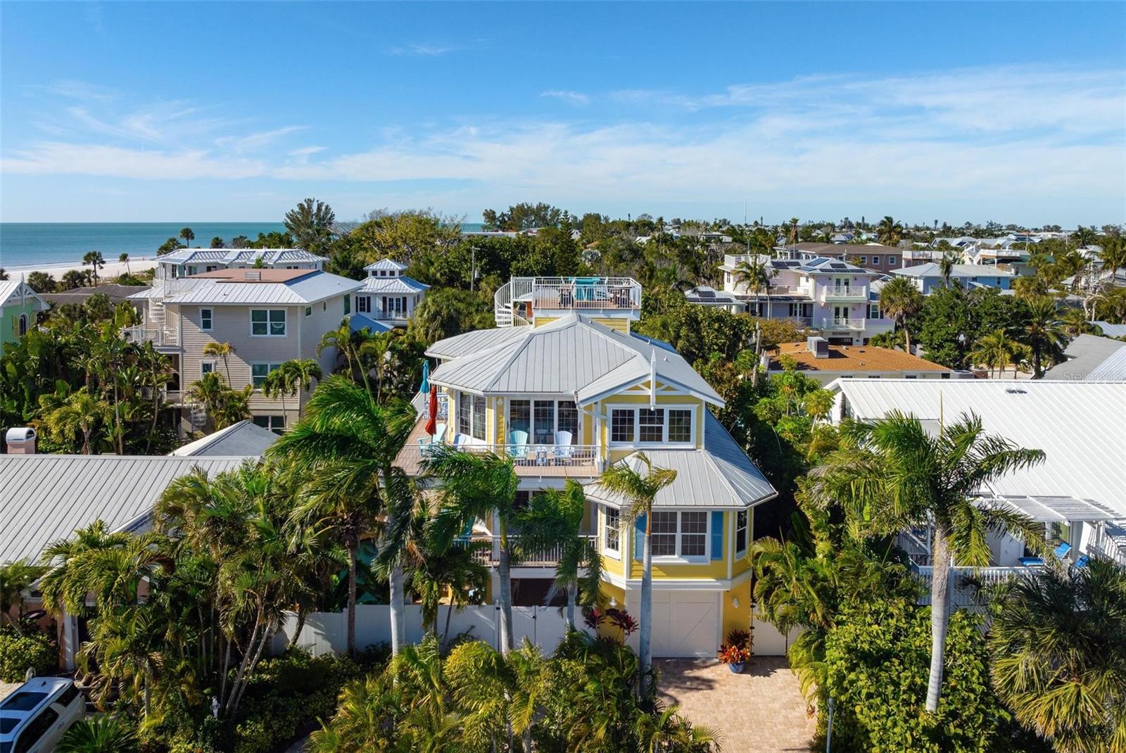 From sunrise to sunset, stunning Gulf views throughout the house. One of the most outstanding features of this property is the expansive rooftop deck--an irreplaceable amenity due to current height restrictions. From this vantage point, take in breathtaking Gulf sunsets, views of the Sunshine Skyway Bridge, and sweeping 360-degree panoramas of the island and surrounding waters. The elevated position of the street further enhances views and peace of mind. The home was thoughtfully designed by award winning architect Emily Anne Smith. The floor plan with four bedrooms, including two luxurious primary suites. Every bedroom features a private en-suite bathroom, complemented by two additional half bathrooms for a total of six bathrooms. A separate washer and dryer add convenience. The layout is designed to maximize natural light and capture views from sunrise to sunset. Both living levels feature wrap around decks with large seating and lounging areas. The second living level hosts a spacious primary suite with heated bathroom floors, a jacuzzi-style soaking tub, largeshower, and dual vanities. This level also includes two additional en-suite bedrooms, plus a comfortable living area with a half kitchen featuring a sink, refrigerator, microwave, toaster oven, ample cabinetry, and a 48-bottle wine cooler--perfect for guests and family seeking privacy and independence. The third living level showcases an open-concept design with soaring ceilings, where the main kitchen, dining, and living areas all face the Gulf. Enjoy spectacular sunset and skyline views from nearly every angle. This level also features a second primary suite with a king bed and spa-like en-suite bathroom, a separate half bathroom, office workspace, and direct access to the rooftop deck. Outdoor living is equally impressive, highlighted by a resort-style pool with rock waterfall, jet stream fountain, jacuzzi jets, auto-fill system and mature tropical landscaping. A six-foot privacy fence surrounds the property. Entertain with ease at the covered tiki bar equipped with sink, refrigerator, TV, stereo, plus multiple shaded and sun-soaked seating areas. Additional features include a large garage accommodating 2-3 vehicles with 9-foot ceilings, extensive storage, workbenches, elevator, impact-rated PGT windows and doors, metal roof, low-maintenance stucco and Hardie plank exterior, heated slate kitchen floors, plus slate in entrance and storage room, bamboo flooring throughout the rest of the house, Hunter Douglas blinds, and the home is offered fully furnished and move-in ready. The home also features a monitored security system, smart thermostats and an Artificial Intelligence (AI) Camera System with DVR. Never rented, yet zoned for weekly rentals. No hurricane water intrusion in 2024. A truly rare offering on Anna Maria Island on one of the highest elevation and quietest streets with a deeded beach access.