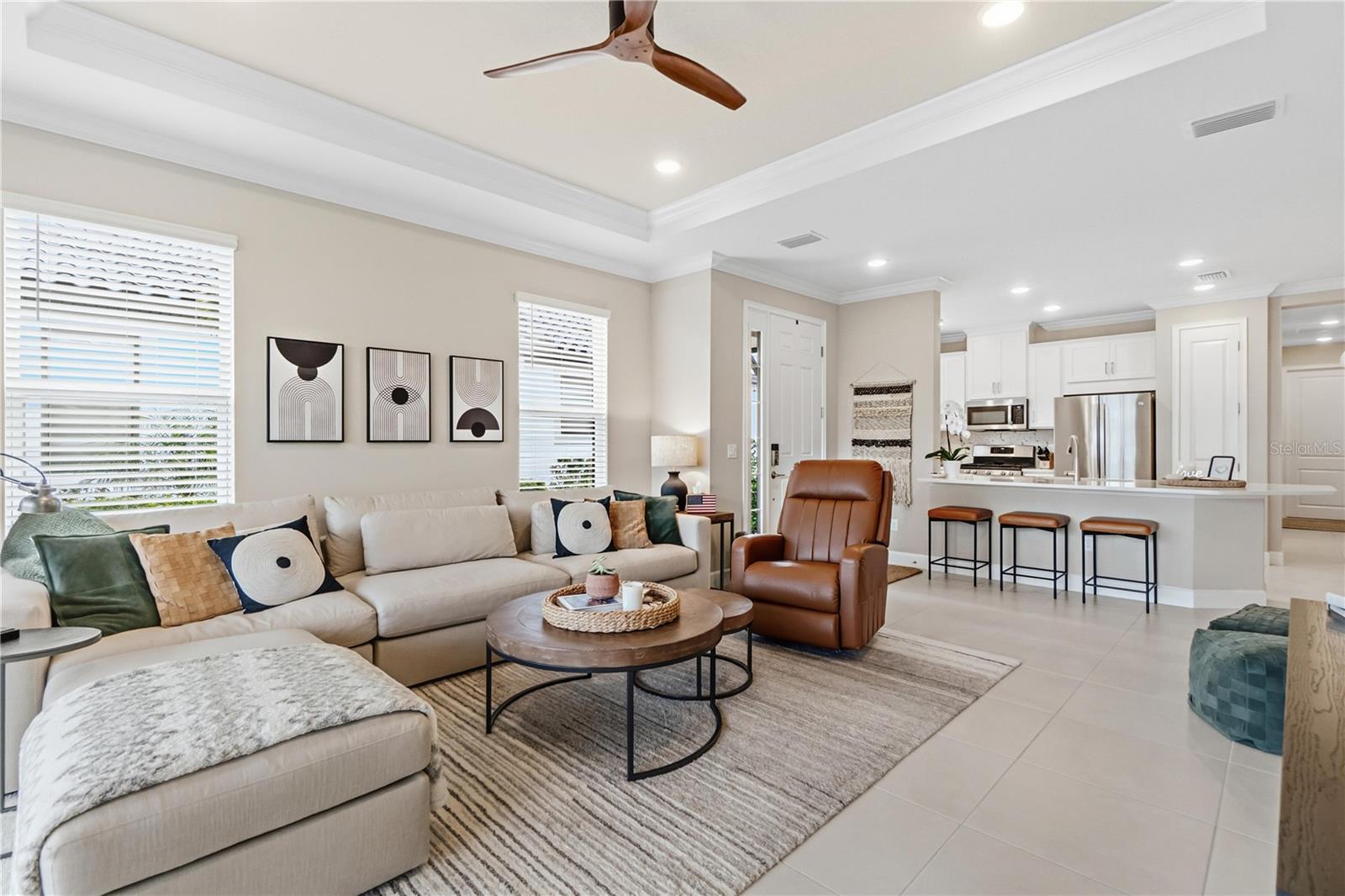 This exquisite Ibis villa is your opportunity to own a slice of paradise in the highly sought-after Esplanade at Azario in Lakewood Ranch. This home offers the perfect opportunity for those looking to downsize without compromise, relocate with ease, or enjoy a refined seasonal retreat in one of Lakewood Ranch's most amenity-rich communities.A beautifully landscaped private walkway leads to the front entry, creating a warm and elegant first impression. Inside, the home immediately impresses with tray ceilings, crown molding, impeccably selected upgrades, and a spacious open-concept layout designed for both everyday comfort and effortless entertaining. The seamless flow between the kitchen, dining, and living areas makes this home feel welcoming, light-filled, and easy to enjoy--whether hosting guests or relaxing after a day of activities.The gourmet kitchen is thoughtfully designed and fully stocked, featuring white shaker-style cabinetry, stainless steel appliances, a stylish marbled tile backsplash, and generous counter space--ideal for casual meals or entertaining without excess upkeep. Just beyond, the dining area provides an inviting space for intimate dinners or relaxed cocktail gatherings, while the living room opens through sliding glass doors to a screened-in lanai, offering privacy and a peaceful spot to enjoy Florida's indoor-outdoor lifestyle.The primary suite serves as a serene retreat, complete with a tray ceiling and large picture window. The spa-inspired ensuite bath features dual vanities, a dedicated makeup counter, a spacious walk-in shower, and an oversized custom walk-in closet, blending comfort with smart, functional design. Located on the opposite side of the home, the private guest suite includes its own walk-in closet and full bathroom, providing privacy and convenience for visiting family and friends. A versatile den with pocket doors offers flexible space--perfect for a home office, media room, or additional guest area.Additional highlights include a custom laundry room with washer and dryer, ample cabinetry for storage, a two-car garage with epoxy flooring, Ring doorbell and smart home features, and a tankless water heater for enhanced energy efficiency and peace of mind.Life in Esplanade at Azario is centered around world-class, resort-style amenities that make every day feel like a getaway. Residents enjoy a full-service spa, tropical Bahama bar, multiple resort pools, and a state-of-the-art fitness center. Dining options abound at the Culinary Center and Barrel House restaurant, with opportunities for cooking classes and wine tastings, plus casual favorites like the on-site pizzeria. Golf enthusiasts can take advantage of the 18-hole Championship golf course with a convenient pay-to-play option. Tennis, pickleball, scenic walking trails, a coffee shop, and a vibrant event space for social gatherings and resident activities round out this exceptional lifestyle.Perfectly located in the heart of Lakewood Ranch, this home offers easy access to top-rated schools, world-class shopping, fine dining, and the beautiful Gulf Coast beaches. With maintenance-free living and unmatched amenities, this villa delivers the ideal blend of luxury, convenience, and flexibility.Whether you're simplifying, relocating, or searching for the perfect Florida escape, this is a rare opportunity not to miss. Schedule your private showing today and experience the Esplanade lifestyle for yourself.