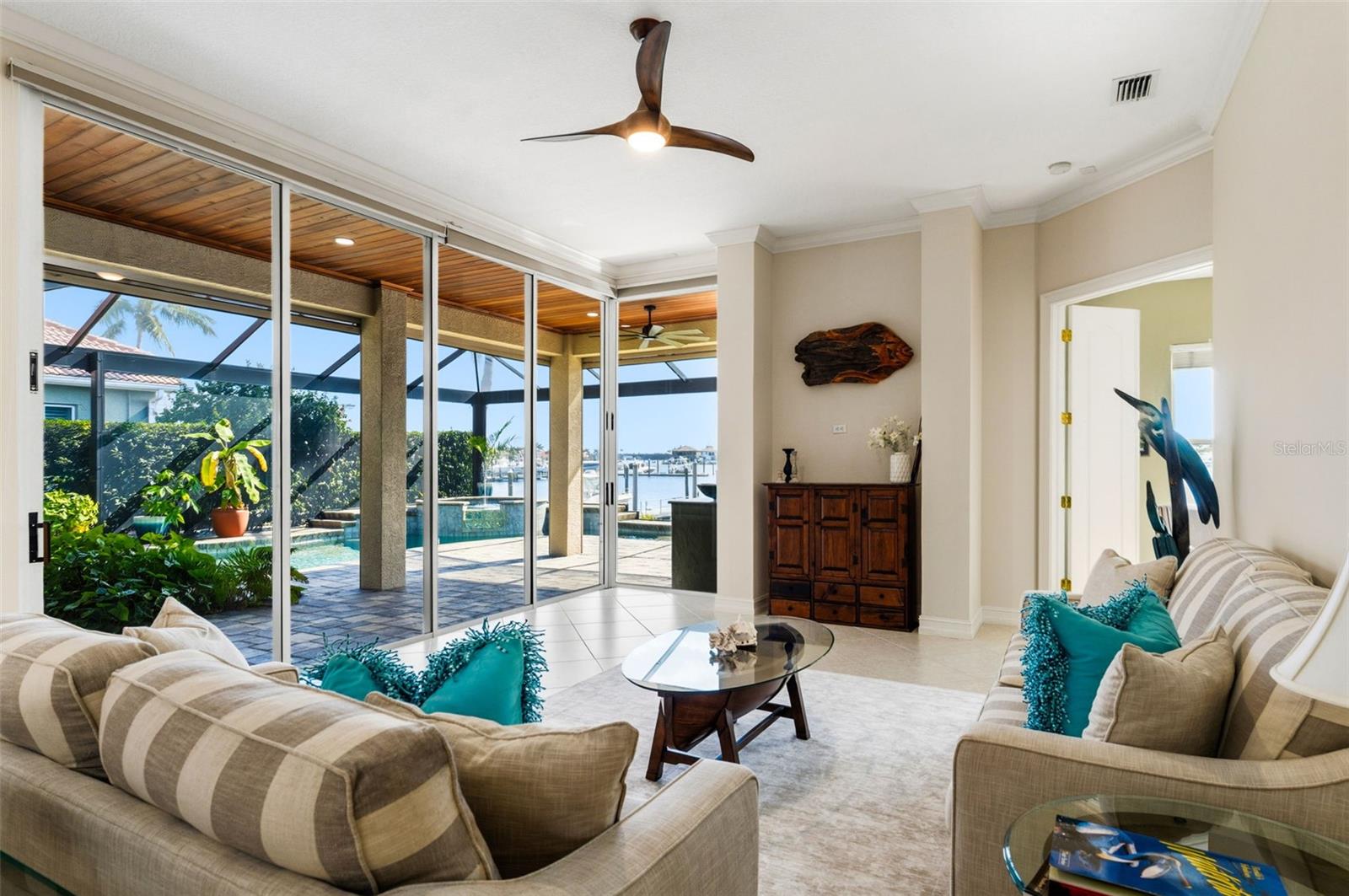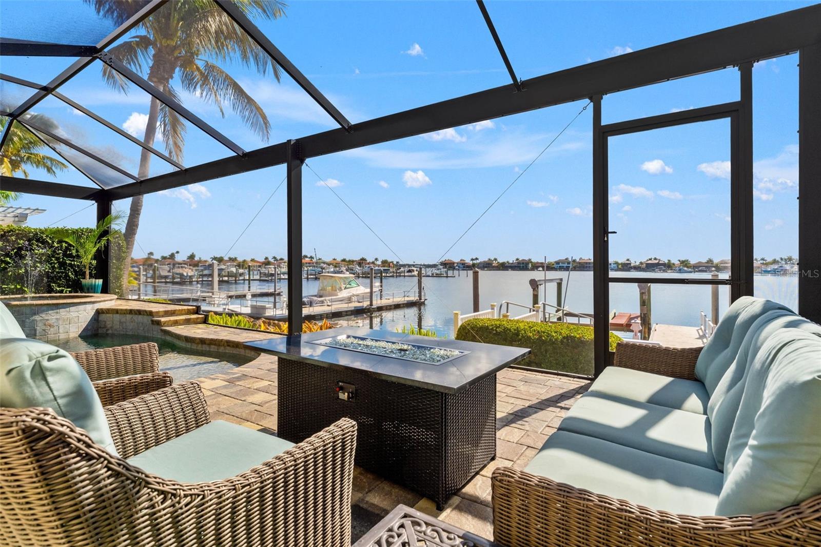 BRING your boat and MOVE into this Luxury waterfront home with deep-water dock in GATED Riviera Dunes offering DIRECT Gulf access. This home sits on an approximately 18-foot-deep, 90-acre protected harbor, making it a rare find for boating enthusiasts. Step out your back porch and onto your private dock that provides effortless access to the Manatee River and Gulf in MINUTES, perfect for larger vessels and year-round boating.Step through the front doors and immediately take in breathtaking harbor views that define this exceptional coastal residence. Upon entry, soaring 18 ft ceilings, 12 ft doorways, and expansive sliding glass doors create a dramatic first impression while seamlessly extending the living space to an oversized lanai with panoramic water views! Absolutely ideal for entertaining and everyday waterfront living with speakers on pool deck(2020) and timeless cypress wood on deck ceiling(2020).This home has been immaculately maintained and offers NUMEROUS updates and upgrades including *2024 Whole Home Surge Protection, Pool Cage Refurbished with Panoramic View Screens*2023 New Central Vacuum*2022 Driveway Pavers*2021 Concrete Tile Roof, A/C downstairs, Whole Home Generac Generator*2020 Storm Catcher Screens surrounding pool deck, Hurricane Impact Garage door*2019 Hurricane Impact Windows and Doors plus upstairs Sliding Doors, A/C upstairs*2018 Hurricane Impact Front Door*The chef's kitchen is designed for both function and style, featuring NEWER appliances 2020-2024, QUARTZITE countertops, dual sinks, and abundant prep space. Open to the family room, the layout naturally draws you toward the waterfront views, creating a seamless flow for entertaining and daily living. You're going to LOVE the WATER views from almost EVERY room in the home!Downstairs is a dedicated home office offers a serene work-from-home space, though staying focused may be difficult with harbor views and local wildlife just outside the window with FULL Pool Bathroom connected to the outside living area. The flexible floor plan is ideal for a variety of living arrangements. Downstairs includes a primary suite with water views, offering a private retreat with a spacious ensuite bathroom featuring dual vanities, a washlet with bidet, private water closet, dual closets, and large windows providing abundant natural light. Also on the main level is a second bedroom and full bathroom.Upstairs features two additional bedrooms, one currently used as a flex or BONUS suite complete with a kitchenette and full laundry, making it ideal for in-law living, multi-generational households, or guest accommodations. The upstairs suite opens to a private balcony with stunning elevated harbor views, enhanced by a spiral staircase that adds architectural character. The views are truly unforgettable.The Riviera Dunes community offers an active lifestyle with countless activities. This community has all the amenities you want for waterfront living including tennis, fitness center, boating, heated community pool, yacht brokerage, restaurant and more. Just outside the gated entrance of this community is Detwiler's Farm Market, offering locally sourced homegrown ingredients. This community is perfectly located close to I-75, just 5 minutes to downtown Bradenton restaurants, shopping and events, Sarasota, Tampa and St. Pete. No CDD fees and low HOA fees. Wake up each day knowing you are living your dream in this true Florida waterfront paradise.