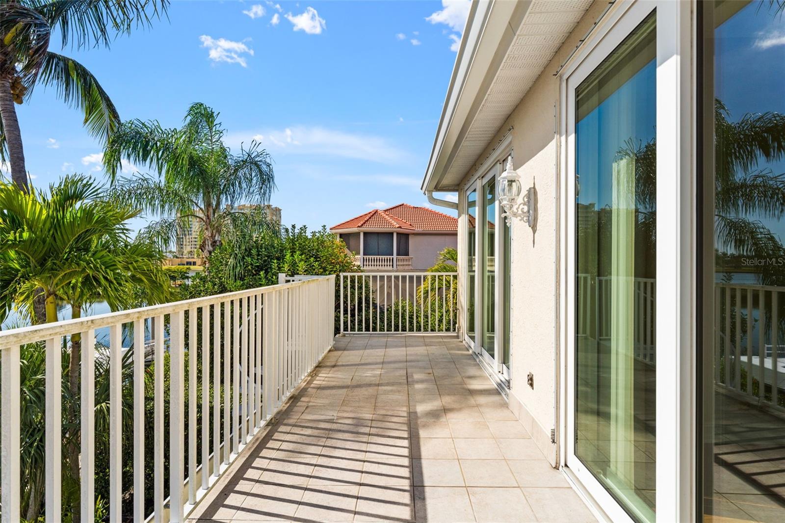 Exterior: Balcony, French Doors, Lighting, Outdoor Grill, Outdoor Kitchen, Rain Gutters, Sidewalk, Sliding Doors