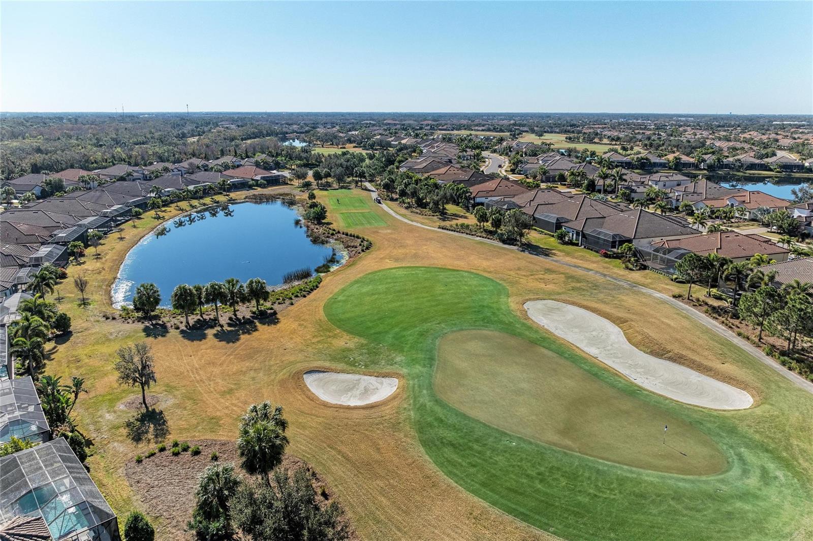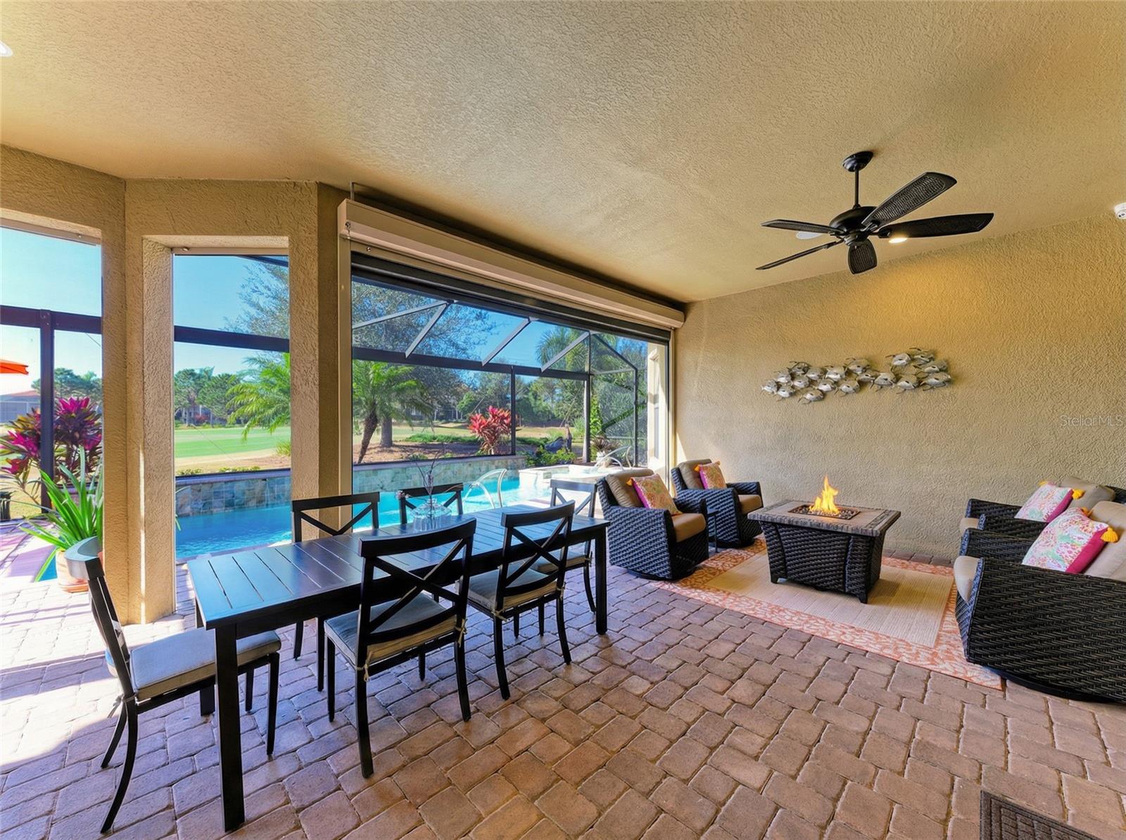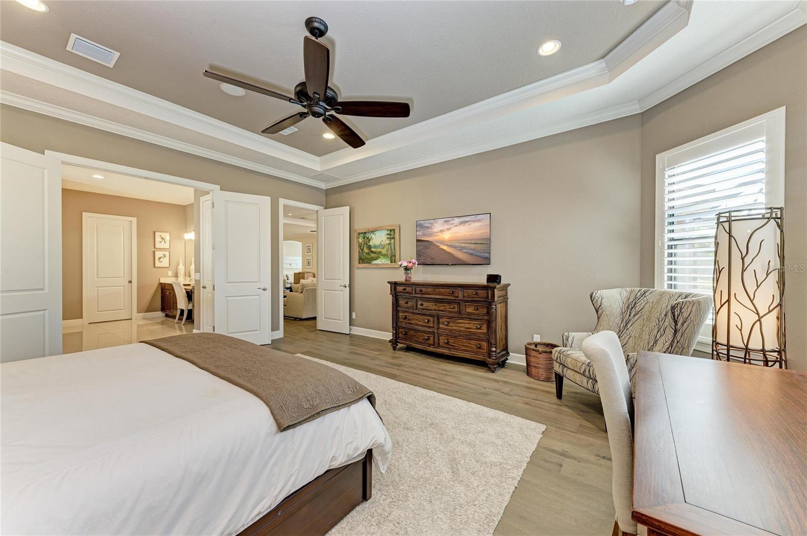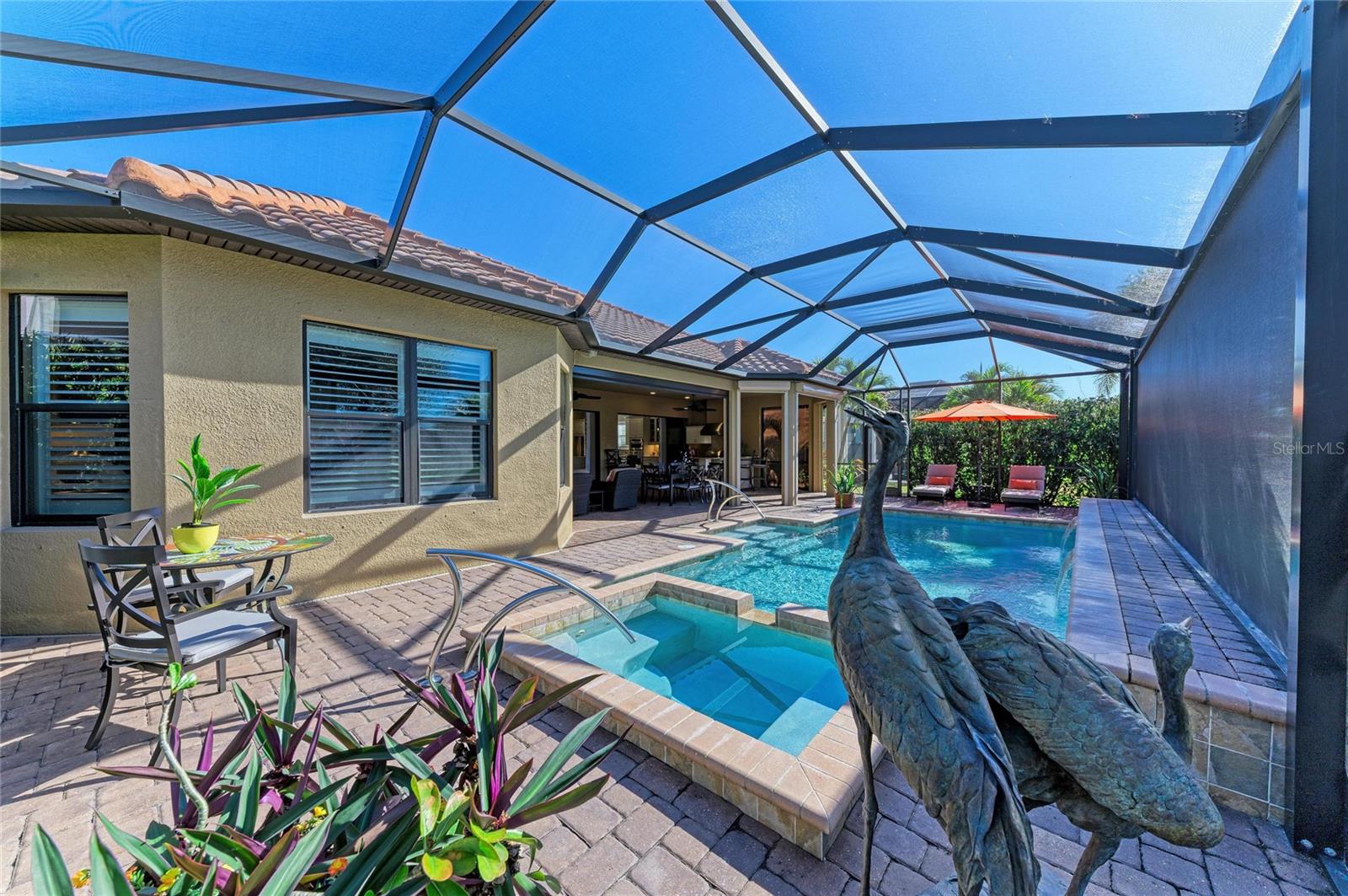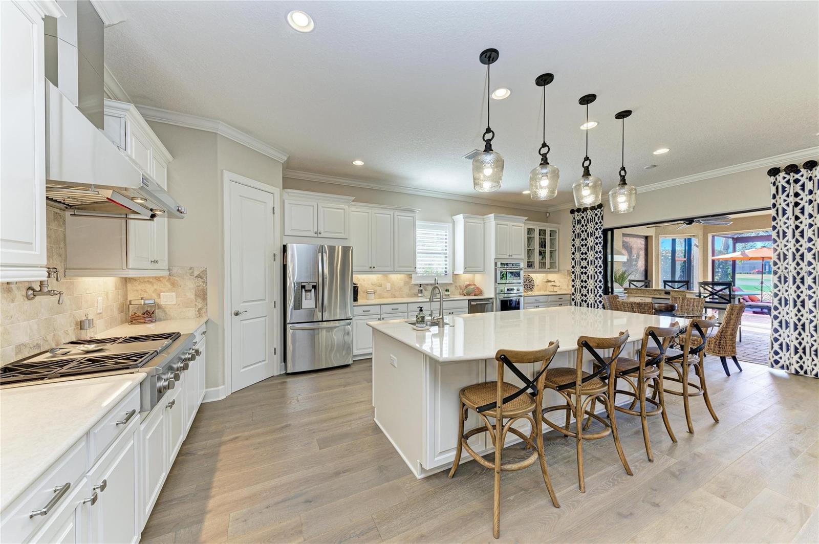 Experience resort-style living at its finest in the Highly sought after gated community of Esplanade at Lakewood Ranch. This beautifully upgraded Pallazio VII, is perfectly situated on a premium golf course view lot with sparkling heated saltwater pool & spa. Located on a quiet cul-de-sac street you will enjoy exceptional privacy with no homes directly across the street. This stunning property features a gated and paved courtyard entry. From the moment you arrive, the home impresses with decorative stacked stone accents, manicured landscaping, and elegant rustic double entry doors. Inside, a welcoming foyer opens to stunning wide-plank engineered hardwood flooring throughout the main living areas and study, with abundant natural light and a desirable open-concept design. At the heart of the home is the spacious gathering area, seamlessly connecting the living room, formal dining space, and an fabulous designer gourmet kitchen with upgraded breakfast nook extension. This chef's kitchen is a true showpiece, featuring a massive center island with Quartz countertops, breakfast bar with pendant lighting, 42-inch upper cabinets with crown molding, under-cabinet lighting, soft close drawers, upgraded stainless steel appliances, gas cooktop with pot filler, stainless vent hood, built-in microwave and oven, wine refrigerator, and closet pantry. Designed for seamless indoor-outdoor living, double pocket sliders open from both the living area and kitchen to the extended lanai. The outdoor oasis features a summer kitchen & bar with built in grill, sink, and refrigerator, generous covered seating areas, and a panoramic screened lanai, offering plenty of room for outdoor dining and entertaining. Relax in the heated saltwater pool and spa while enjoying peaceful golf course views. The remote-controlled privacy screen provides protection from sun, cooler weather, and added seclusion when desired. The elegant primary suite offers a private retreat with tray ceilings and an optional bay window for added space. The spa-like primary bath includes dual sinks with makeup/vanity area in between, a frameless glass walk-in shower with rain showerhead, private water closet, and an oversized custom walk-in closet with built-ins and separate "his & hers" areas. This thoughtfully designed 3-way split floor plan provides two additional guest bedrooms for comfort and privacy--one with an en-suite bath (second master). The spacious office/den offers the perfect space to work from home or relax. Additional upgrades include hurricane-impact front windows, hurricane shutters and motorized screens in lanai, outdoor surveillance system with front and rear cameras, 4' garage extension with acrylic-sealed floor, upgraded Quartz countertops in the kitchen and all bathrooms, upgraded engineered hardwood flooring. The owners spared no expense in creating this exceptional home. Located in the gated and highly desirable Esplanade Golf & Country Club, residents enjoy world-class amenities including an 18-hole championship private golf course (full golf membership included with this home), Barrel House Bistro Bar/Restaurant, tennis, pickleball, bocce ball, spa and salon services, state-of-the-art fitness center, resort-style pools, cabanas, fire pits, and the popular Bahama Bar & Restaurant for casual poolside dining and handcrafted cocktails. Lawn care is fully maintained by the community association. This home shows like a model and delivers the Ultimate Florida lifestyle!