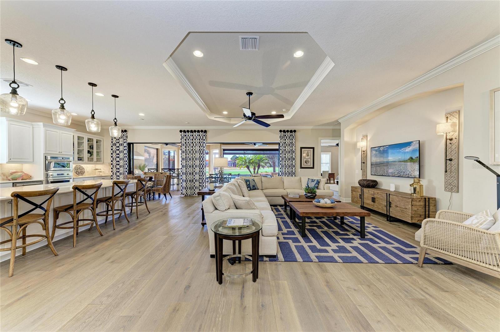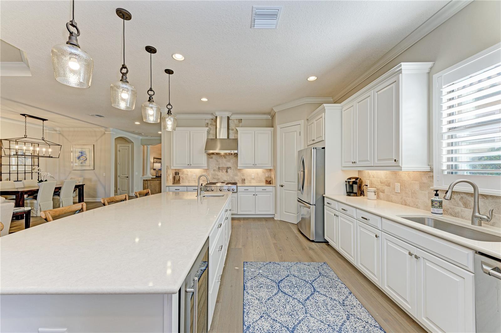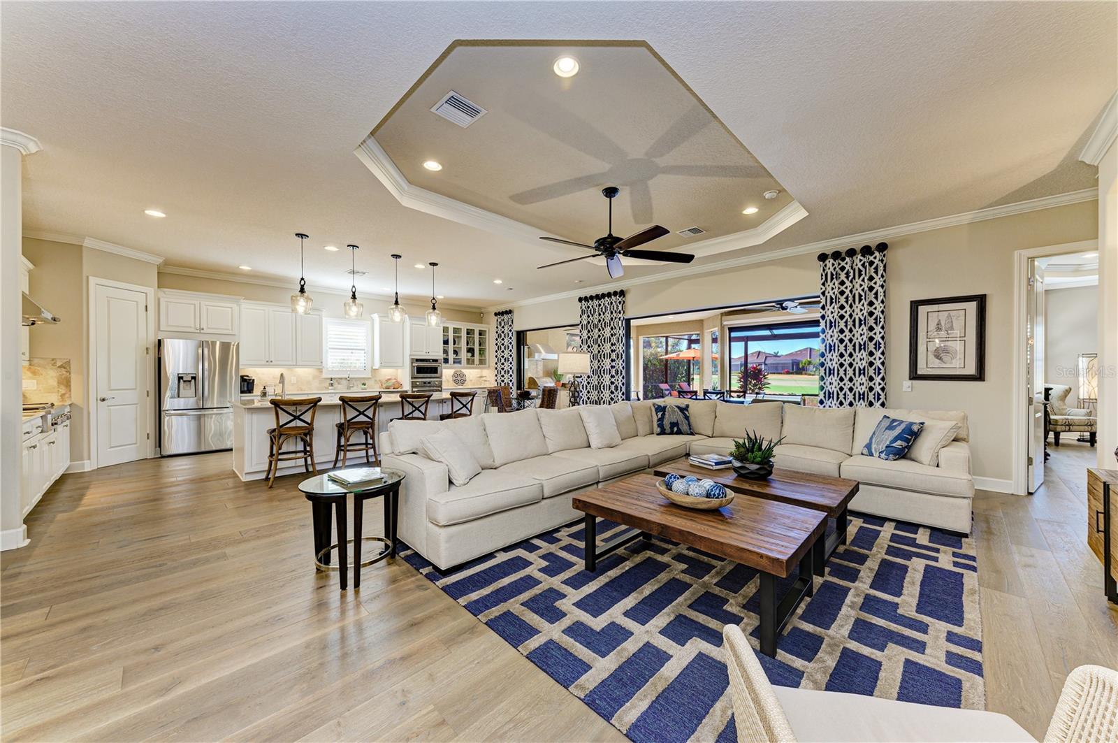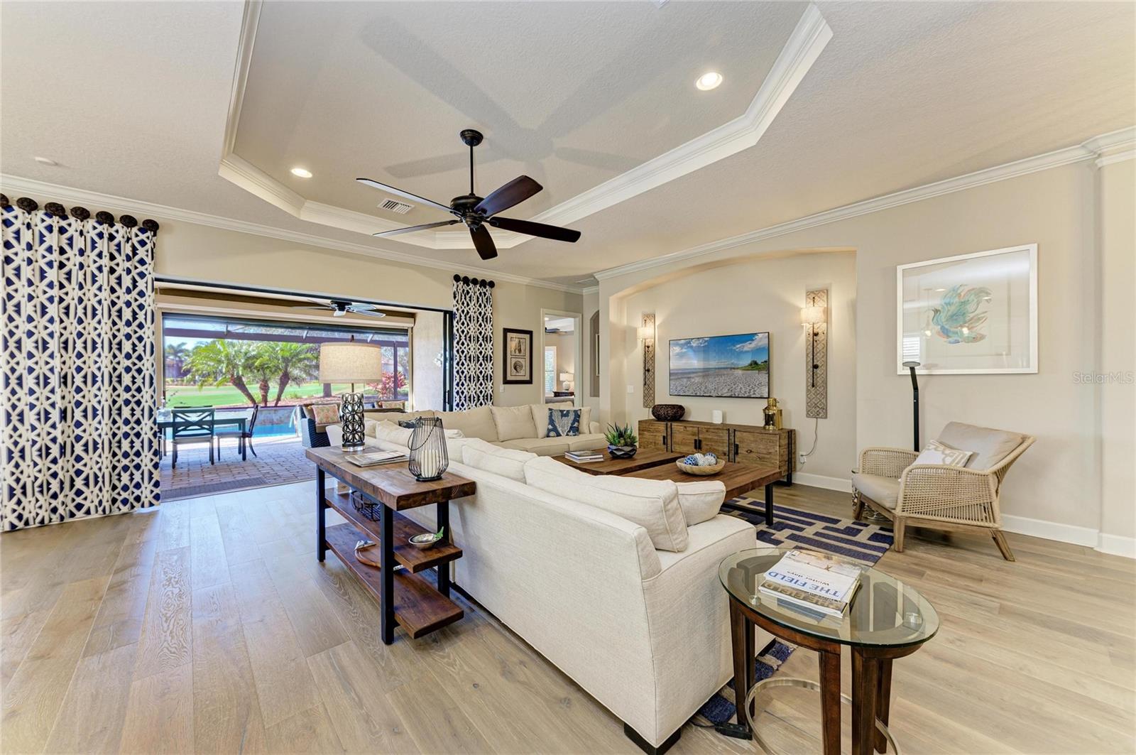 Experience resort-style living at its finest in the Highly sought after gated community of Esplanade at Lakewood Ranch. This beautifully upgraded Pallazio VII, is perfectly situated on a premium golf course view lot with sparkling heated saltwater pool & spa. Located on a quiet cul-de-sac street you will enjoy exceptional privacy with no homes directly across the street. This stunning property features a gated and paved courtyard entry. From the moment you arrive, the home impresses with decorative stacked stone accents, manicured landscaping, and elegant rustic double entry doors. Inside, a welcoming foyer opens to stunning wide-plank engineered hardwood flooring throughout the main living areas and study, with abundant natural light and a desirable open-concept design. At the heart of the home is the spacious gathering area, seamlessly connecting the living room, formal dining space, and an fabulous designer gourmet kitchen with upgraded breakfast nook extension. This chef's kitchen is a true showpiece, featuring a massive center island with Quartz countertops, breakfast bar with pendant lighting, 42-inch upper cabinets with crown molding, under-cabinet lighting, soft close drawers, upgraded stainless steel appliances, gas cooktop with pot filler, stainless vent hood, built-in microwave and oven, wine refrigerator, and closet pantry. Designed for seamless indoor-outdoor living, double pocket sliders open from both the living area and kitchen to the extended lanai. The outdoor oasis features a summer kitchen & bar with built in grill, sink, and refrigerator, generous covered seating areas, and a panoramic screened lanai, offering plenty of room for outdoor dining and entertaining. Relax in the heated saltwater pool and spa while enjoying peaceful golf course views. The remote-controlled privacy screen provides protection from sun, cooler weather, and added seclusion when desired. The elegant primary suite offers a private retreat with tray ceilings and an optional bay window for added space. The spa-like primary bath includes dual sinks with makeup/vanity area in between, a frameless glass walk-in shower with rain showerhead, private water closet, and an oversized custom walk-in closet with built-ins and separate "his & hers" areas. This thoughtfully designed 3-way split floor plan provides two additional guest bedrooms for comfort and privacy--one with an en-suite bath (second master). The spacious office/den offers the perfect space to work from home or relax. Additional upgrades include hurricane-impact front windows, hurricane shutters and motorized screens in lanai, outdoor surveillance system with front and rear cameras, 4' garage extension with acrylic-sealed floor, upgraded Quartz countertops in the kitchen and all bathrooms, upgraded engineered hardwood flooring. The owners spared no expense in creating this exceptional home. Located in the gated and highly desirable Esplanade Golf & Country Club, residents enjoy world-class amenities including an 18-hole championship private golf course (full golf membership included with this home), Barrel House Bistro Bar/Restaurant, tennis, pickleball, bocce ball, spa and salon services, state-of-the-art fitness center, resort-style pools, cabanas, fire pits, and the popular Bahama Bar & Restaurant for casual poolside dining and handcrafted cocktails. Lawn care is fully maintained by the community association. This home shows like a model and delivers the Ultimate Florida lifestyle!