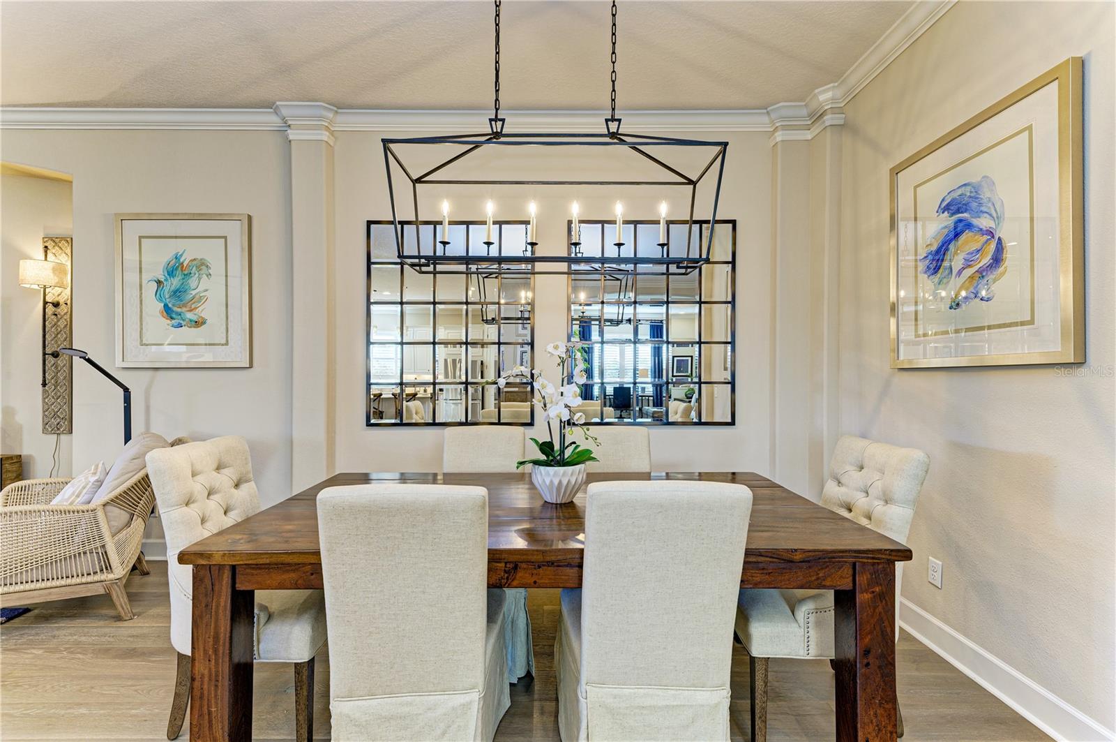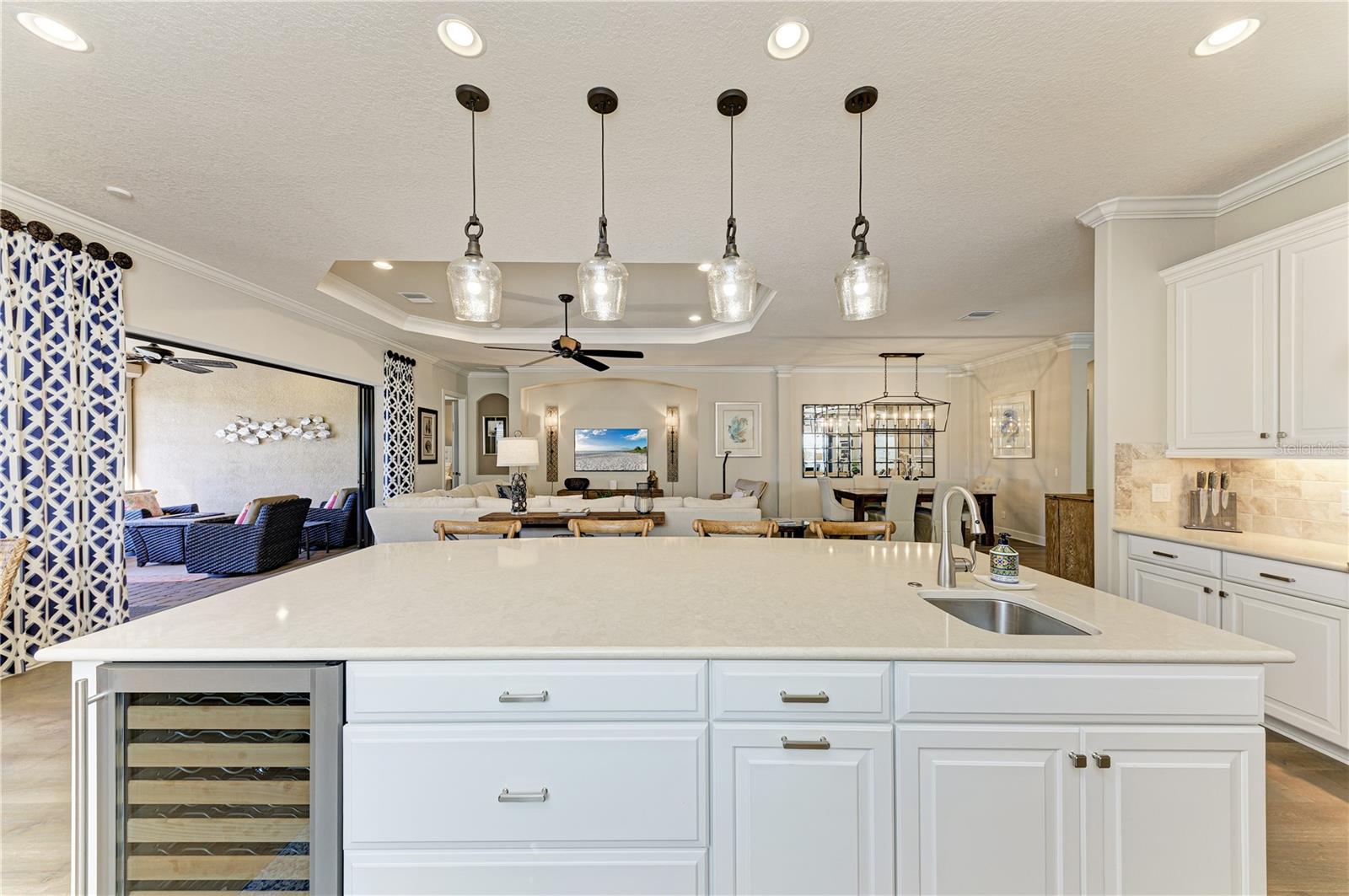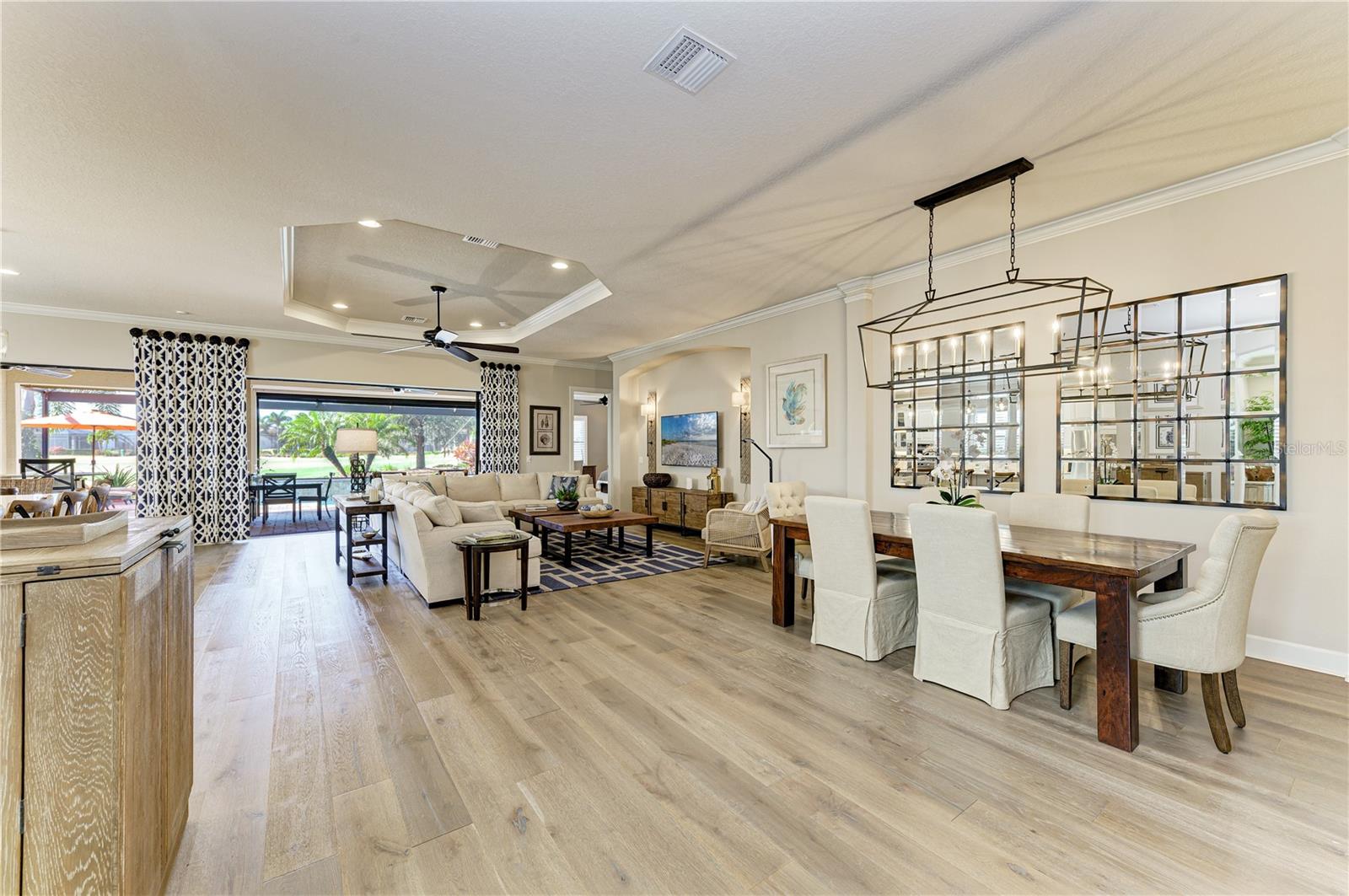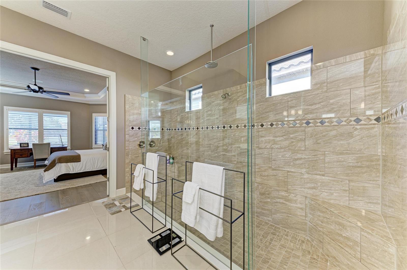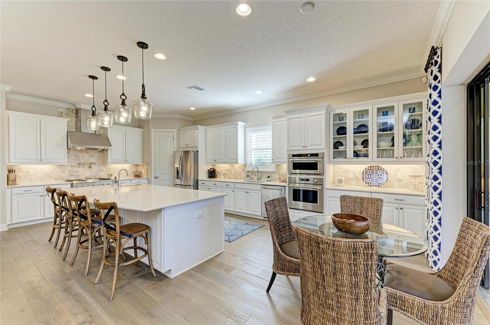 Experience resort-style living at its finest in the Highly sought after gated community of Esplanade at Lakewood Ranch. This beautifully upgraded Pallazio VII, is perfectly situated on a premium golf course view lot with sparkling heated saltwater pool & spa. Located on a quiet cul-de-sac street you will enjoy exceptional privacy with no homes directly across the street. This stunning property features a gated and paved courtyard entry. From the moment you arrive, the home impresses with decorative stacked stone accents, manicured landscaping, and elegant rustic double entry doors. Inside, a welcoming foyer opens to stunning wide-plank engineered hardwood flooring throughout the main living areas and study, with abundant natural light and a desirable open-concept design. At the heart of the home is the spacious gathering area, seamlessly connecting the living room, formal dining space, and an fabulous designer gourmet kitchen with upgraded breakfast nook extension. This chef's kitchen is a true showpiece, featuring a massive center island with Quartz countertops, breakfast bar with pendant lighting, 42-inch upper cabinets with crown molding, under-cabinet lighting, soft close drawers, upgraded stainless steel appliances, gas cooktop with pot filler, stainless vent hood, built-in microwave and oven, wine refrigerator, and closet pantry. Designed for seamless indoor-outdoor living, double pocket sliders open from both the living area and kitchen to the extended lanai. The outdoor oasis features a summer kitchen & bar with built in grill, sink, and refrigerator, generous covered seating areas, and a panoramic screened lanai, offering plenty of room for outdoor dining and entertaining. Relax in the heated saltwater pool and spa while enjoying peaceful golf course views. The remote-controlled privacy screen provides protection from sun, cooler weather, and added seclusion when desired. The elegant primary suite offers a private retreat with tray ceilings and an optional bay window for added space. The spa-like primary bath includes dual sinks with makeup/vanity area in between, a frameless glass walk-in shower with rain showerhead, private water closet, and an oversized custom walk-in closet with built-ins and separate "his & hers" areas. This thoughtfully designed 3-way split floor plan provides two additional guest bedrooms for comfort and privacy--one with an en-suite bath (second master). The spacious office/den offers the perfect space to work from home or relax. Additional upgrades include hurricane-impact front windows, hurricane shutters and motorized screens in lanai, outdoor surveillance system with front and rear cameras, 4' garage extension with acrylic-sealed floor, upgraded Quartz countertops in the kitchen and all bathrooms, upgraded engineered hardwood flooring. The owners spared no expense in creating this exceptional home. Located in the gated and highly desirable Esplanade Golf & Country Club, residents enjoy world-class amenities including an 18-hole championship private golf course (full golf membership included with this home), Barrel House Bistro Bar/Restaurant, tennis, pickleball, bocce ball, spa and salon services, state-of-the-art fitness center, resort-style pools, cabanas, fire pits, and the popular Bahama Bar & Restaurant for casual poolside dining and handcrafted cocktails. Lawn care is fully maintained by the community association. This home shows like a model and delivers the Ultimate Florida lifestyle!