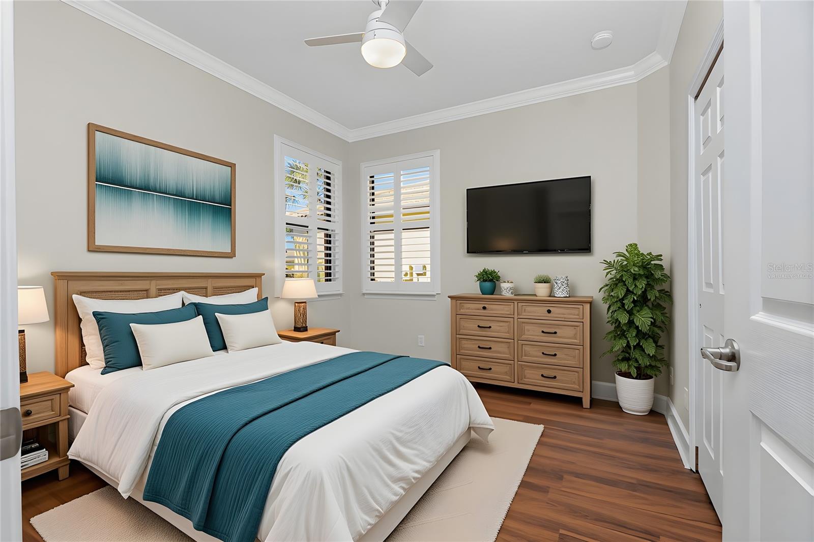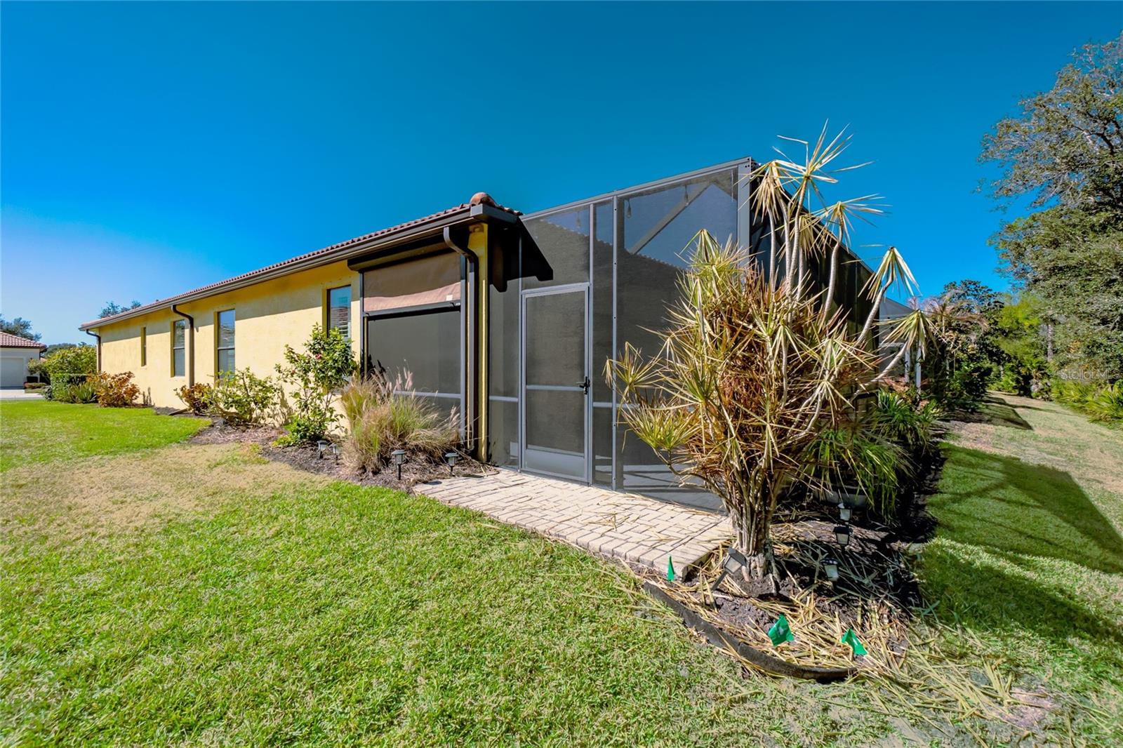 Exterior: Hurricane Shutters, Rain Gutters, Shade Shutter(s), Sidewalk, Sliding Doors