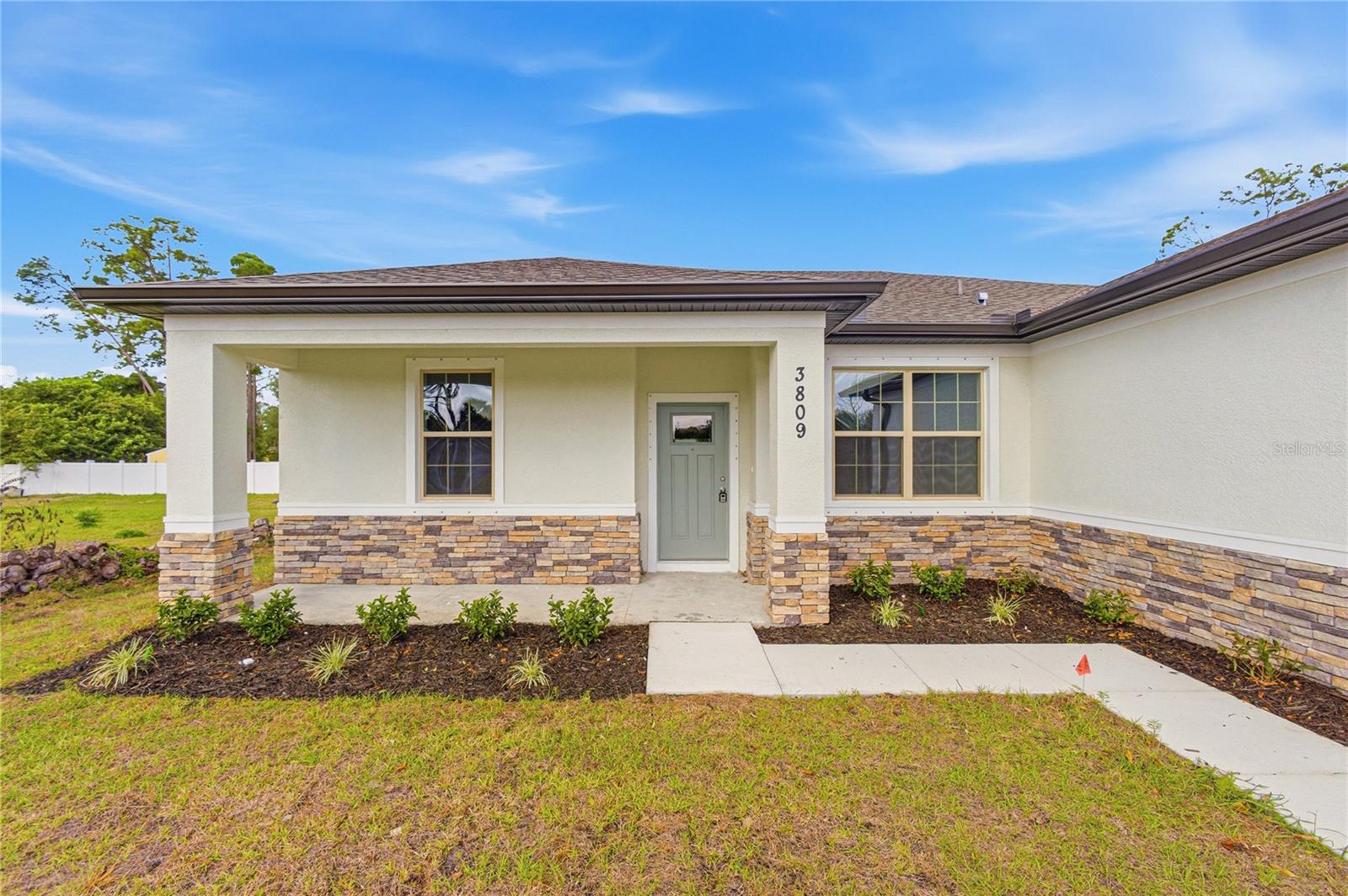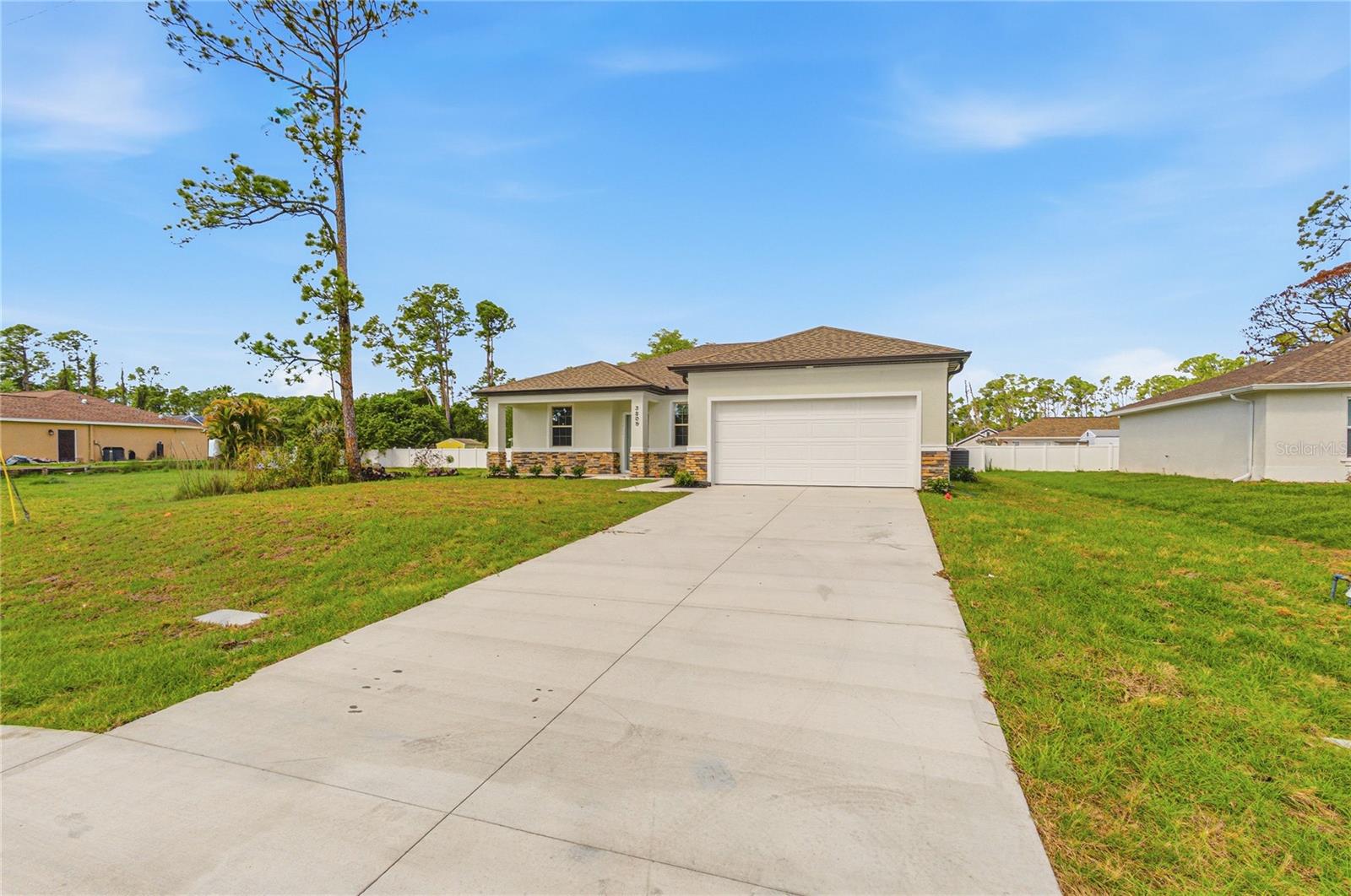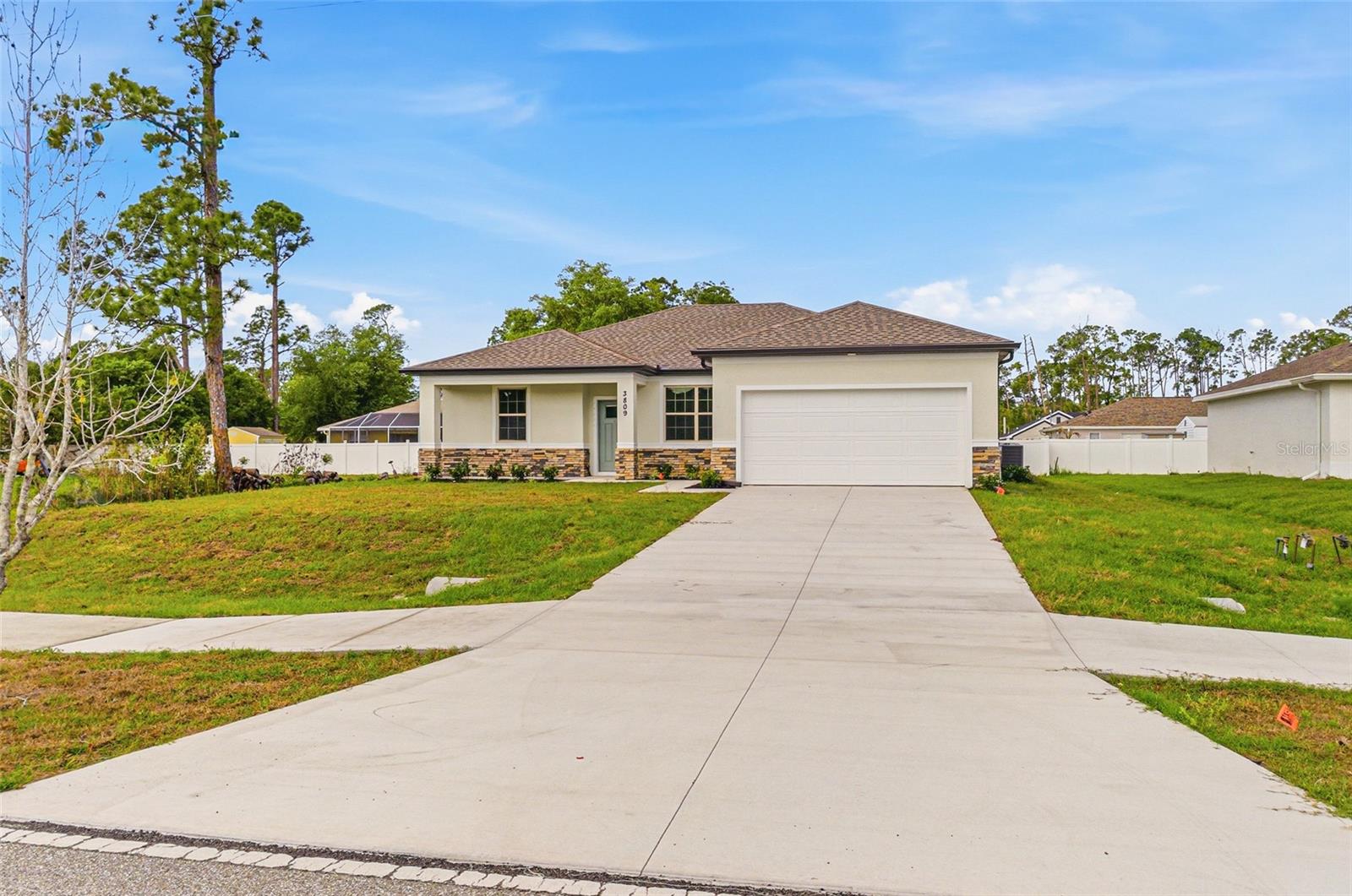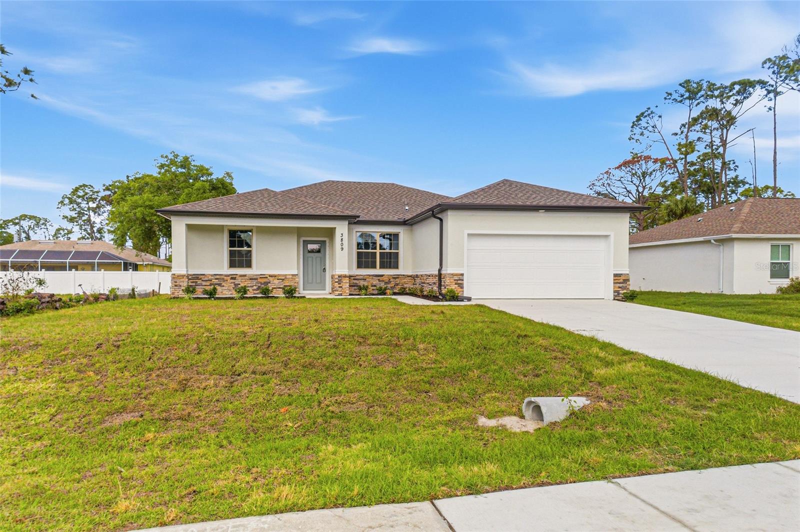 Great price with luxury features and ready now! A newly constructed home with city water and septic system in North Port, with no HOA fees! Great location for quick access to schools, the city center, medical conveniences, parks and the highway. North Salford is not in a high traffic area and only has side streets. This affordable new home is ready for you and is just what you've been looking for! This home has 9'4" tall ceilings, a nice and open layout with a versatile floor plan. The house features 4 bedrooms, 2 full bathrooms, dining room, a living room, an open kitchen and a 2-car garage with 1810 square feet of living space. The living space is well-utilized with high ceilings and many windows providing natural light. The interior features will provide you with the quality and luxury you were looking for in your new home. This home has a split floor plan with the primary suite on one side of the home and the guest bedrooms on the other. The primary bedroom has a tray ceiling and large windows that let in natural light. You'll also enjoy a resort-style bathroom with a spacious walk-in shower with floor-to-ceiling tiled walls and a glass enclosure. It also features a linen closet, double vanity and a large walk-in closet. The living room features large windows and several LED fixtures providing plenty of light with access to the covered lanai. The living room is open to the kitchen, where you'll find a huge center island with extra seating for casual dining and plenty of cabinets. The kitchen features stainless steel appliances, Shaker-style cabinets with crown molding, decorative hardware, subway tile backsplash and granite countertops. The dining room is located at the front of the house, with large windows allowing for plenty of natural light. The home includes luxury vinyl plank flooring in the main living areas and bathrooms for durability and comfort. You'll love these floors! They are easy to maintain and offer a modern design, perfect for new homes. Other features include the same beautiful Shaker-style cabinets with hardware and granite countertops in the bathrooms, 5-inch baseboards, a garage door opener, gutters on the exterior, R38 insulation, a 16 SEER HVAC and much more. Visit our model center and compare the features and quality with other homes and you'll see the difference. We make buying easy for you!