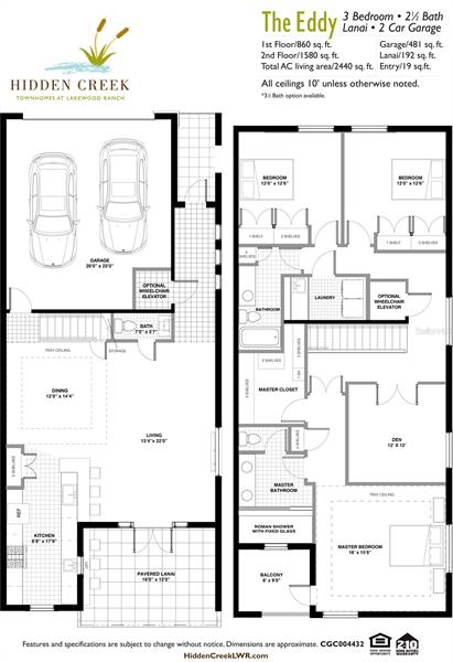 Under Construction. Sales Center open daily 10-5pm and by appointment. $10,000 in free options! Hidden Creek at Lakewood Ranch is under construction with more than half the community sold out and no CDD. This two-story, steel reinforced concrete block "Eddy Model," luxury townhome has three bedrooms, two and a half baths, and a 2-car garage. It offers hurricane rated, energy efficient solar glass windows and doors, an upgraded garage door, 8' foot doors and 10' ceilings on the first and second floors, and sound- moisture- and fire-resistant separation walls, which are used to design high-end hotels. Moisture barriers and foam-sealed attics prevent water intrusion. Other features include: 42" cabinets, GE Profile appliances, double sinks, and LED recess lighting. Optional elevator provides easy access and convenience. Take advantage of pre-construction and choose the colors and upgrades of your paradise home or move into one of the models immediately!Pictures, photographs, colors, features, and sizes are for illustration purposes only and will vary from the homes as built. Home and community information including pricing, included features, terms, availability and amenities are subject to change and prior sale at any time without notice or obligation. Model Home Hours are as follows: Monday-Sunday 10-5pm.